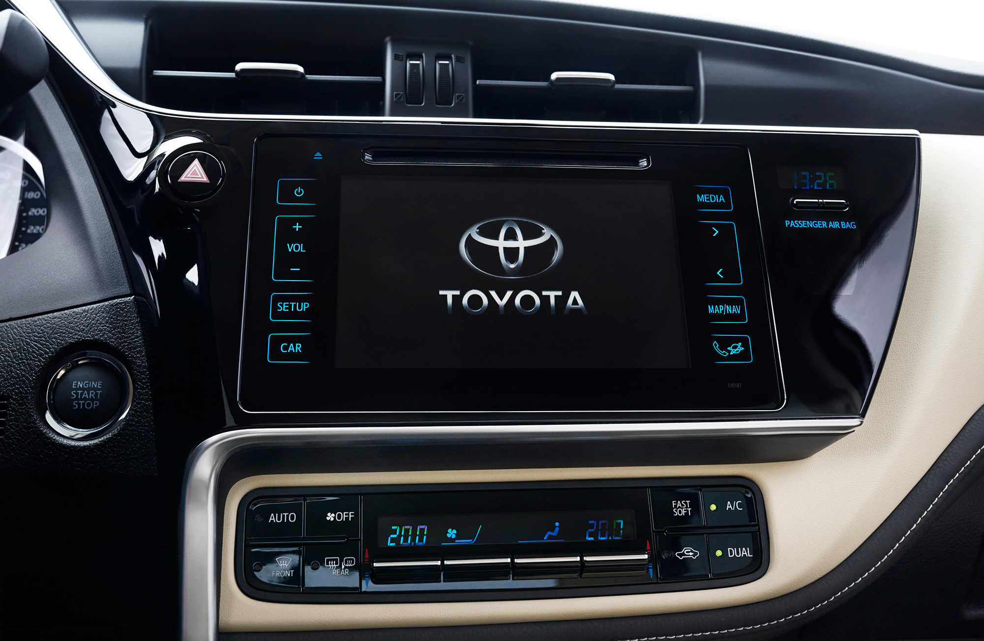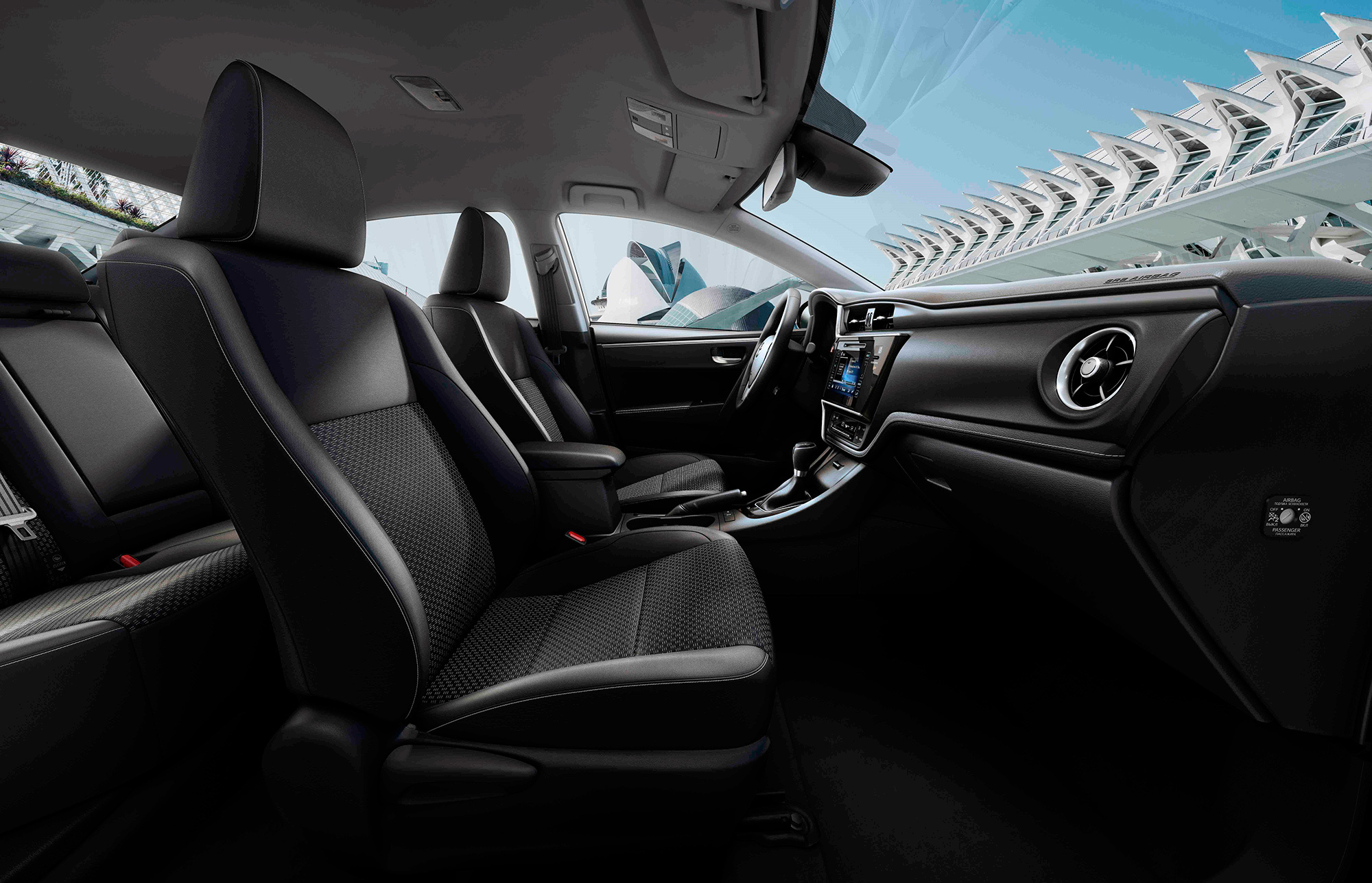 После модернизации у Короллы в салоне есть не только доводчики на стёклах всех четырёх дверей, но и подсветка всех кнопок, включая блок регулировки боковых зеркал и клавиш на дверях. Материалы отделки улучшились, причём заметно. Податливого пластика стало больше, на передней и дверных панелях в дорогих версиях появились тканевые вставки с контрастной прострочкой. Лоска добавили металлизированные панели на центральной консоли, новый блок управления климат-контролем с качающимися клавишами в стиле Мерседеса и более крупный дисплей мультимедийной системы с сенсорными кнопками.