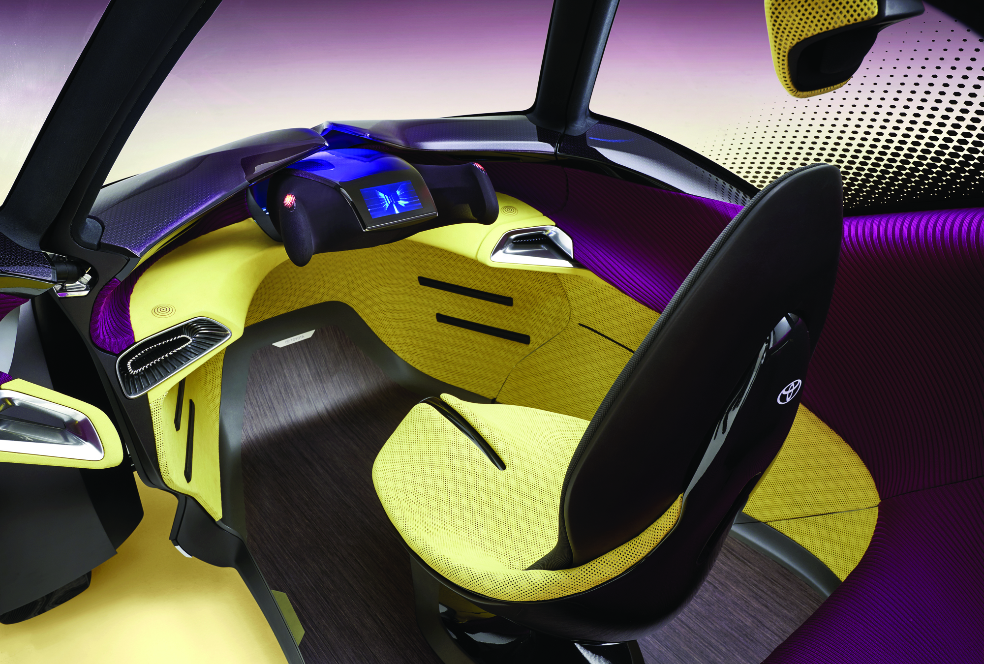 Водительское кресло приветственно (или прощально) поворачивается на 20 градусов. Педалей и селектора трансмиссии нет, как и привычного руля. Его роль играет двуручный контроллер с сенсорным дисплеем. Для ускорения и торможения нужно нажимать кнопки на штурвале. Управление машиной происходит «по проводам». Взаимодействие с искусственным интеллектом — голосовое. В автономном режиме индикаторы на передней панели заранее показывают, в какую сторону будет наклоняться i-TRIL в повороте.