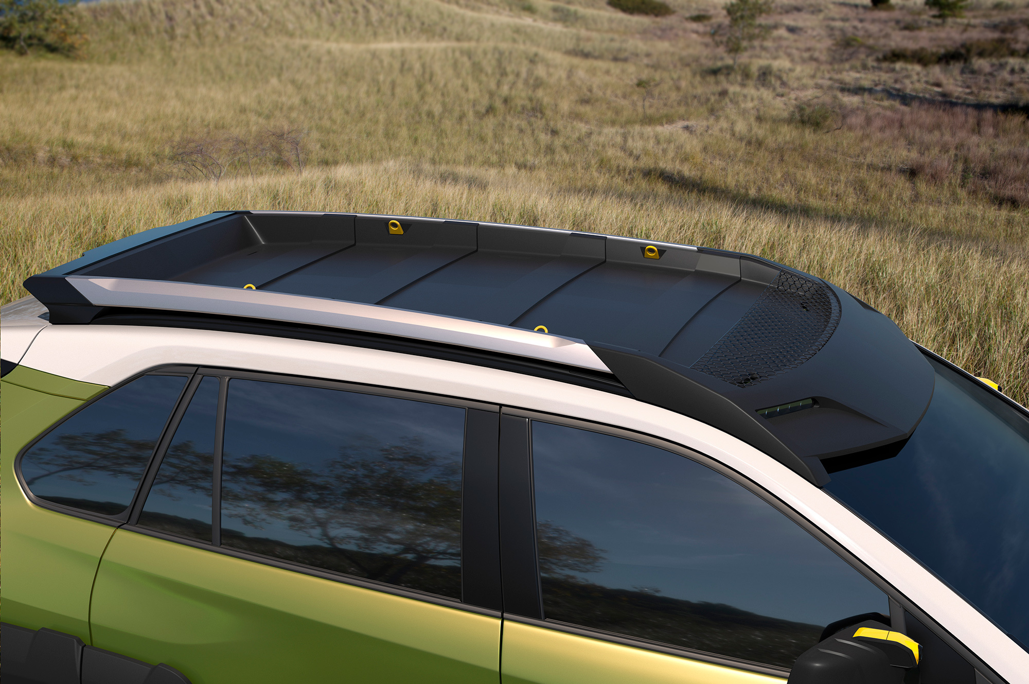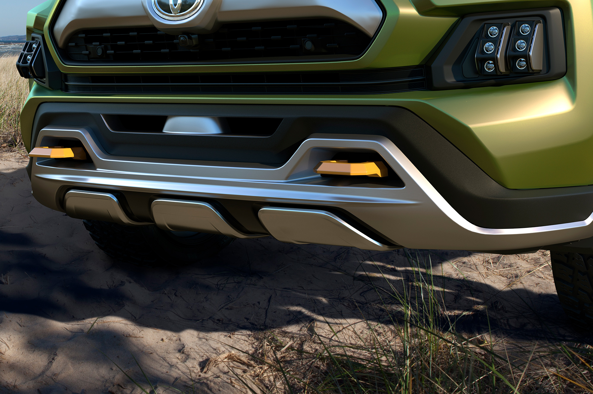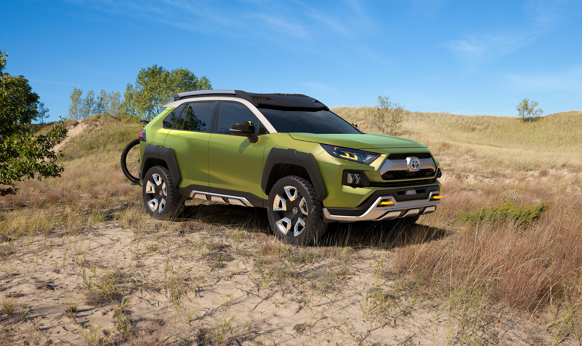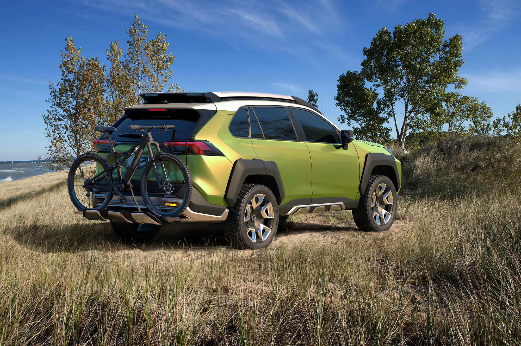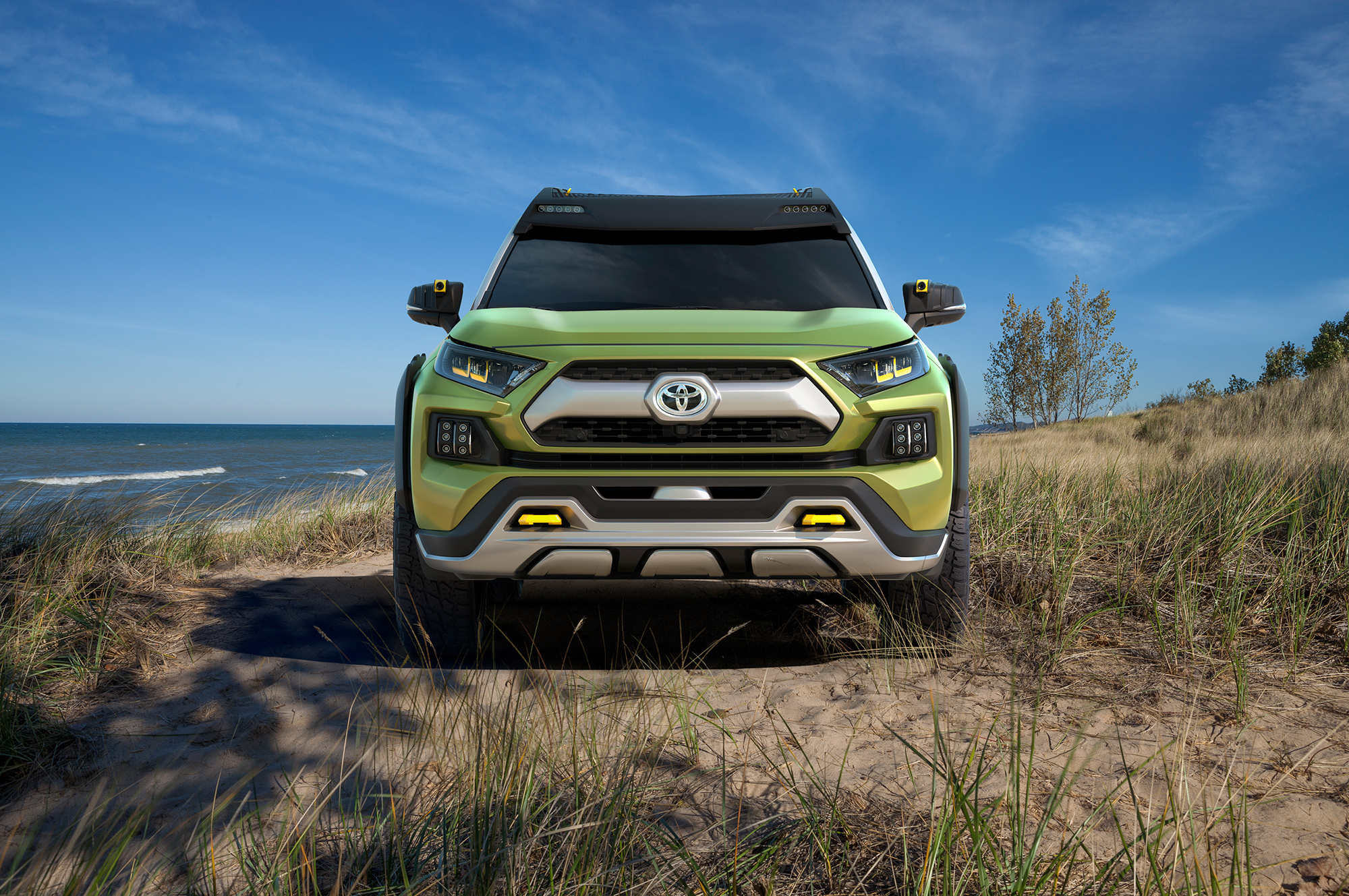 Противотуманки у концепта съёмные. Их можно взять с собой как фонарики или поставить на велик вместо фары. Но главным достоинством создатели считают фото- и видеосъёмку приключений посредством инфракрасных камер в боковых зеркалах, причём светодиодные полоски на крыше играют роль вспышки. Полученные кадры через встроенную точку доступа к Wi-Fi автоматически загружаются в облачное хранилище готовыми к редактированию в реальном времени и публикации в соцсетях. «Все путешествия будут задокументированы», — гордится Toyota, решившая не показывать салон шоу-кара.