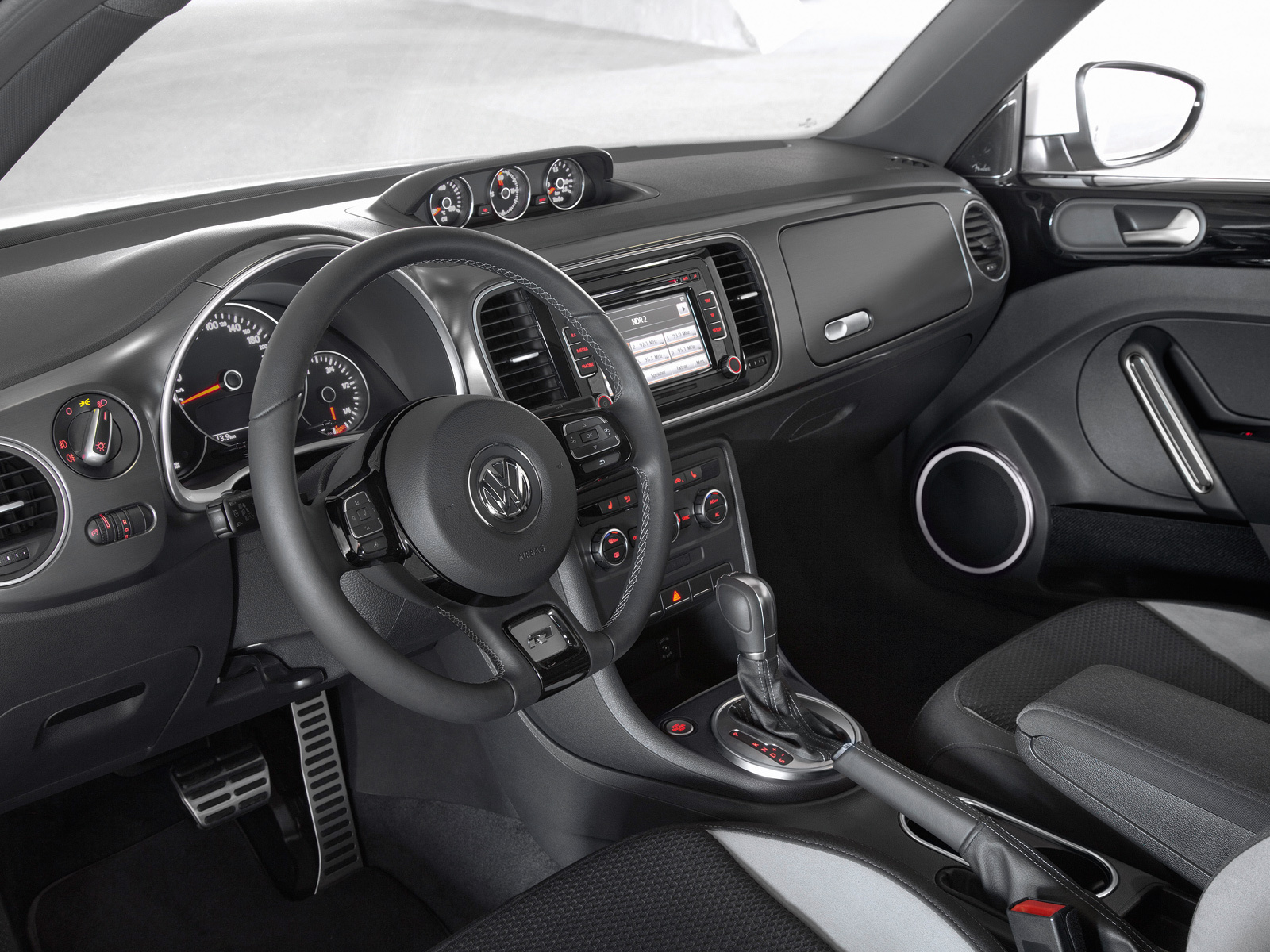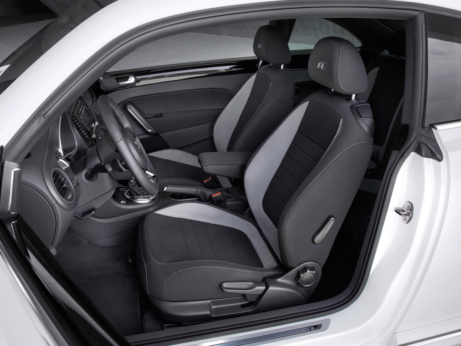 Эрлайнизация интерьера Битла вылилась в спортивные кресла, передние подголовники со знаком R-Line, кожаную отделку руля, селектора коробки и ручника с декоративными швами плюс в ещё какие-то декоративные вставки. В Фольксвагене уверены, что оба дизайнерских пакета будут шикарно смотреться с любым из двенадцати цветов, в которых доступен новый Beetle.