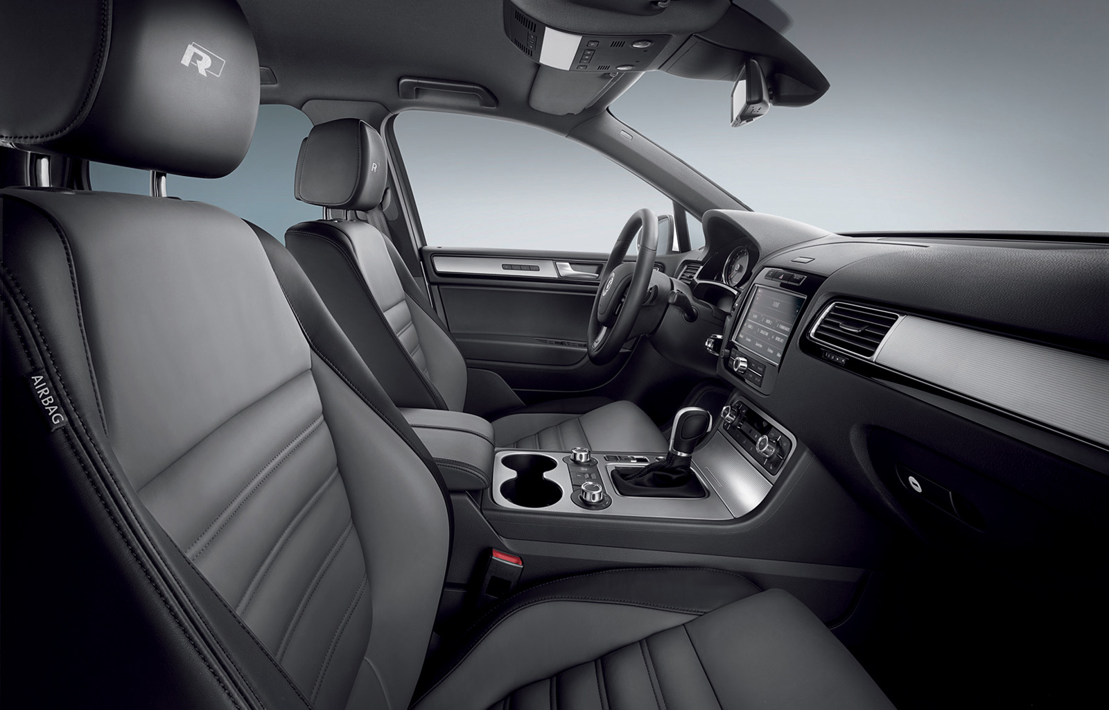 Внутри такой Тигуан выделяется металлизированной отделкой приборной панели и дверей, спортивным мультирулём R-Line со скошенным по хорде низом и подрулевыми лепестками, накладками на пороги из нержавеющей стали R-Line и алюминиевыми спортивными педалями. Кроме того, для данного автомобиля можно заказать премиальную аудиосистему Fender (10 каналов, 400 ватт, восемь динамиков и сабвуфер).