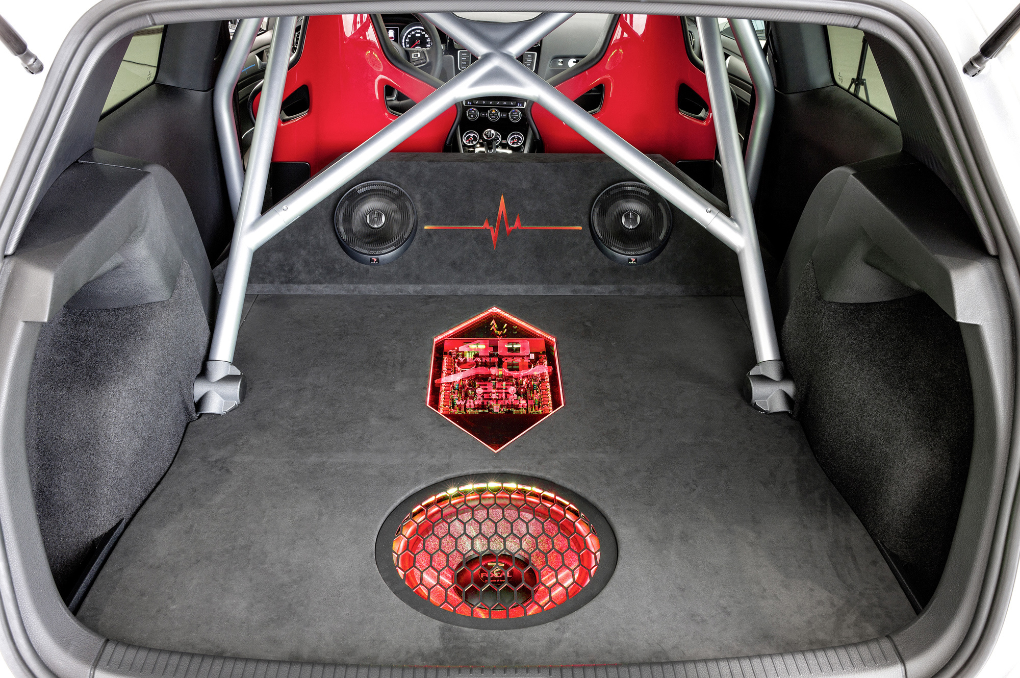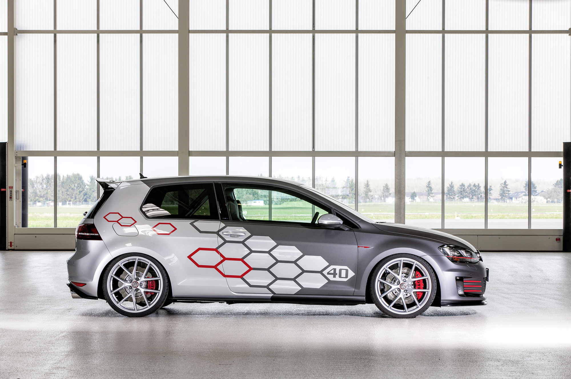 Помимо форсированного агрегата любому фестивальному Гольфу непременно полагаются дизайнерские фишки. В данном случае это сочетание основной окраски Reflex Silver c тёмно-серой плёнкой, сотами цвета Tornado Red и алюминиевыми колёсными дисками фирмы BBS (20 дюймов) в оригинальной окраске.