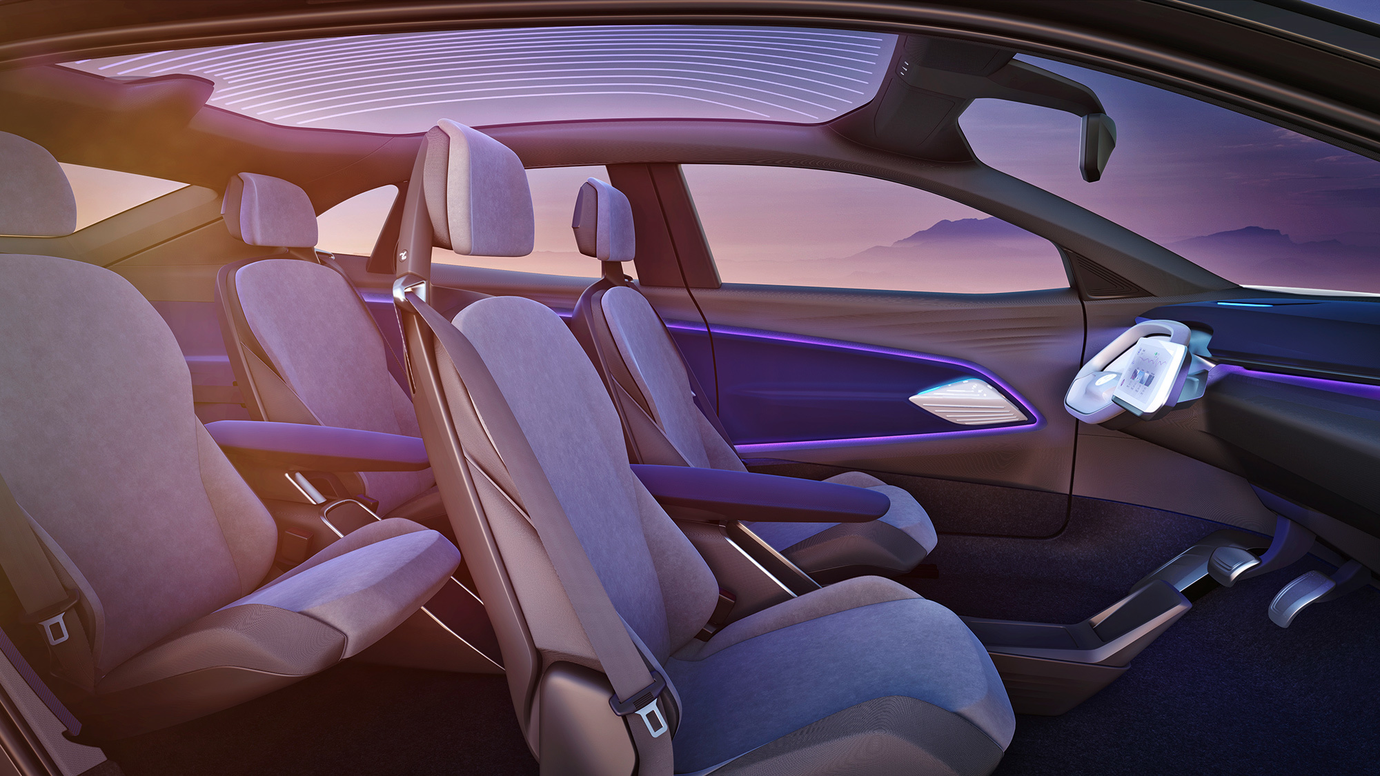 Внутри разработчики постарались передать атмосферу гостиной типа Open Space с переставляемой мебелью, то есть трансформируемыми креслами. Система CleanAir с мощным фильтром постоянно следит за качеством воздуха в салоне, отражая его параметры на центральном экране. Водитель и передний пассажир могут выбрать одну из нескольких заранее запрограммированных настроек климатической установки (от температуры до уровня влажности). Вместе с скоростным выходом в Сеть это создаёт расслабляющую атмосферу. Дополненная реальность на лобовом стекле тут тоже в тему: можно будет получать, например, информацию о придорожной инфраструктуре или достопримечательностях.