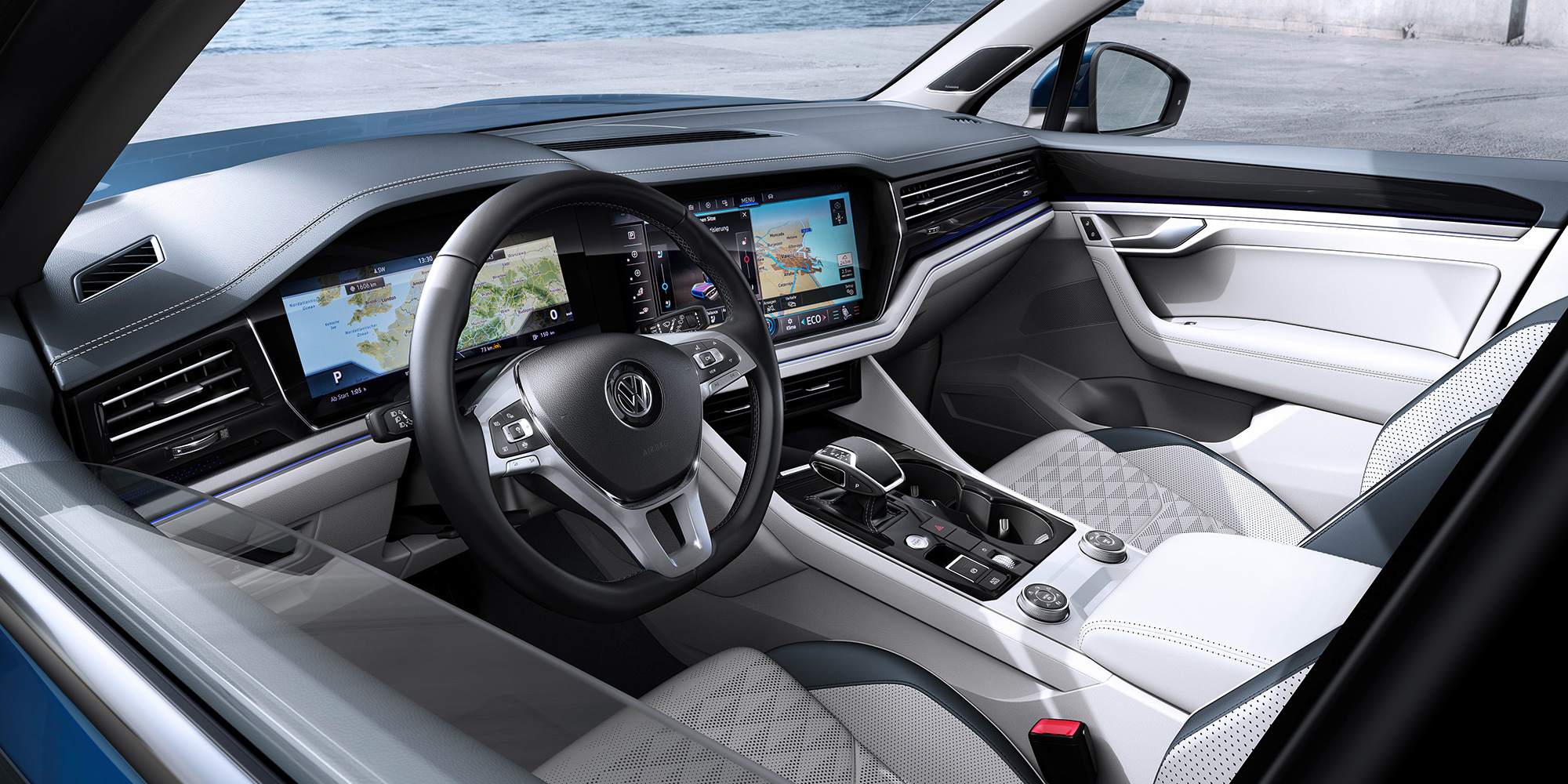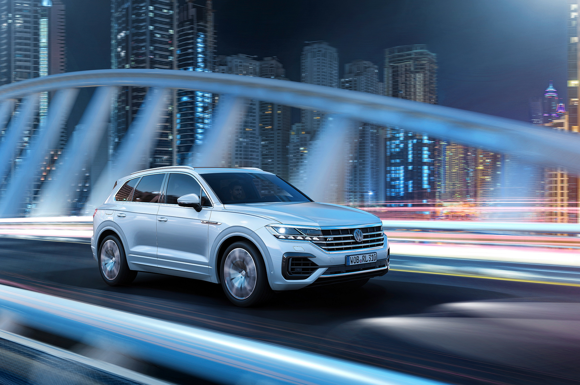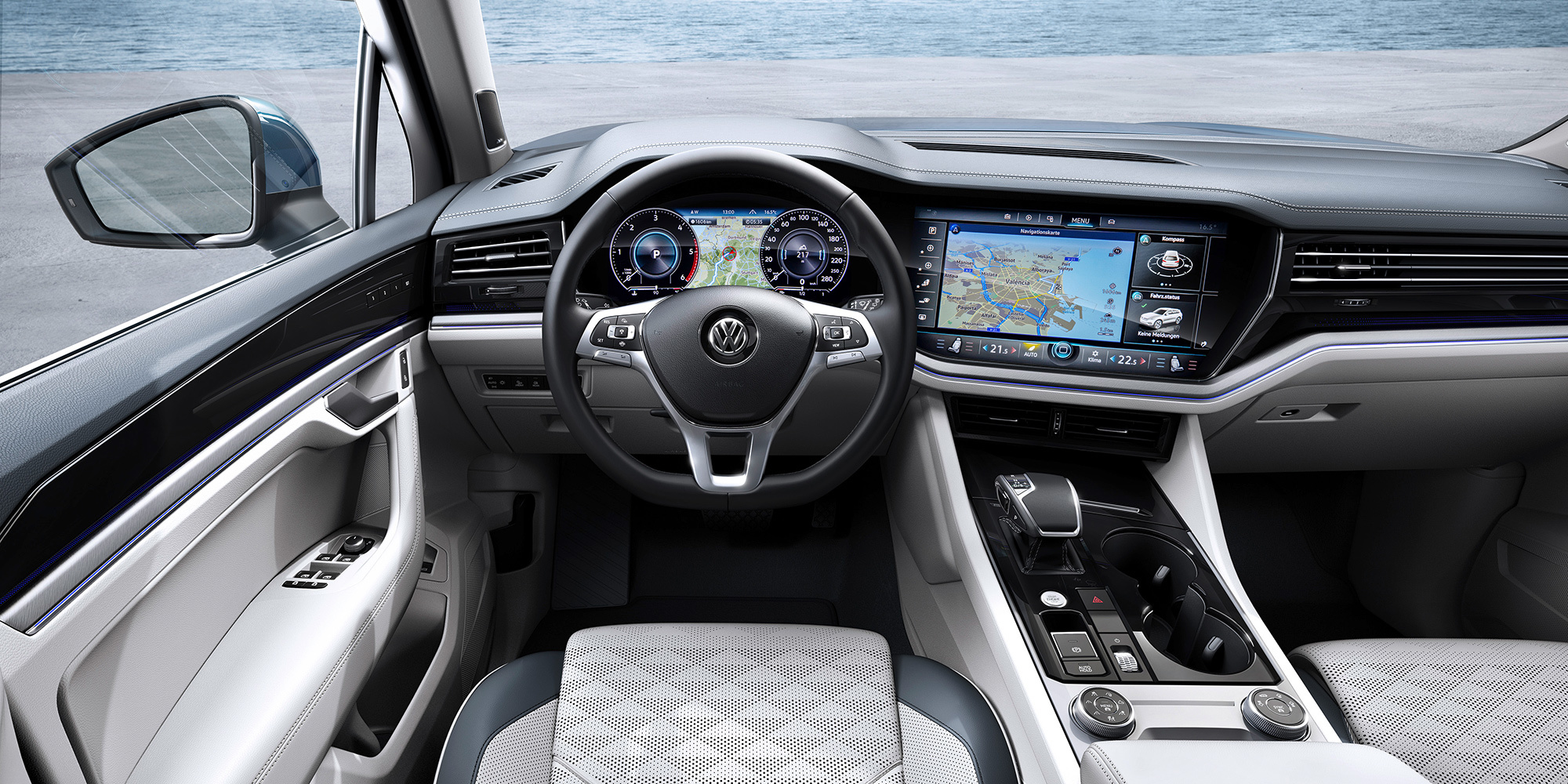 В плюсах новичка: система ночного видения, кресла с массажем, проекционный дисплей на лобовом стекле и цифровой кокпит нового поколения с парой экранов, соединённых стык в стык... Распределением момента (на переднюю ось может быть отправлено до 70% тяги, а на заднюю до 80%) занимается дифференциал типа Torsen. Понижающего ряда поклонники модели недосчитались, как и блокировки сзади. Зато смена платформы ознаменовалась экономией массы в центнер с лишним. Новый кузов Туарега на 106 кг легче предыдущего, он на 52% состоит из высокопрочных сталей и на 48% — из алюминиевых сплавов.
