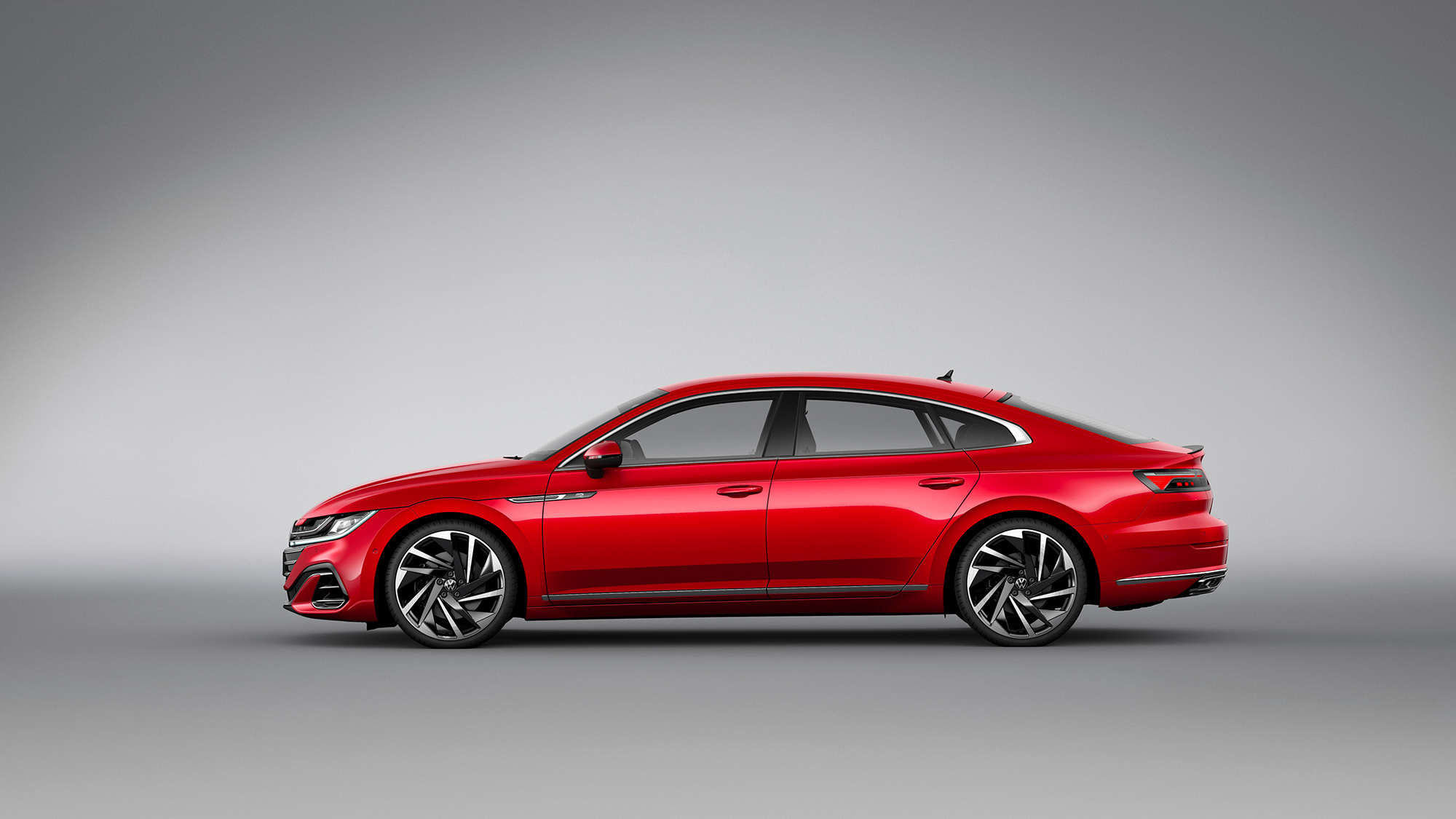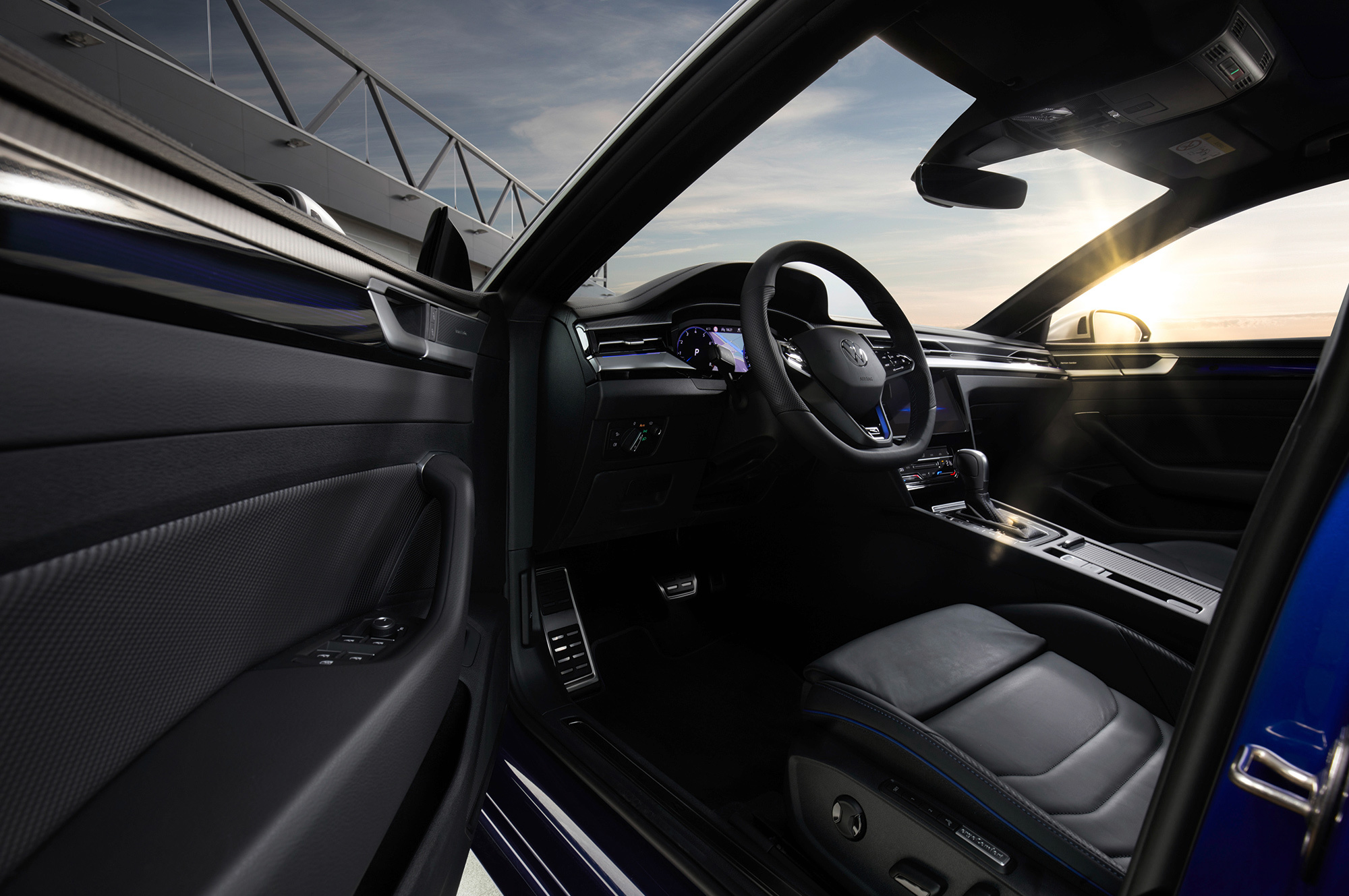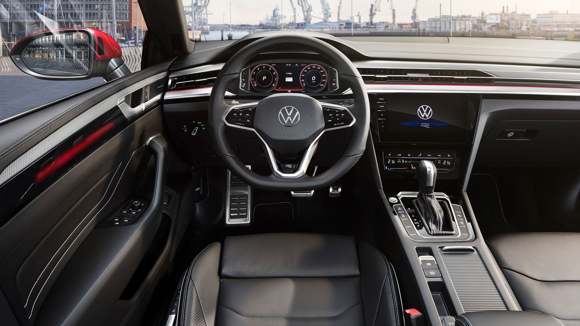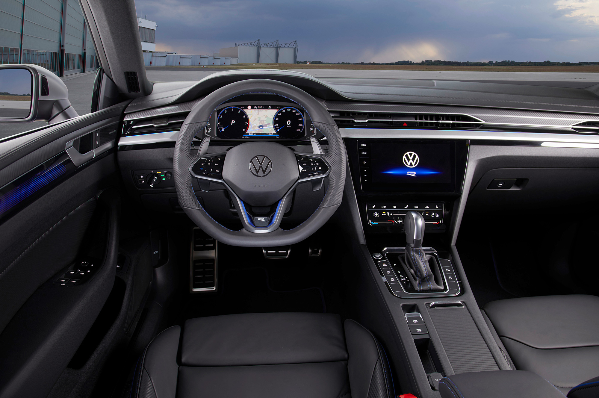А для тех, кто не прочь пожечь бензин, немцы предложили «заряженную» модель Volkswagen Arteon R. От менее быстрых собратьев её отличает более агрессивная внешность, декор в салоне и спортивные кресла, заниженная подвеска и улучшенные тормоза с крупными суппортами. Силовой агрегат — раскачанный до 320 сил мотор 2.0 TSI EA888 (420 Н•м) и семиступенчатый «робот». Привод у «эрок» изначально полный, но трансмиссия дополнена функцией R-Performance Torque Vectoring. С её помощью электроника имитирует работу заднего активного дифференциала, распределяя тягу между задними колёсами. Скоростные характеристики пока держатся в тайне.