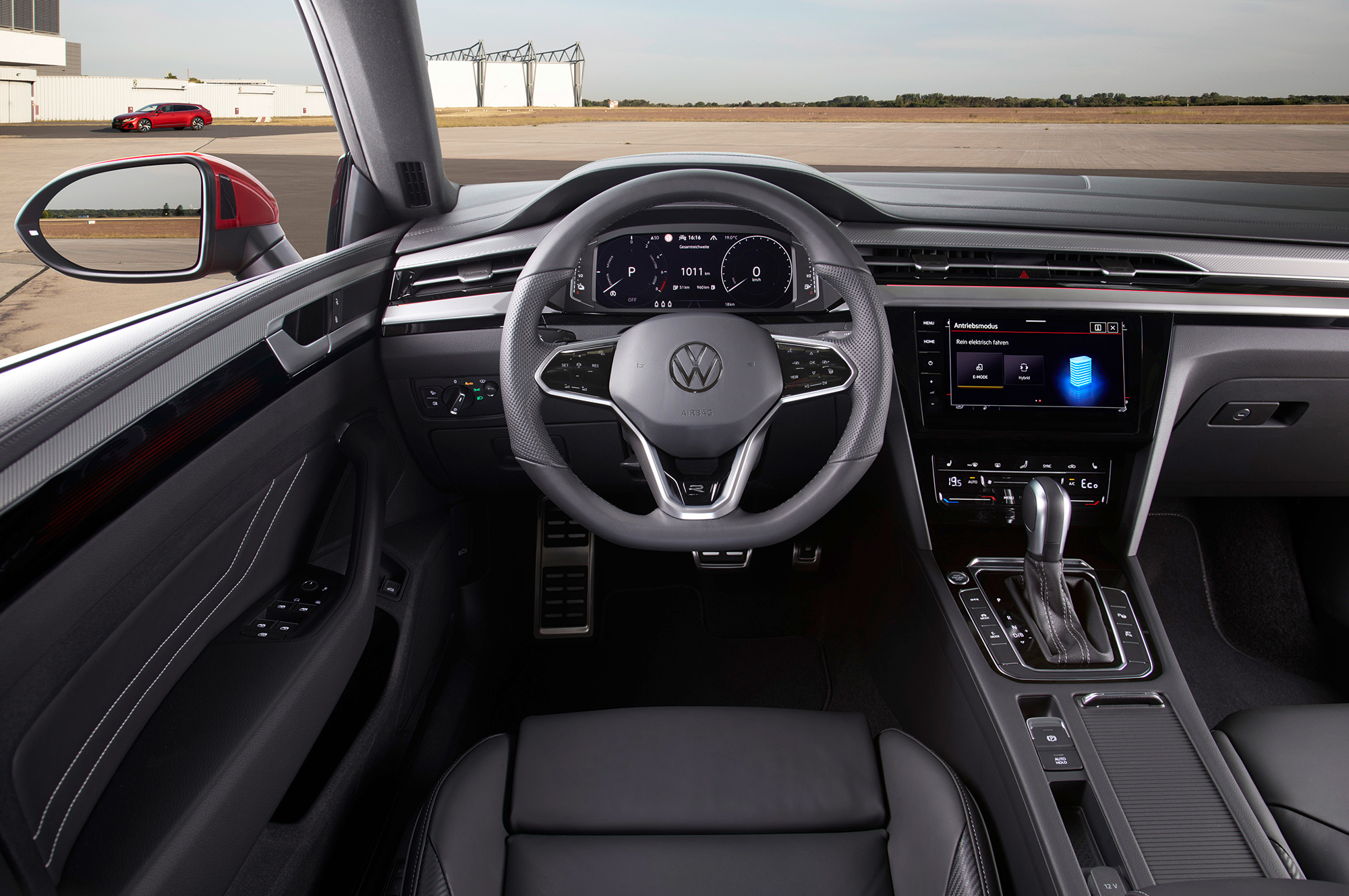 Гибридный же Arteon eHybrid с возможностью подзарядки от сети бывает только переднеприводным, а крутящий момент на колёса идёт через шестиступенчатый «робот» DQ400E с двумя сцеплениями. Начинка у бензоэлектрического Артеона — от обновлённого Пассата GTE. Наддувный 1.4 TSI (156 л.с.) работает в тандеме с электромотором (115 л.с.), а суммарная отдача составляет 218 сил и 400 Н•м. Ёмкость литиево-ионной батареи — 13,7 кВт•ч, запаса хода на электротяге — до 55 км по циклу WLTP. В таком режиме пятидверки могут разгоняться максимум до 140 км/ч.