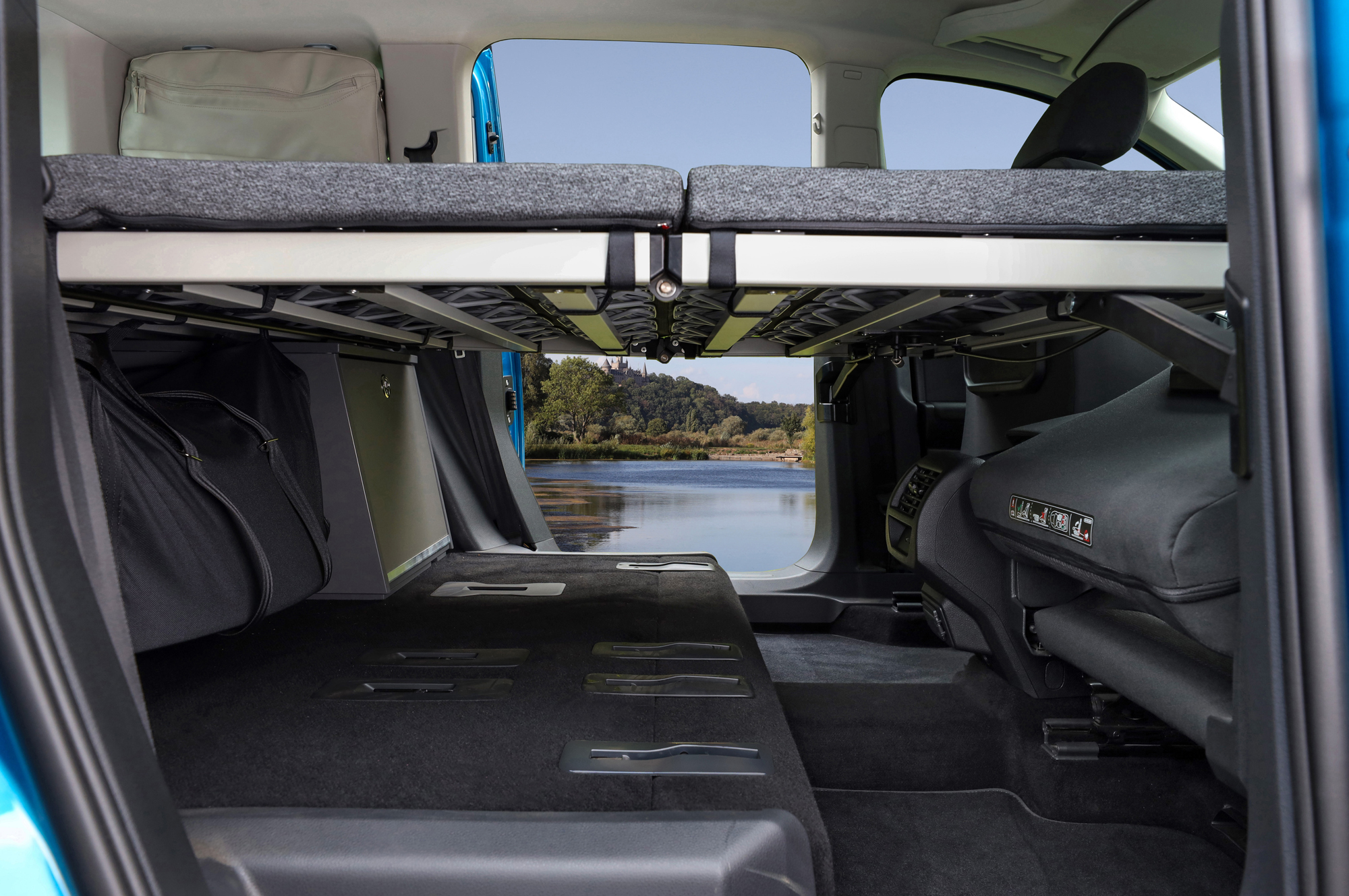 В штатное оборудование младшей Калифорнии вошла раскладная кровать с чашечными пружинами и высококачественным матрасом. Её размер составляет 1980×1070 мм. В сложенном виде она располагается над багажным отделением. Важно, что теперь она независима от сидений второго ряда (ранее они становились частью кровати). Так что при необходимости их можно демонтировать ещё перед поездкой, освободив больше места под поклажу. Добавив палатку, а к ней спальный отсек, можно получить места для сна на четверых (двое в машине, двое под тентом).