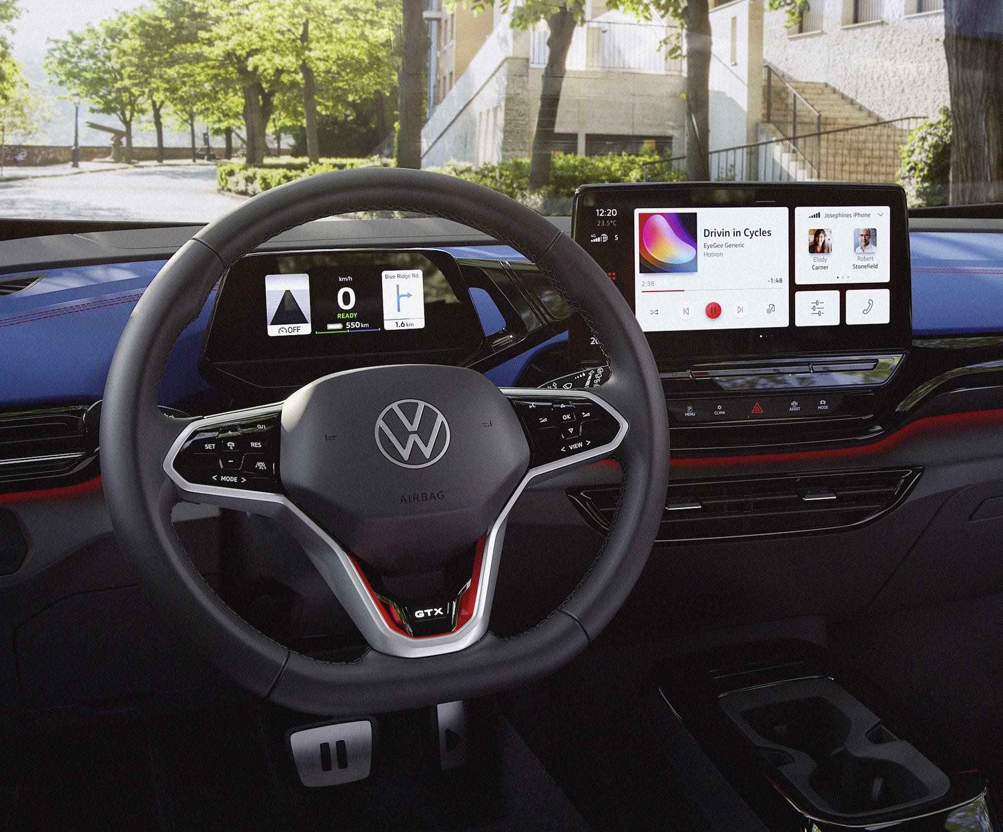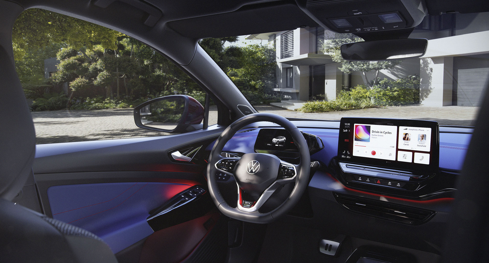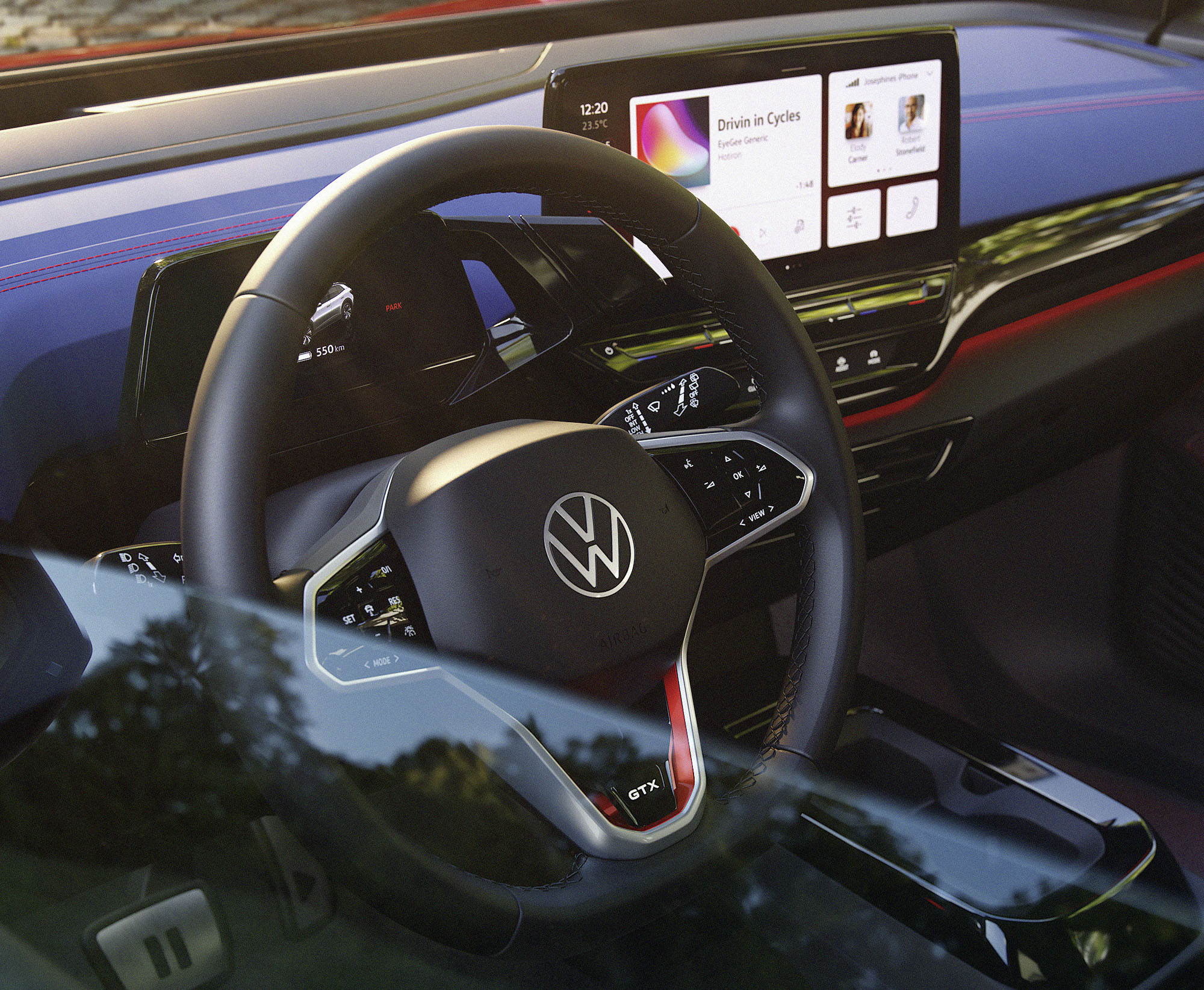 Верхняя часть приборной панели и вставки из кожзаменителя в дверях окрашены в тёмный цвет X-Blue (символ экологичности, по замыслу разработчиков). За спортивный настрой отвечают красные акценты, в частности контрастная прострочка на креслах. Логотип GTX добавлен на руль, накладки на пороги и спинки передних сидений (в виде перфорации). К услугам водителя — матричные фары, окружающая подсветка с 30 цветами, подогрев руля — всё, как положено топ-версии «ай-ди-четвёртого». Докупить можно проекционный дисплей с дополненной реальностью и 12-дюймовый центральный тачскрин вместо 10-дюймового.
