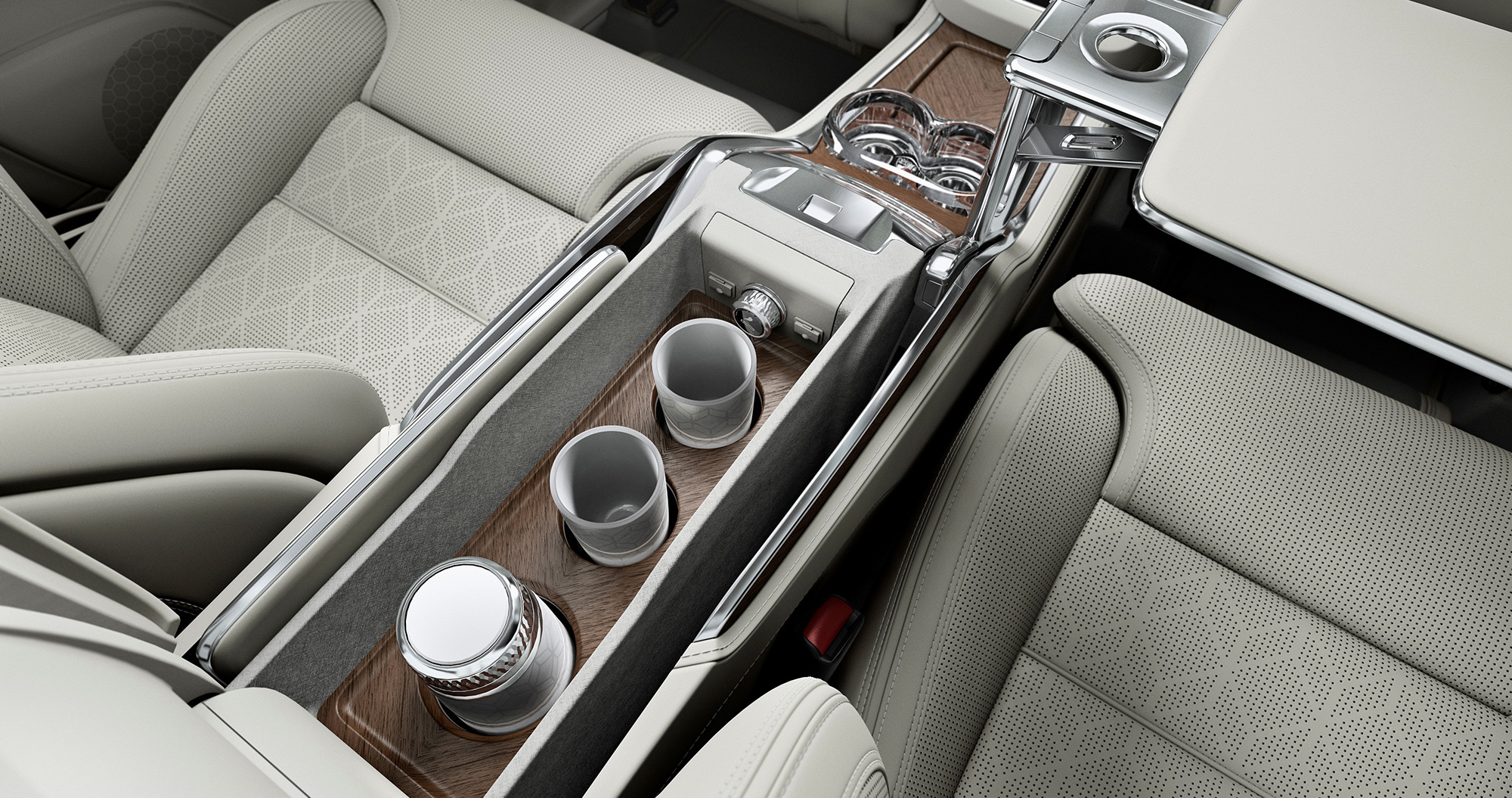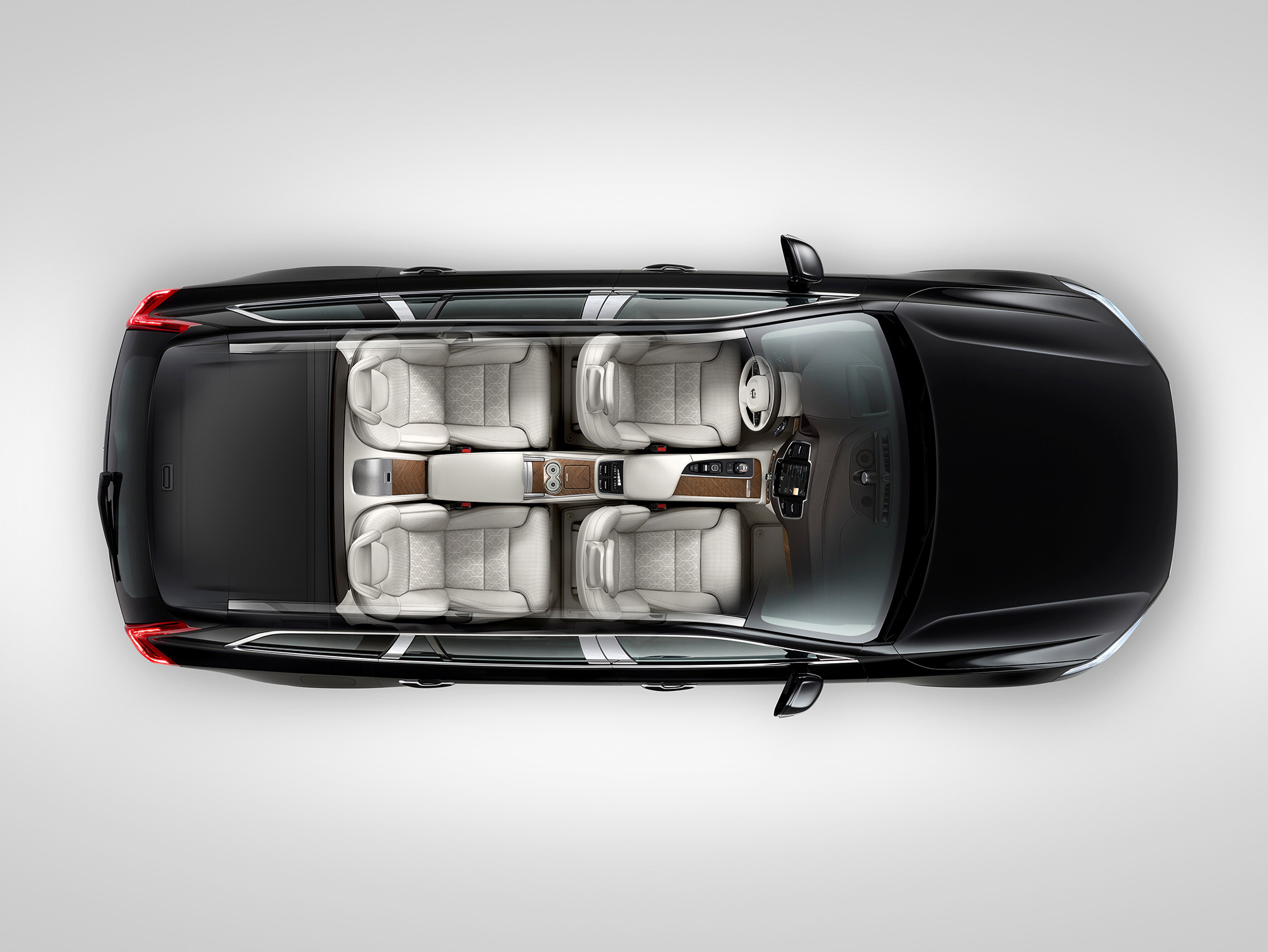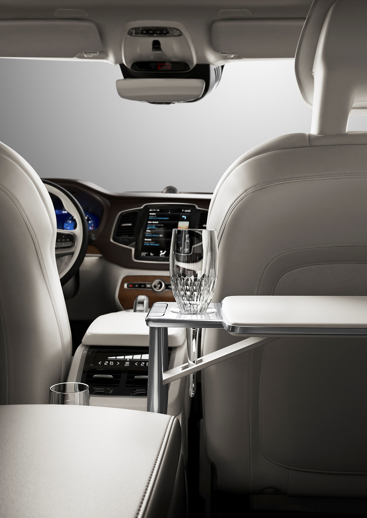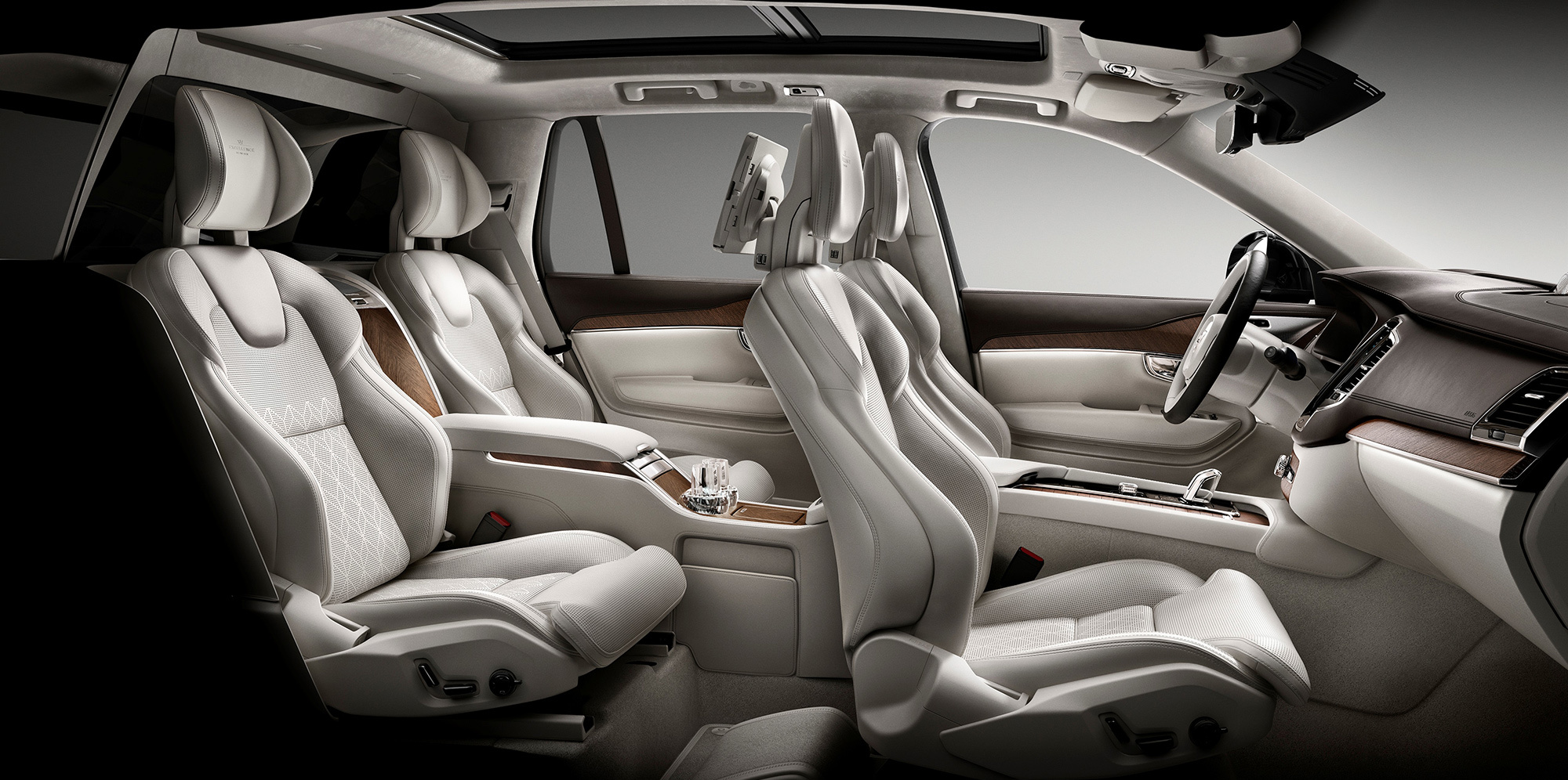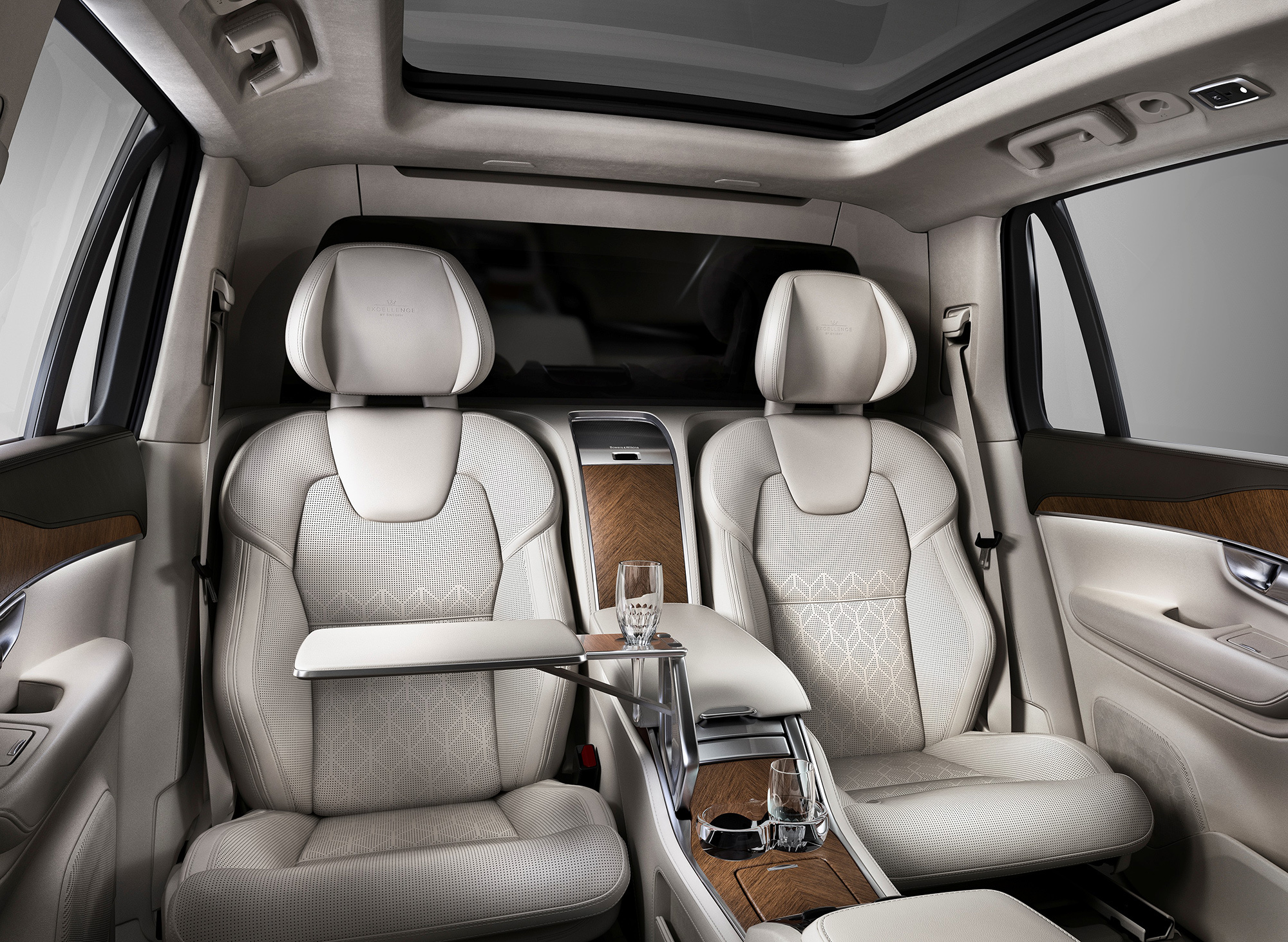 Сиденья сзади точно такие же, как и спереди. Автомобиль строго четырёхместный: благодаря такой компоновке удалось выиграть прибавку места для ног задних пассажиров. В стандартное оборудование XC90 Excellence входят складные столики, холодильник, подстаканники с функцией подогрева и охлаждения и набор хрустальных бокалов ручной работы шведской компании Orrefors.