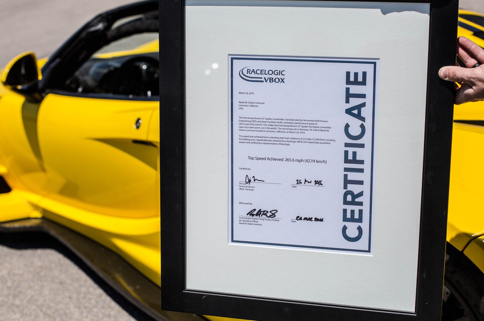 Минувшей осенью двигатель Венома форсирован с 1261 л.с. и 1566 Н•м до 1471 л.с. и 1745 Н•м (поднято давление наддува, топливо заменено на E85 Flexfuel). И вот теперь объявлен итог этих усилий: 25 марта жёлтый аппарат по имени Hennessey Venom GT Spyder промчался по бетонке авиабазы ВМС США Лемур в Калифорнии со скоростью 427,4 км/ч, побив рекорд для серийных открытых моделей, установленный в 2013 году родстером Bugatti Veyron Super Sport Vitesse (408,84 км/ч). А 11 апреля компания Hennessey детально рассказала о своём успехе.