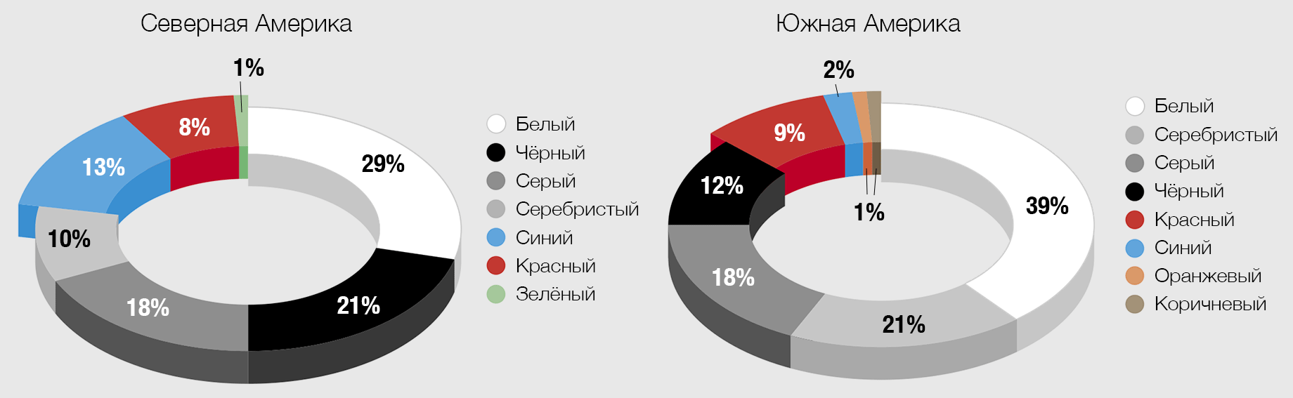 В 2020 году в целом палитра автомобильных красок стала шире, чем в 2019-м. Притом что мир столкнулся с сокращением выпуска машин. Есть некоторые отличия по регионам. Так, в Азии несколько популярнее, чем иных частях света, коричневый, а в Европе относительно велика доля новых машин синих оттенков. Хотя и в Азии синий тоже в числе лидирующих. В Северной Америке на него — самый высокий спрос среди всех регионов, а Южная Америка благоволит красному. Конечно, эти перестановки происходят за спиной ахроматических цветов, преобладающих везде.