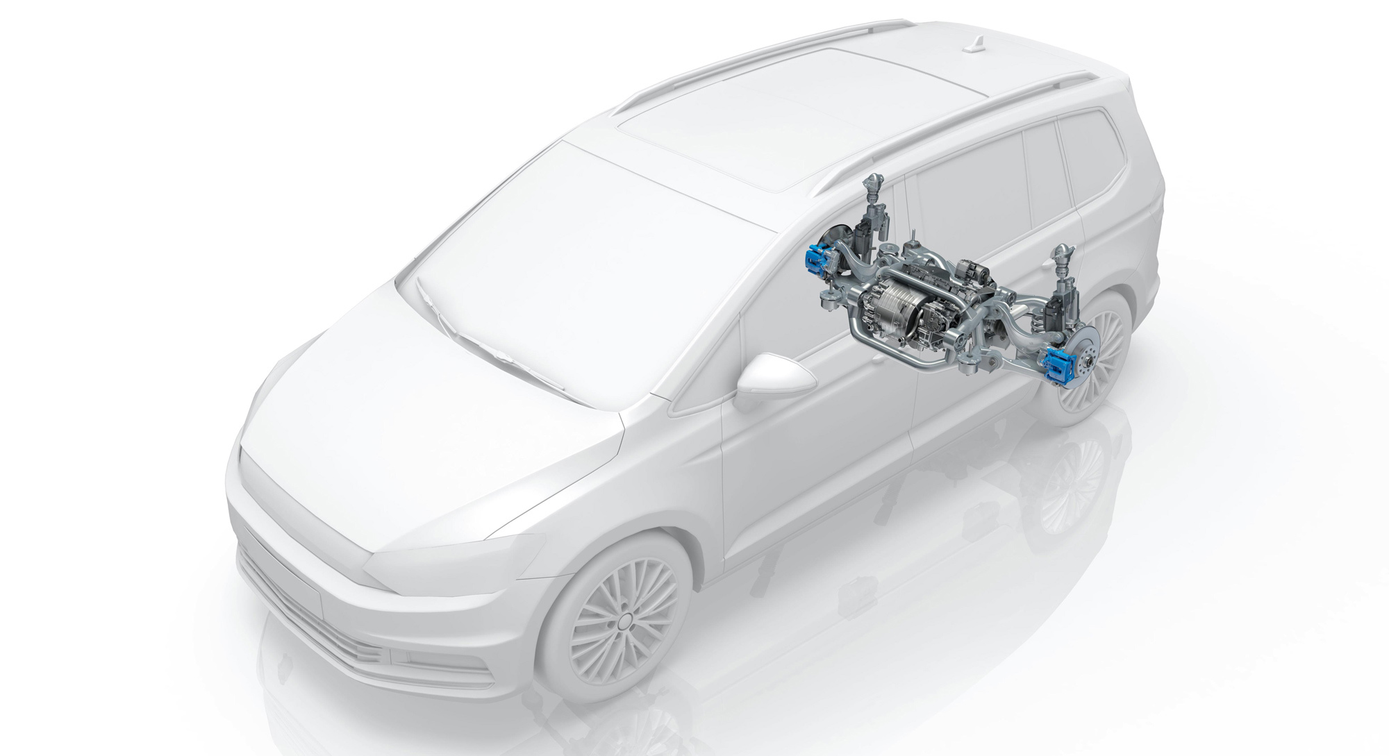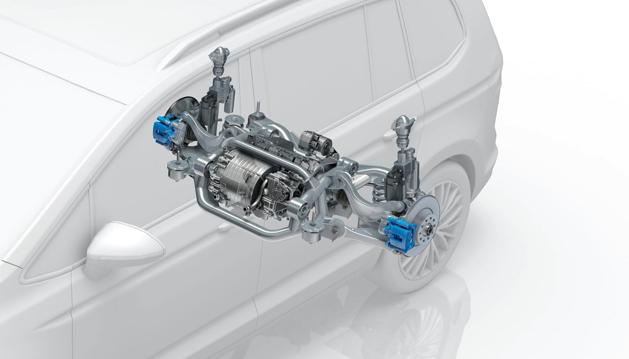 В передней части Турана вместо ДВС разместилась крупная литиевая батарея, а сзади немцы полностью поменяли подвеску. Вместо штатной начинки компактвэн получил блок ZF mSTARS (modular Semi-Trailing Arm Rear Suspension): модульную заднюю подвеску на косых рычагах с интегрированными электроприводом и активным рулевым управлением задней осью AKC (Active Kinematics Control), которое может быть задействовано для повышения как маневренности, так и устойчивости.