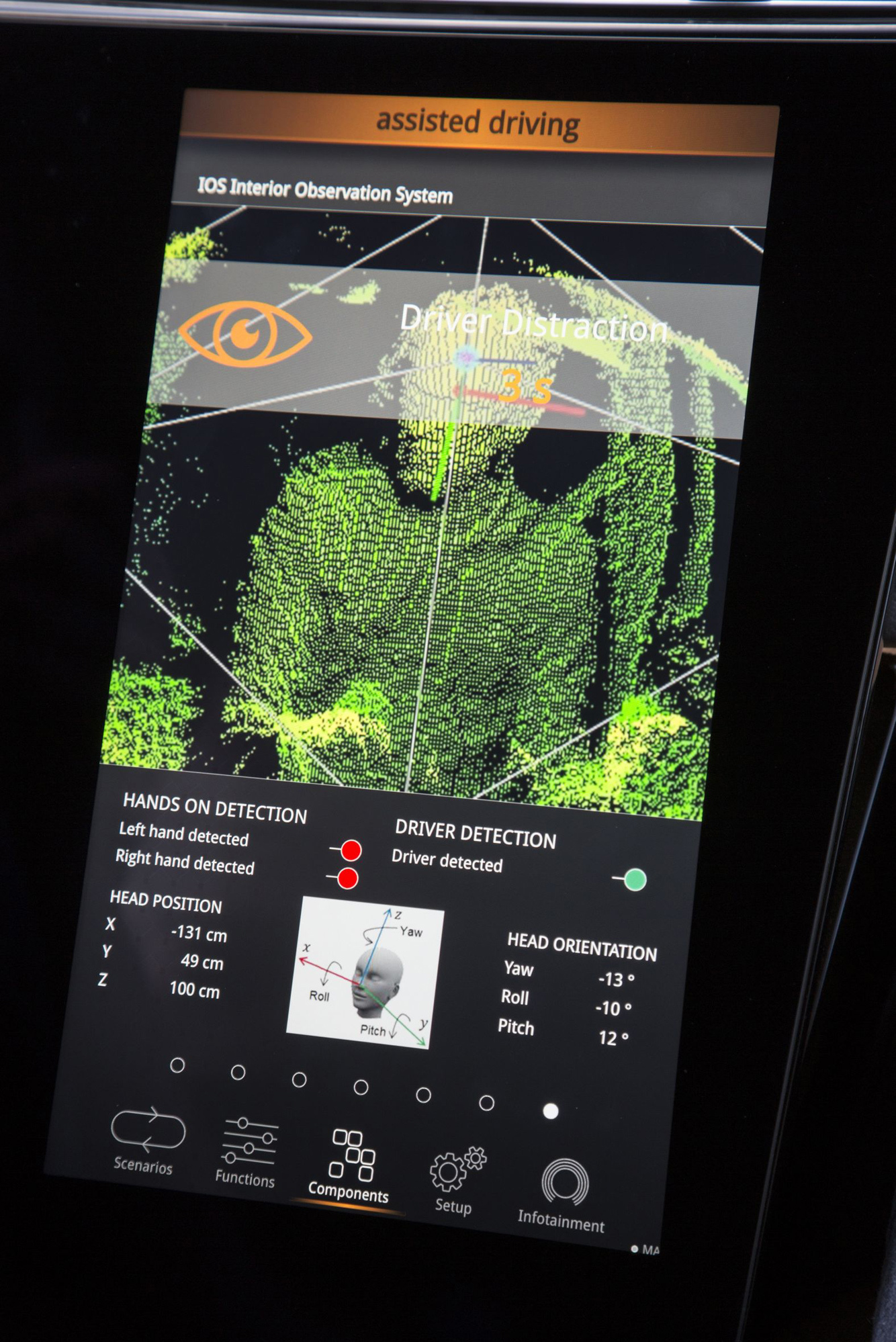 Одна из интересных новых систем — Driver Distraction Assist, контроль за вниманием водителя. Это камера (в данном случае с лазерной подсветкой), работающая даже в темноте и направленная на человека. Она определяет положение не только глаз, но всей головы. Если электроника видит, что водитель не смотрит на дорогу, то в салоне раздаётся звуковой сигнал, на приборке вспыхивает предупреждение.