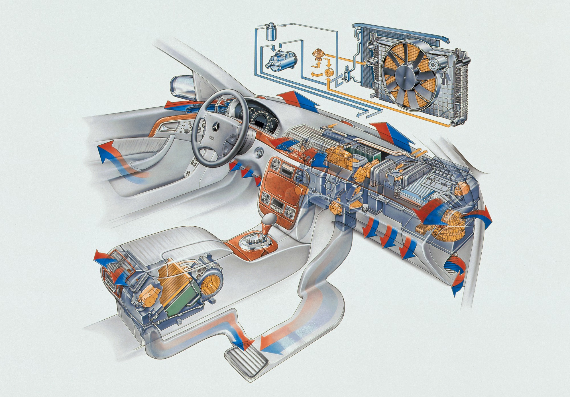 Современные блоки HVAC (Heating, Ventilation, Air conditioning) ― то есть собственно «комбайны», готовящие и поставляющие воздух в салон, ― рассчитаны на постоянное использование кондиционера. Понятие «кран печки» фактически ушло в прошлое ― на большинстве машин охлаждающая жидкость циркулирует в радиаторе отопителя и зимой, и летом. Порой отопитель последовательно «врезан» в малый круг системы охлаждения, через него проходит вся жидкость, и на морозе «печка» начинает греть раньше и сильнее. Так сделано даже на вазовских машинах. Но летом раскалённый радиатор, пусть и перекрытый заслонками, тоже частично подогревает забортный воздух ― и рука тянется к кнопке A/C.