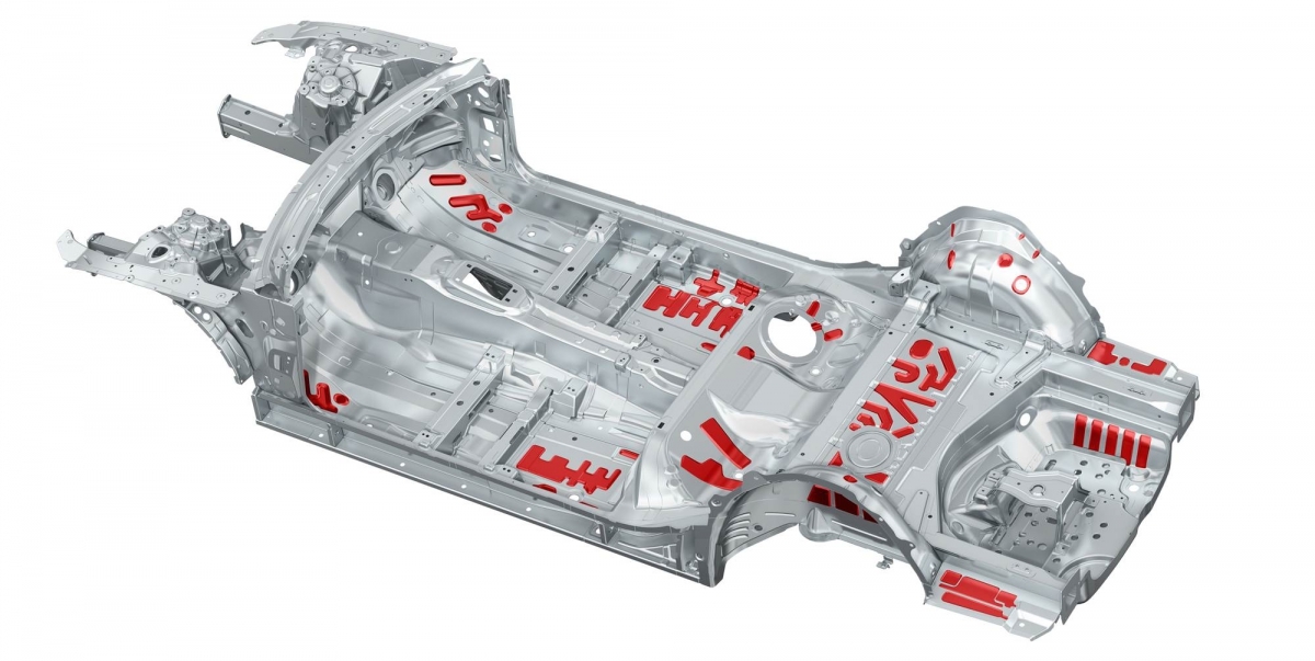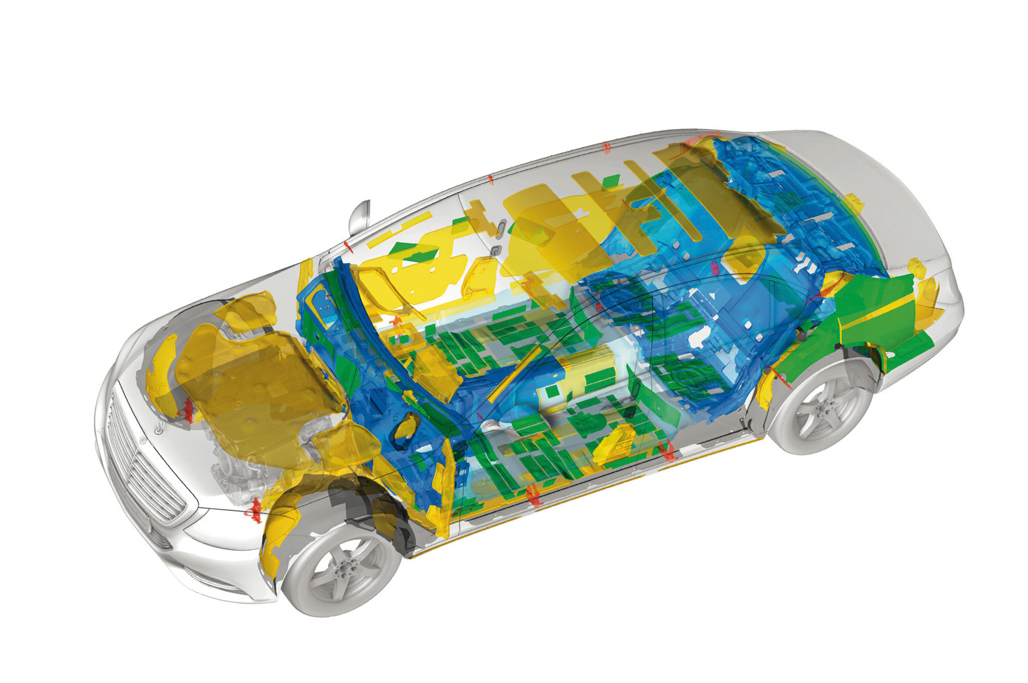 В определённых местах в полости кузова заливается пена, свойствами напоминающая строительную, а на плоские панели клеятся, например, битумные маты. Но не сплошняком, как при гаражном тюнинге, а точечно, выбирая места на базе компьютерного моделирования. Шум использует любые лазейки, поэтому минимизируется число отверстий в кузове, а особенно в моторном щите. Любое из них тщательно изолируется. Хорошо, что ушли в прошлое механические приводы акселератора и автоматических коробок передач, служившие мощным каналом передачи вибраций. И только после того, как все конструктивные резервы выбраны, наступает время звукоизоляции.
