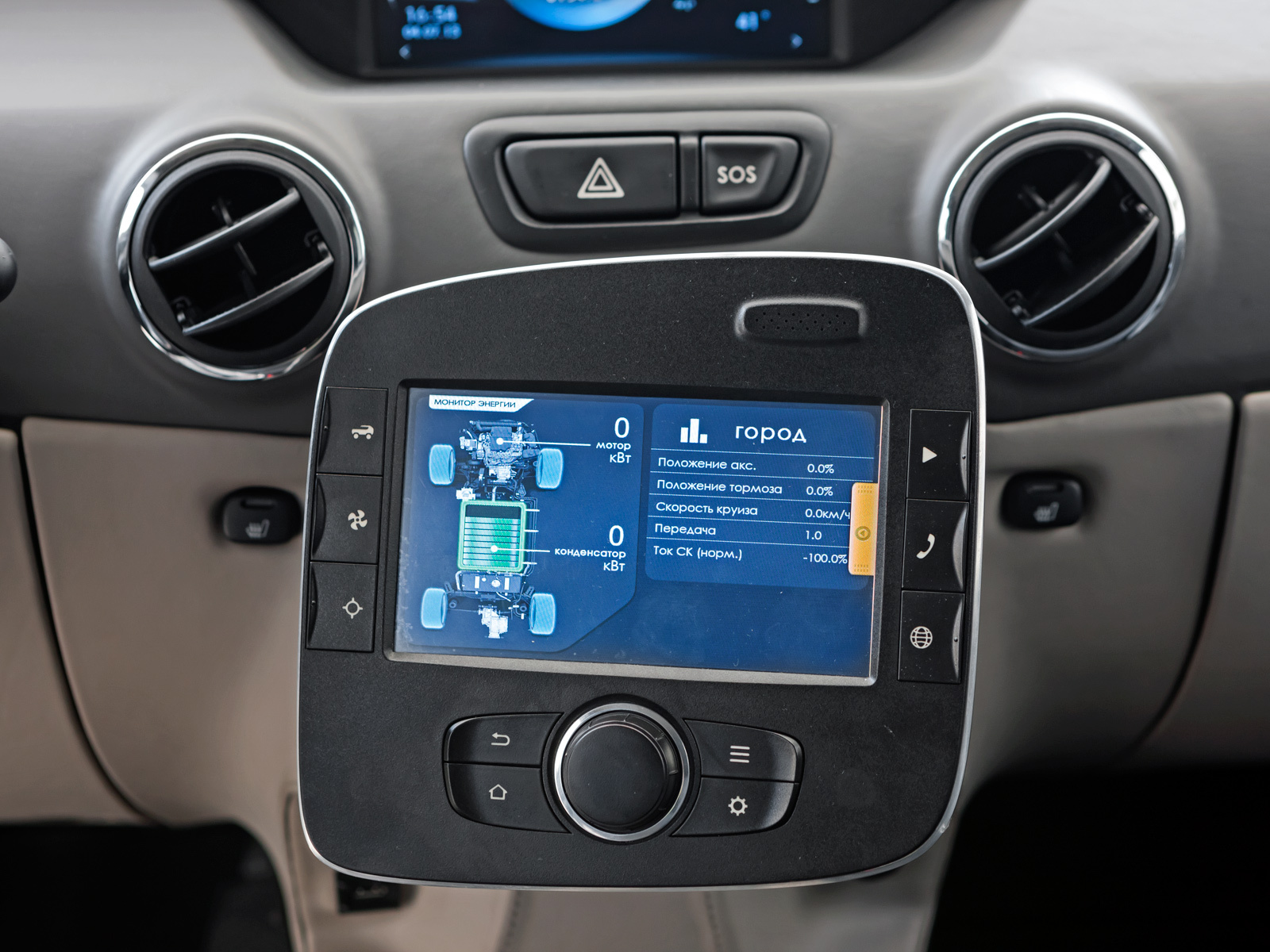Тут ДВС, питающийся двумя видами топлива — бензином и метаном. Мотор не имеет механической связи с колёсами. Он раскручивает генератор, от которого энергия поступает двум электродвигателям на осях. Каждый из синхронных тяговых электромоторов интегрирован в мехатронный модуль, раскручивающий колёса. В корпусе такого 58-килограммового модуля объединены двухступенчатый редуктор, механический дифференциал, система охлаждения и управляющая электроника с силовым инвертором на IGBT-транзисторах. И это ещё не всё. В качестве накопителя используется батарея суперконденсаторов, которая даёт энергию для разгона и подпитывается при торможении.