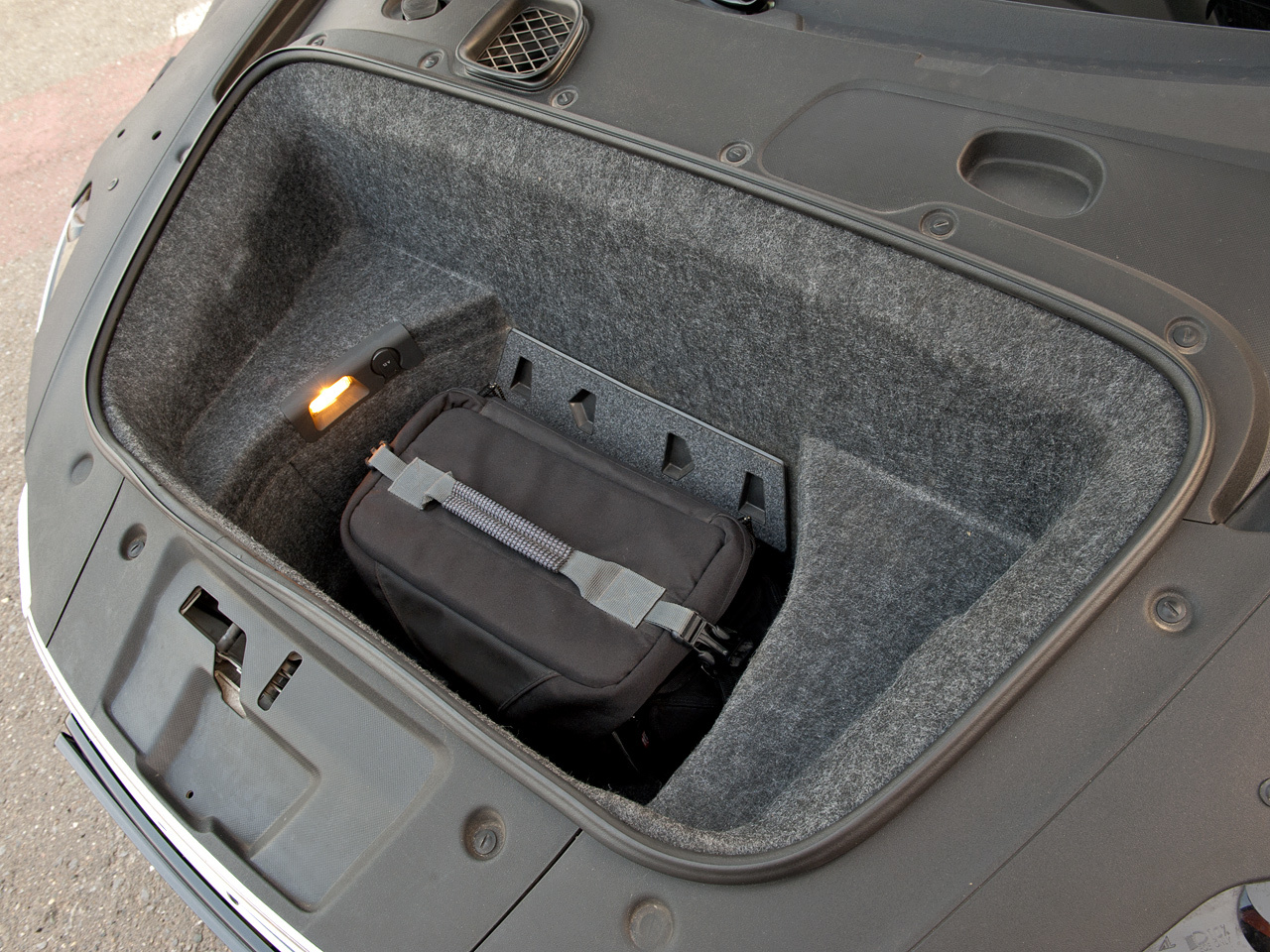 - Купе менее практично, чем, например, Porsche 911: салон двухместный, места для поклажи меньше. Что-то поместится на полку за спинами седоков, что-то — в багажный отсек спереди. Но в нём, как в духовке.
