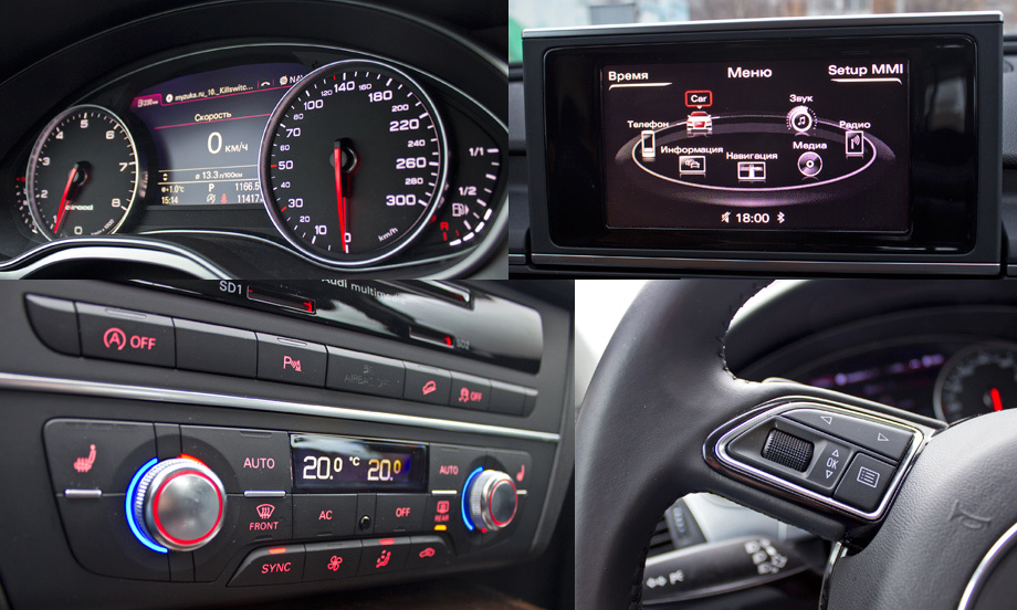 «Трёхмерная» приборная панель безупречна — информативна и очень красива. По умолчанию — мультимедийный комплекс MMI с центральным дисплеем старого образца. Но за доплату 193 830 рублей положена система c более крупным экраном (диагональ — 8 дюймов вместо 6,5) с качественной графикой, навигацией и жёстким диском на 20 Гб. Двухзонный климат-контроль с эргономичным блоком управления — базовое оборудование.