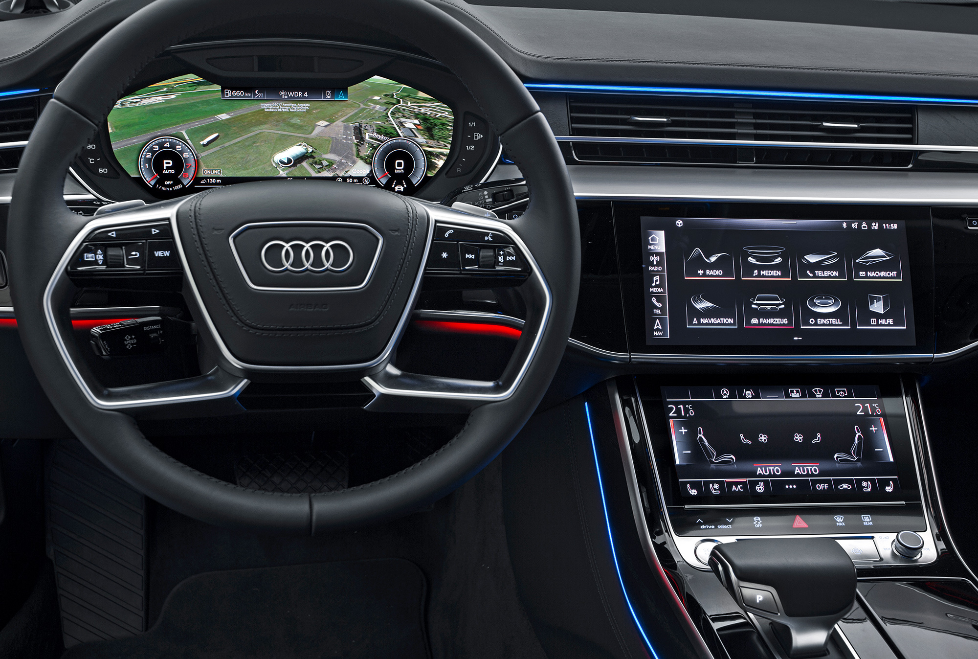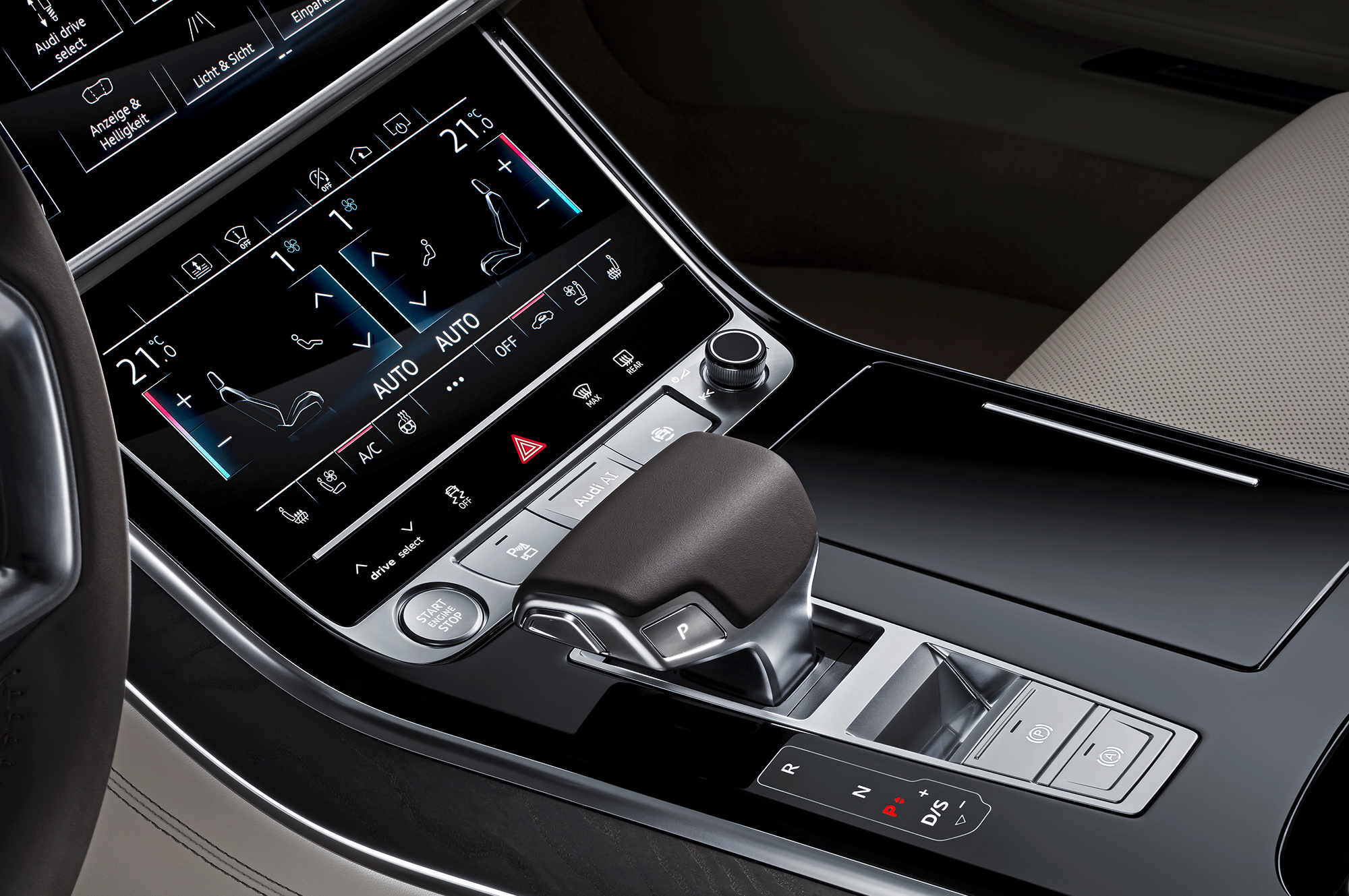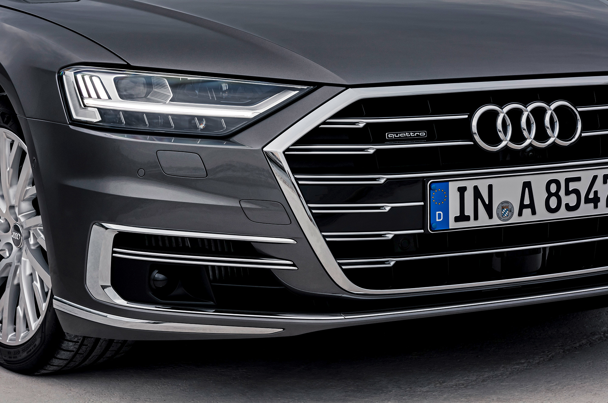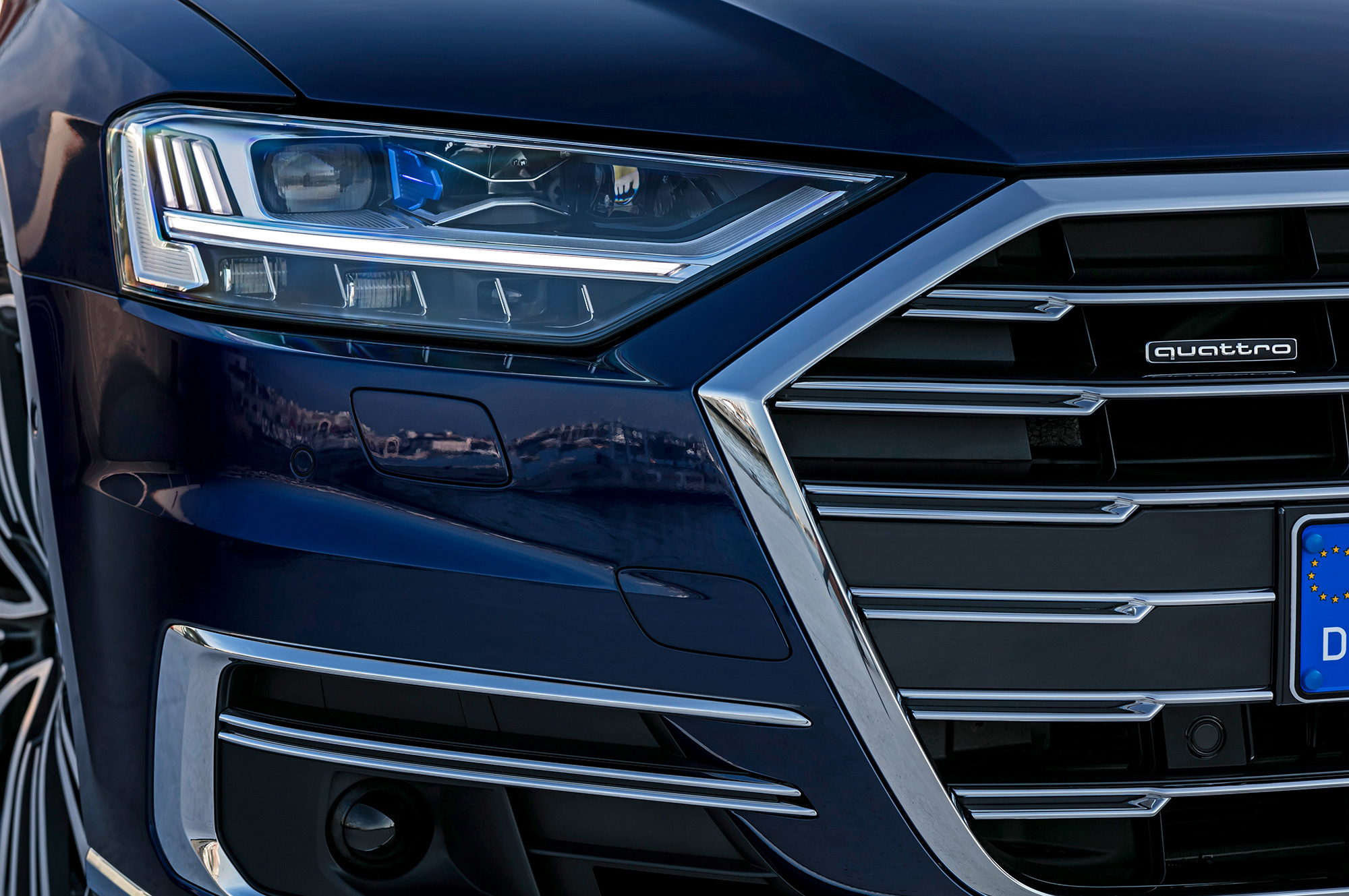 Шутка про непыльную работу дизайнеров Audi актуальна по сей день. Развлечься позволено только художникам по свету: машина приветствует и прощается с владельцем передней и задней иллюминацией. Фары ― светодиодные, трёх версий, причём в максимальной комплектации есть лазерно-диодный дальний свет, бьющий на 450 метров. Смешно, но ради красоты в такие фары встроены синие светодиодики. Свежа в нашей памяти справедливая борьба ГИБДД с «синими писалками», а инженер-светотехник не смог точно ответить, как их собираются омологировать.