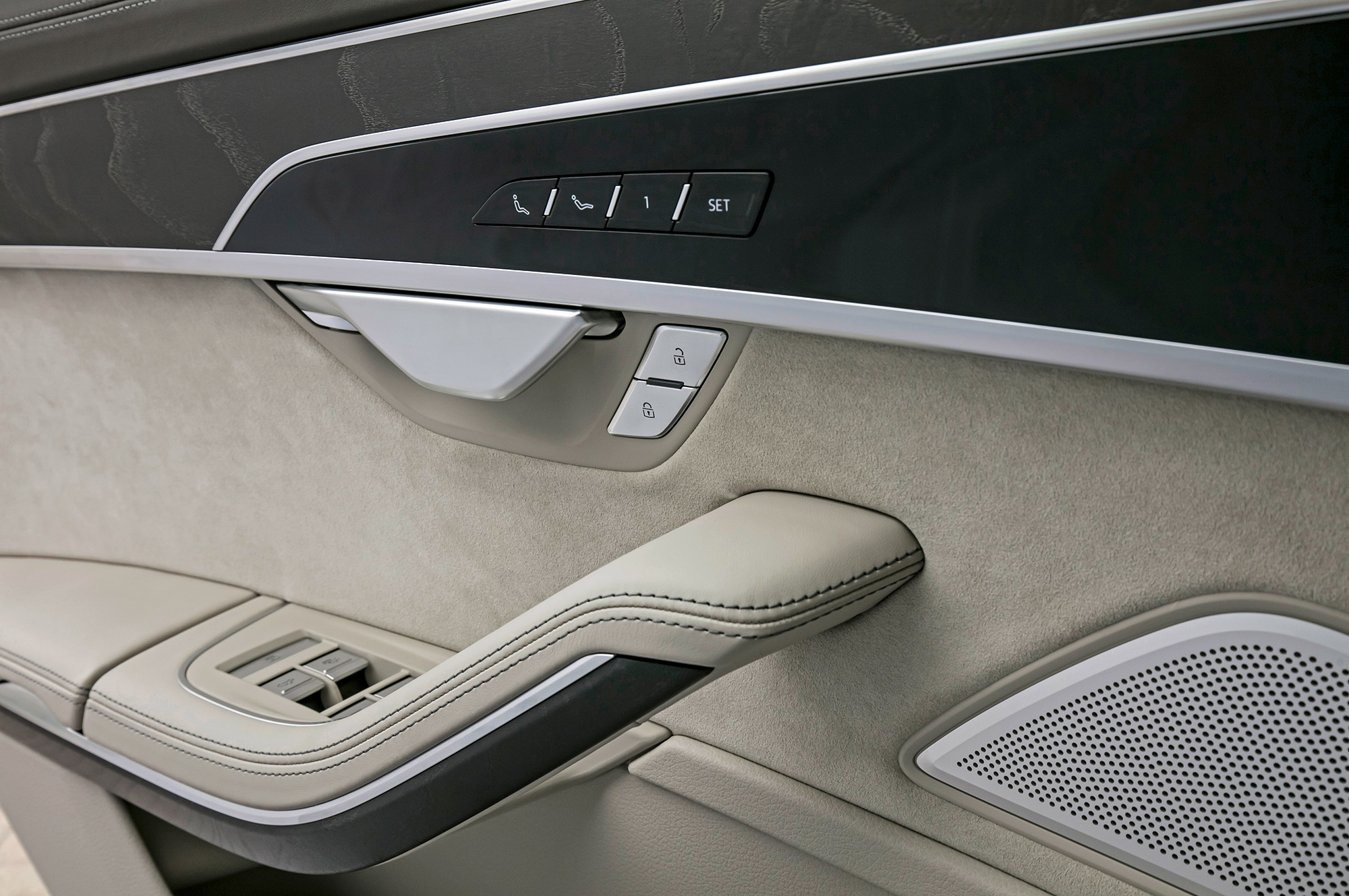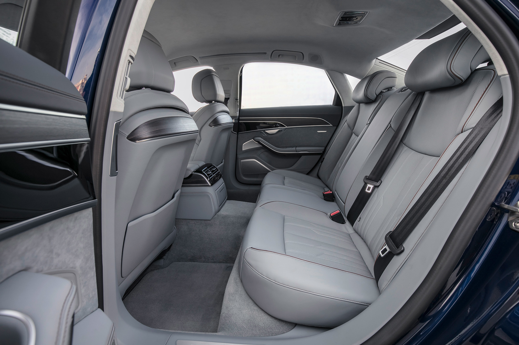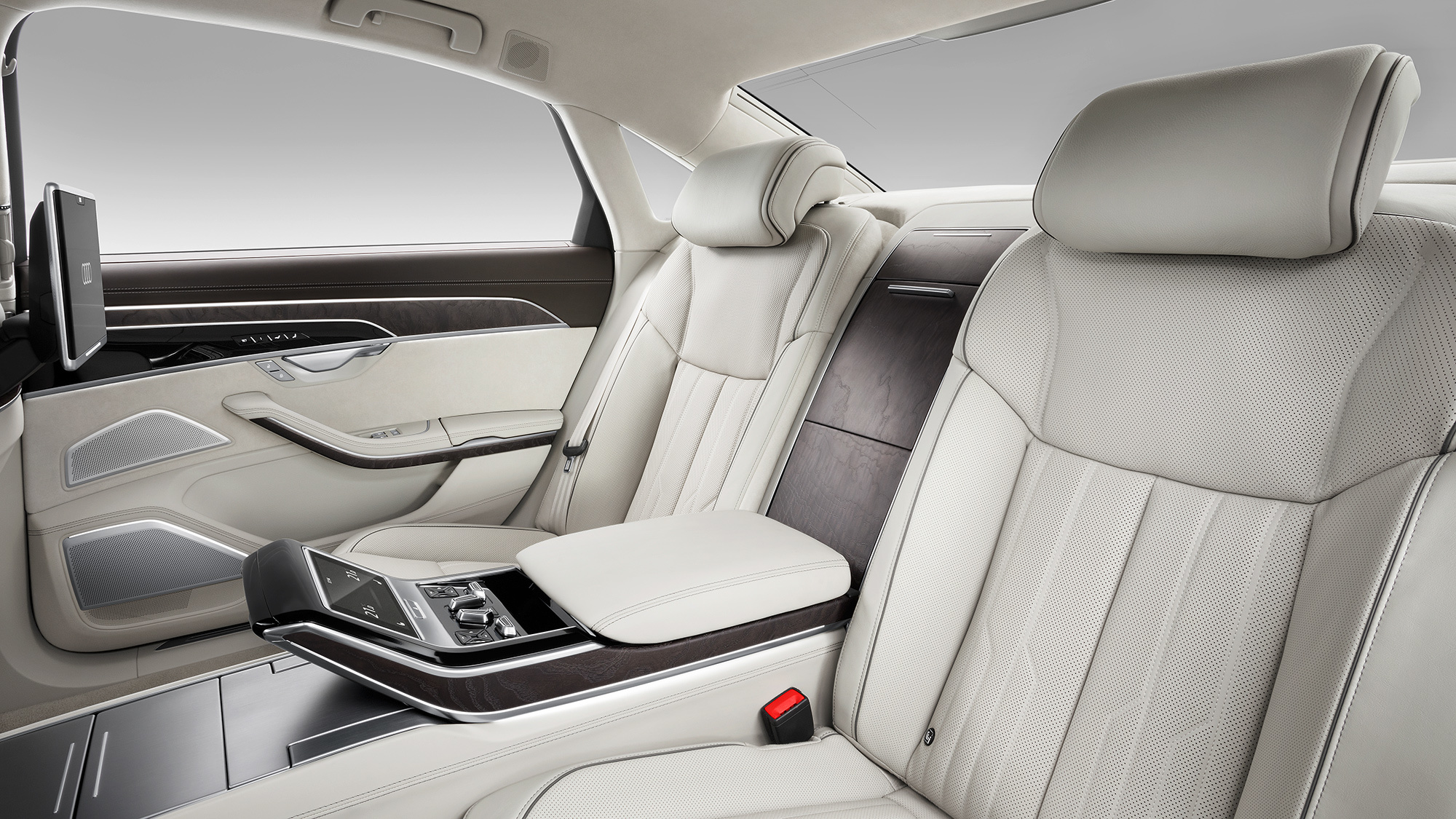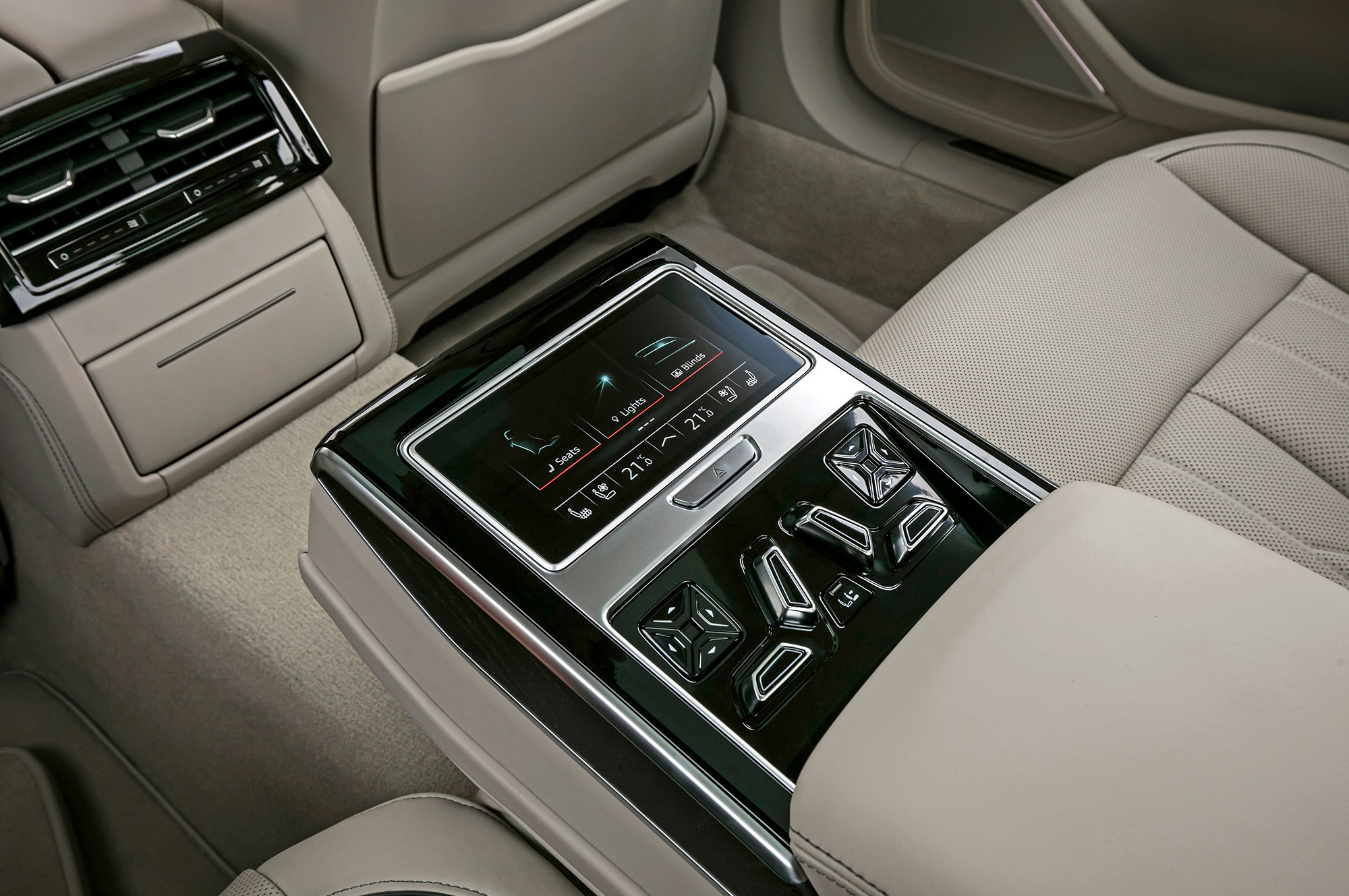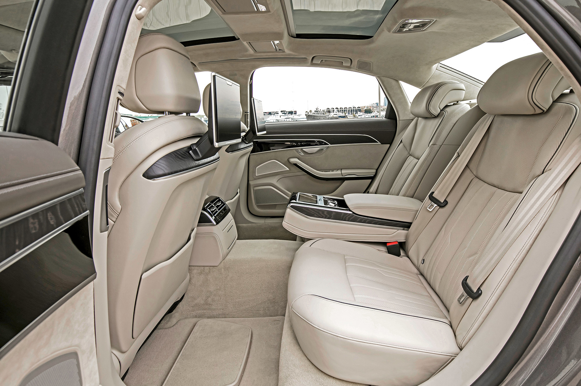 Audi для заднего пассажира ― это A8L c удлинённой на 13 сантиметров базой. Я не избалован S-классом или «семёркой», поэтому очарован и мягковатыми опционными раздельными креслами, и посадкой, и обзорностью. Можно заказать на удивление эффективный пневмомассаж, а сидящему справа — хоть бы жене Марселласа Уоллеса — даже массаж ступней. Большие съёмные матовые планшеты на пятом Андроиде ― тоже опция. Однако вентиляция сидений отличается скромной производительностью. Не знаю, насколько тиха базовая машина, но с заказными стеклопакетами к акустическому комфорту в А8 не придраться.