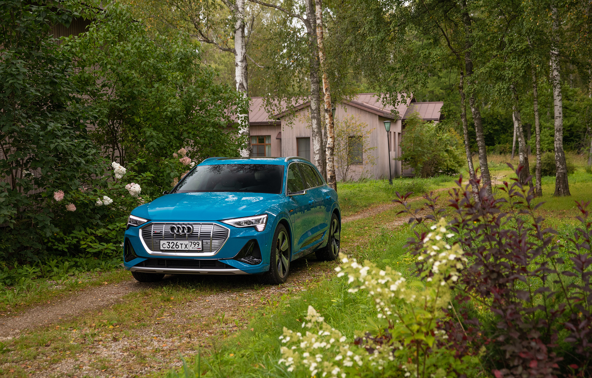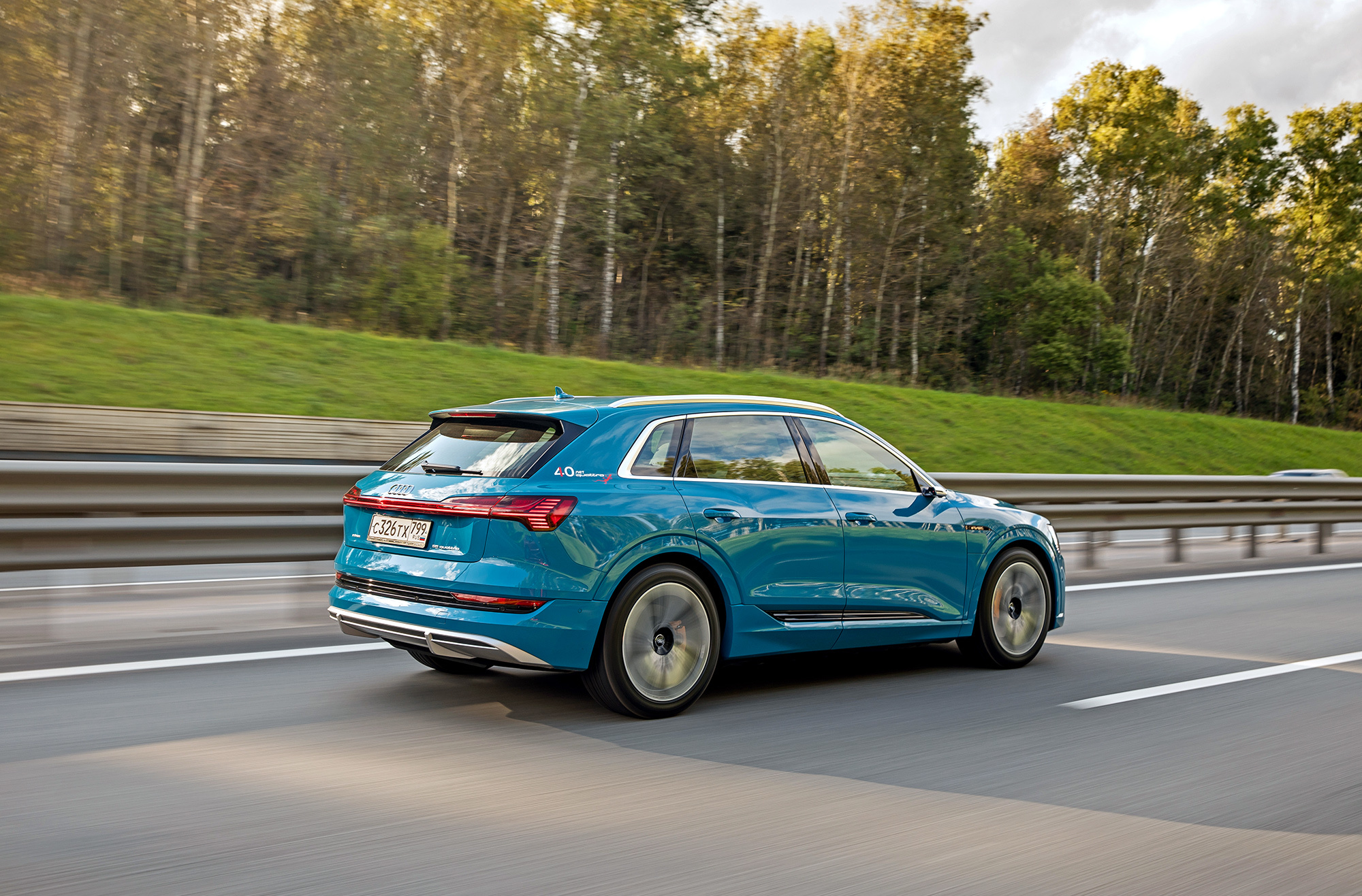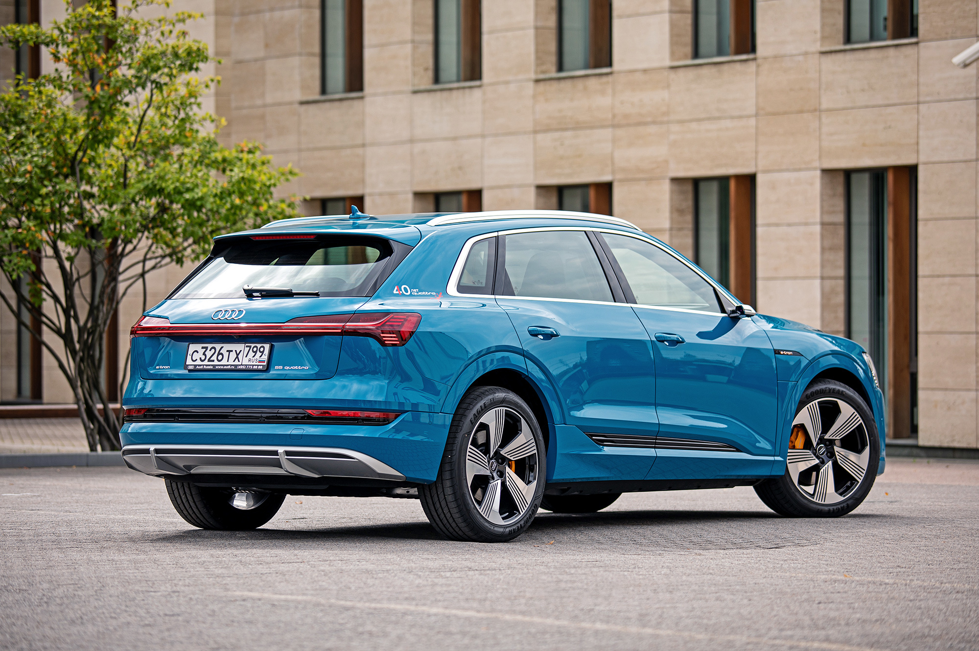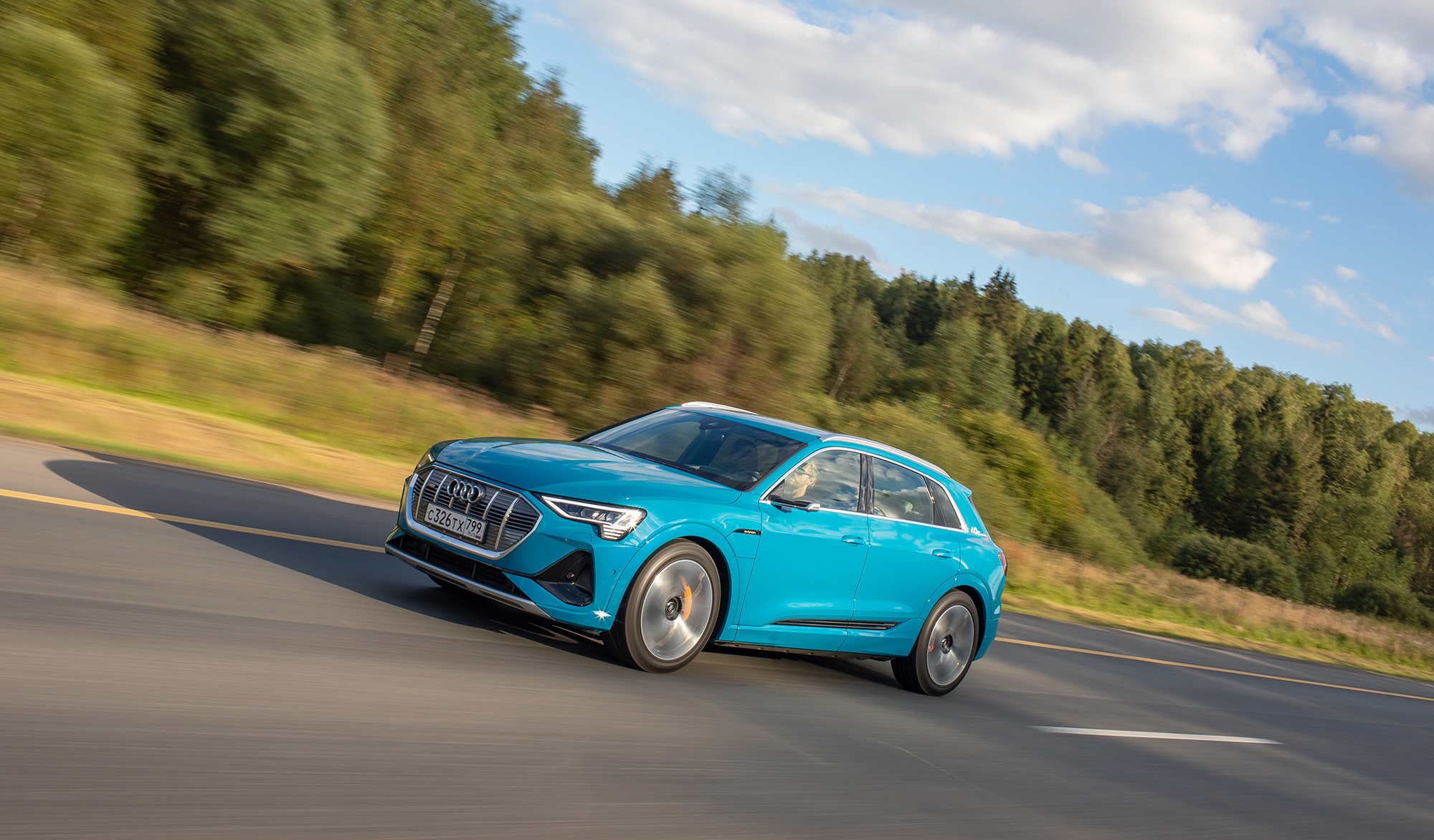Вместо упомянутых в пресс-материалах шин Goodyear Eagle F1 с низким сопротивлением качению тестовая машина обута в Continental Premium Contact 6 с маркировкой Audi Original. Их предельные возможности достаточно высоки, чтобы придать динамичному движению вполне аутентичный S-градус. Батарея массой под 700 кг висит всего в 15 сантиметрах над землёй, из-за чего e-tron подчёркнуто устойчив и перемещается почти без кренов.