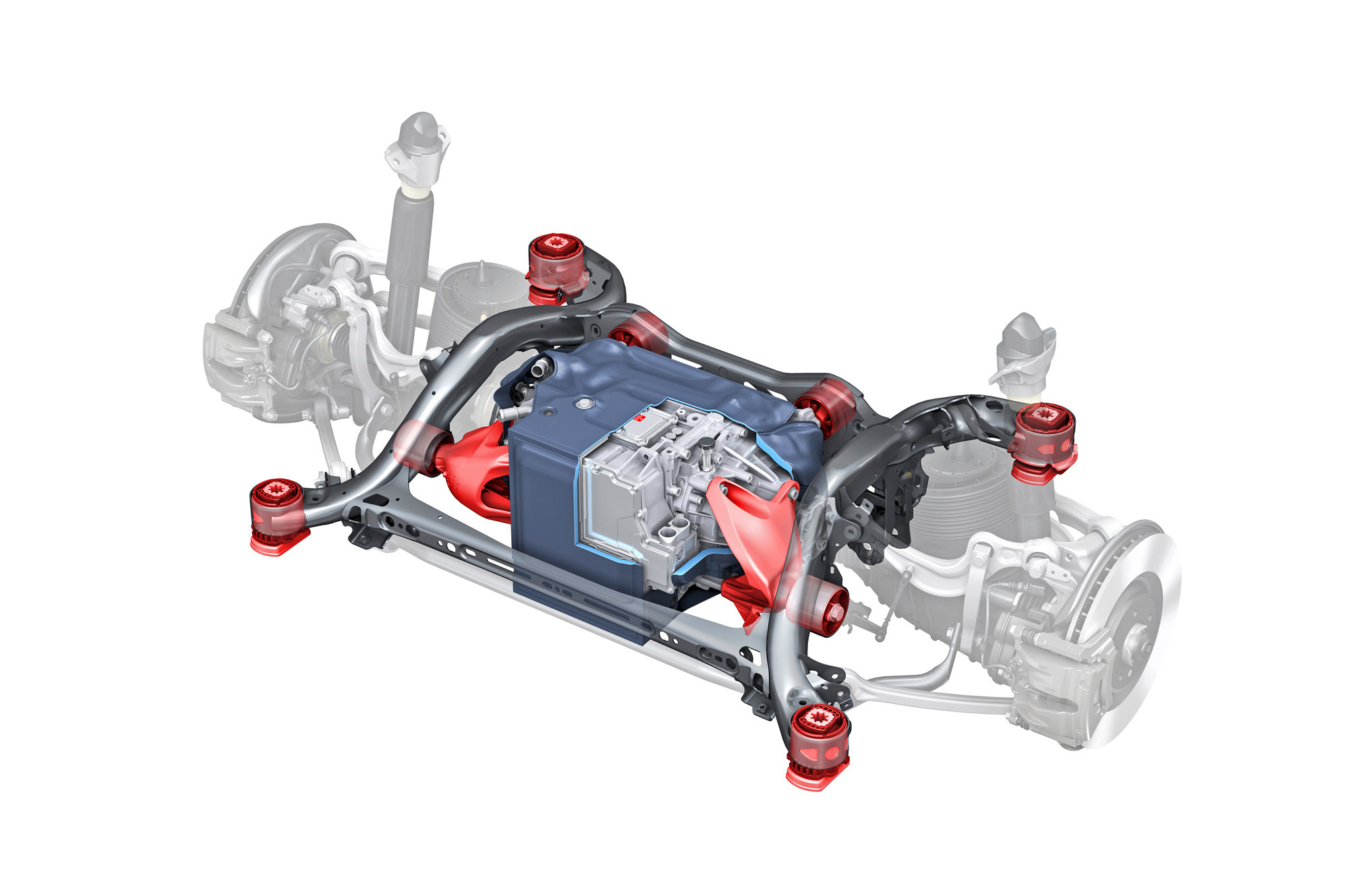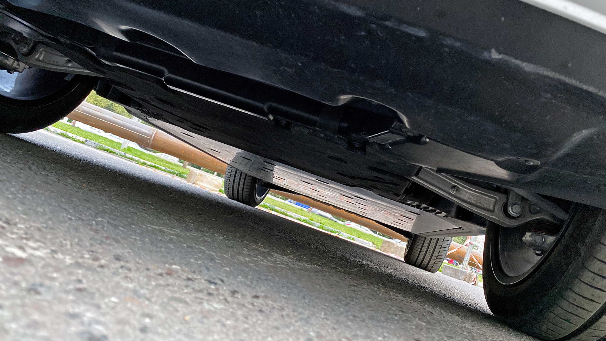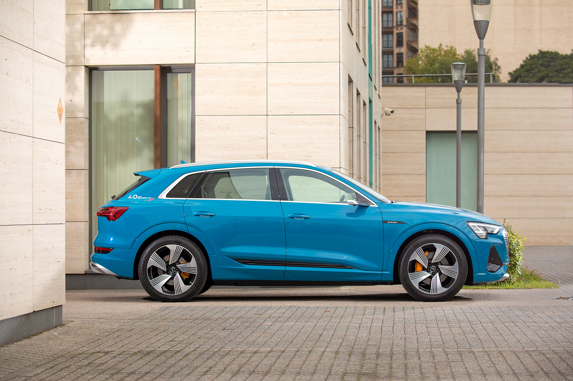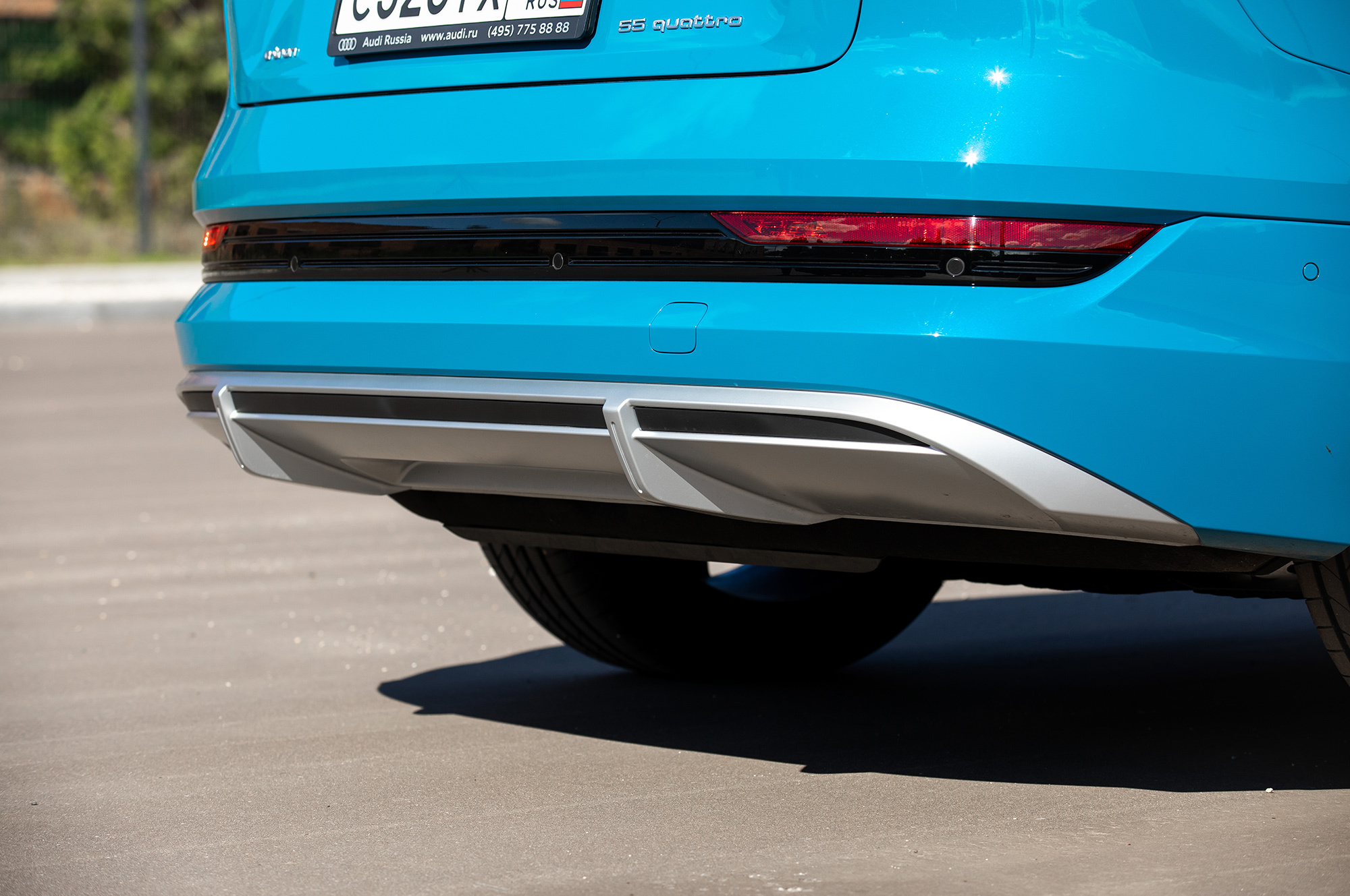 Вместо упомянутых в пресс-материалах шин Goodyear Eagle F1 с низким сопротивлением качению тестовая машина обута в Continental Premium Contact 6 с маркировкой Audi Original. Их предельные возможности достаточно высоки, чтобы придать динамичному движению вполне аутентичный S-градус. Батарея массой под 700 кг висит всего в 15 сантиметрах над землёй, из-за чего e-tron подчёркнуто устойчив и перемещается почти без кренов.