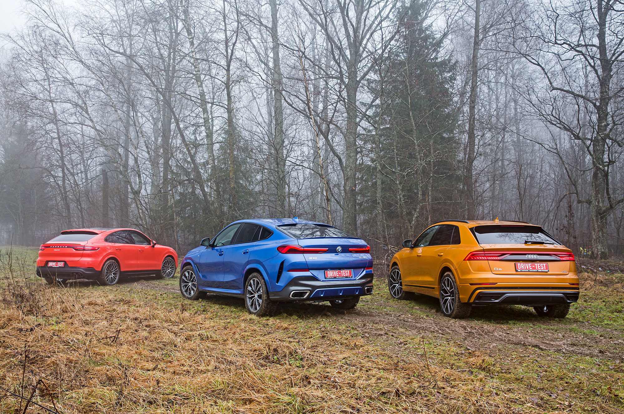 Porsche чаще всего покупают с трёхлитровым двигателем V6 (340 л.с., 450 Н•м). Таким же оснащается соплатформенник Audi Q8 55 TFSI, развивая на 50 Н•м больше. А с рядной «шестёрки» 3.0 у BMW X6 xDrive40i снято столько же, сколько у Кайена. В дизельном зачёте вводные тоже предельно близки: при идентичной налогово-выгодной мощности 249 сил шестицилиндровые Q8 45 TDI и BMW X6 xDrive30d выдают 600 Н•м и 620 соответственно. Все автомобили в тесте используют один и тот же восьмиступенчатый «автомат» ZF серии 8HP.