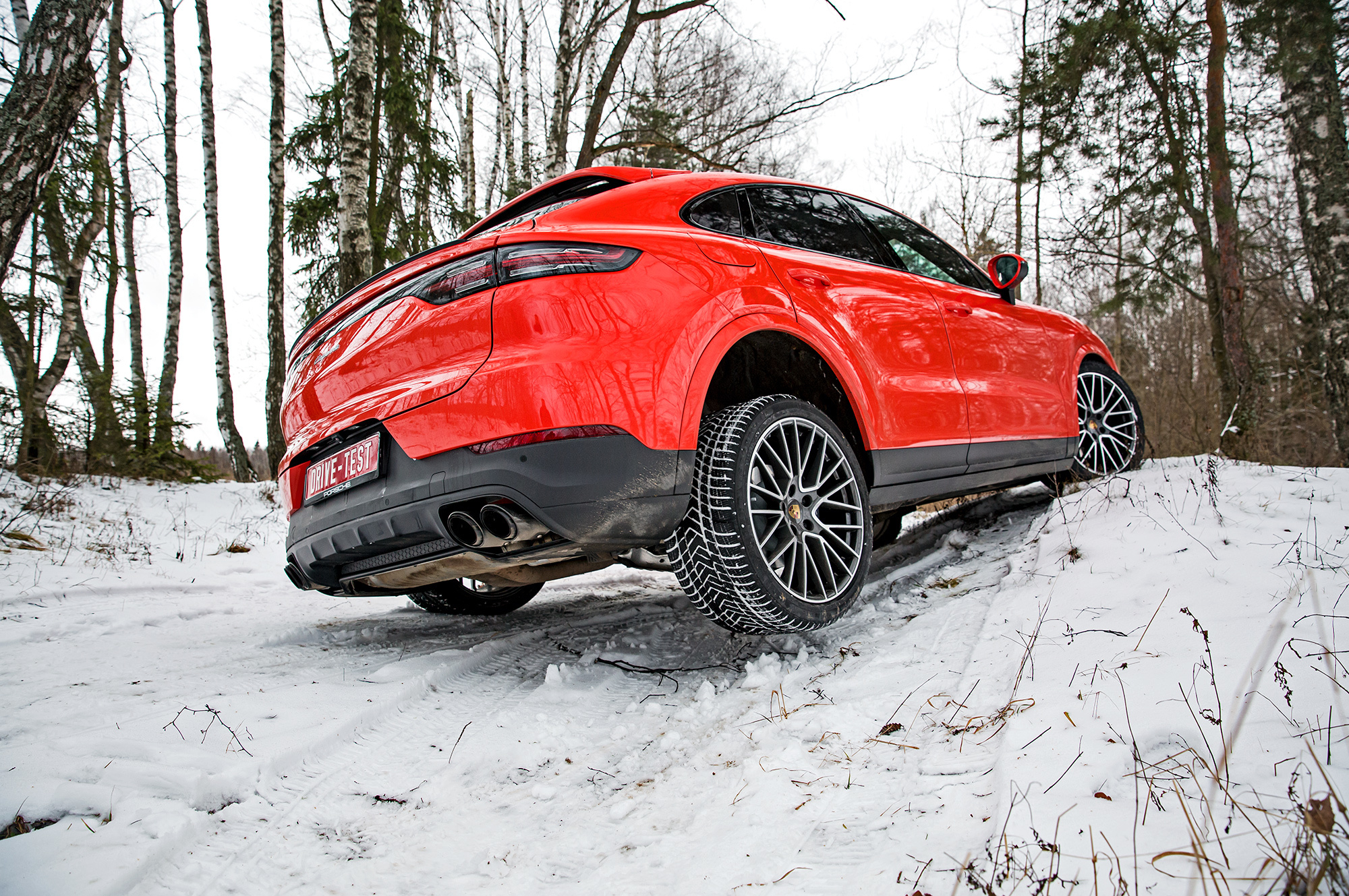 Porsche по-настоящему спортивен на фоне конкурентов. Руль с суперчётким нулём тяжеловат (не в ущерб логике изменения реактивного действия). Отклики на поворот баранки быстры и остры, хотя подруливание задних колёс не чувствуется. Porsche Cayenne не исполняет команды, а увлекает в виражи за собой. Манёвры у него выходят лучше, чем я задумываю. Опциональные активные стабилизаторы гасят крены ровно настолько, чтобы не утратить чувство реальности при запредельном сцеплении даже на зимних шинах Pirelli Scorpion Winter.