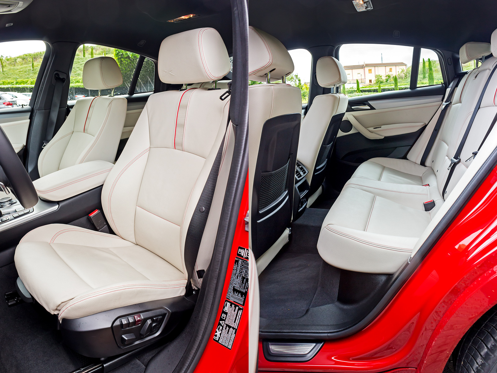Изменённая линия крыши повлияла на удобство посадки в автомобиль. И если передним седокам сильнее заваленные стойки лобового стекла не мешают забираться в салон, то пассажирам второго ряда нужно садиться осторожнее — есть вероятность, что человек ростом выше 175 см приложится головой о верхнюю кромку дверного проёма. Есть и другое новшество — передние и задние сиденья установлены на 20 и 28 мм ниже, чем в BMW X3. Но ассоциаций со спортивным купе нет, как обещает пресс-релиз: всё равно водитель сидит высоковато, даже если кресло опущено вниз до конца. Обитатели заднего дивана сидят ниже, не касаясь макушкой потолка, но со слегка задранными вверх коленями. Только так можно было обеспечить хоть какой-то простор над головой.