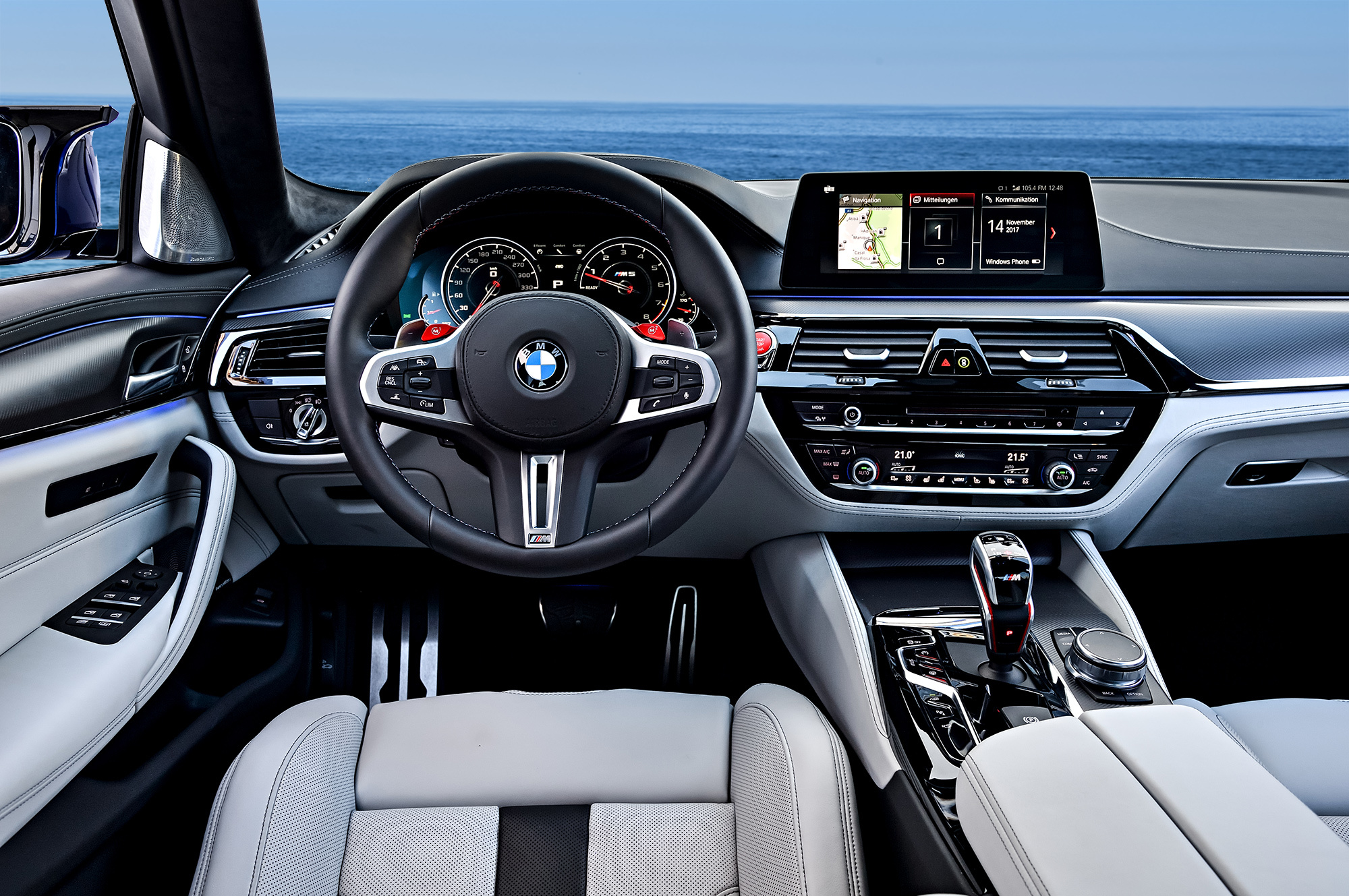 Но в остальном — счастье. В водительских ощущениях M5 не стала цифровой, а осталась аналоговой. Пожурить можно разве что рулевое управление, которое могло быть поострее и щедрее на реактивное действие. Однако передача крутящего момента на передние колёса его не портит. Немцы утверждают, что восьмиступенчатый «автомат» переключается быстрее, чем прежний робот DCT, хотя точных данных не дают. Спортрежима как такового нет, на выбор — три программы смены передач. В базовой — коробка просто паинька, хотя гидротрансформатор блокируется «навсегда» сразу после старта. Даже при работе по самому экстремальному алгоритму переключения остаются сглаженными.