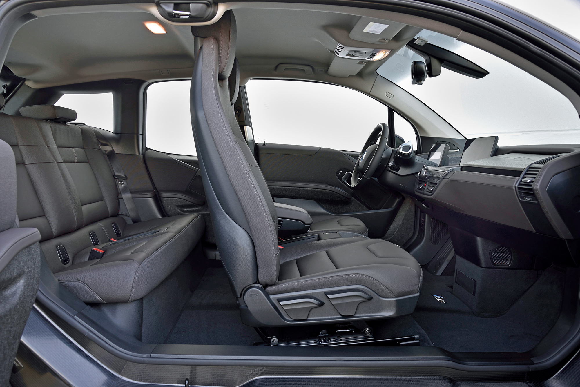 Но это будут приятные километры. Салон, не отличаясь от обычного i3, даёт то же чувство воздушности и простора. Большинство видимых салонных материалов сделано из «переработки», что уводит от нелестного сравнения с мягким пластиком, но импонирует целевой «зелёной» аудитории. Зато дерево и кожа на панели ― «первичные», настоящие. Крыша высоко, три пассажира ― далеко по углам, и каждому из них вольготно. На плоском креслице восседаешь, как на троне, двухспицевый руль ложится в руки, будто родной. Массивный флажок селектора направления движения, громоздящийся справа, ― от себя. Даю газ, то есть ток.
