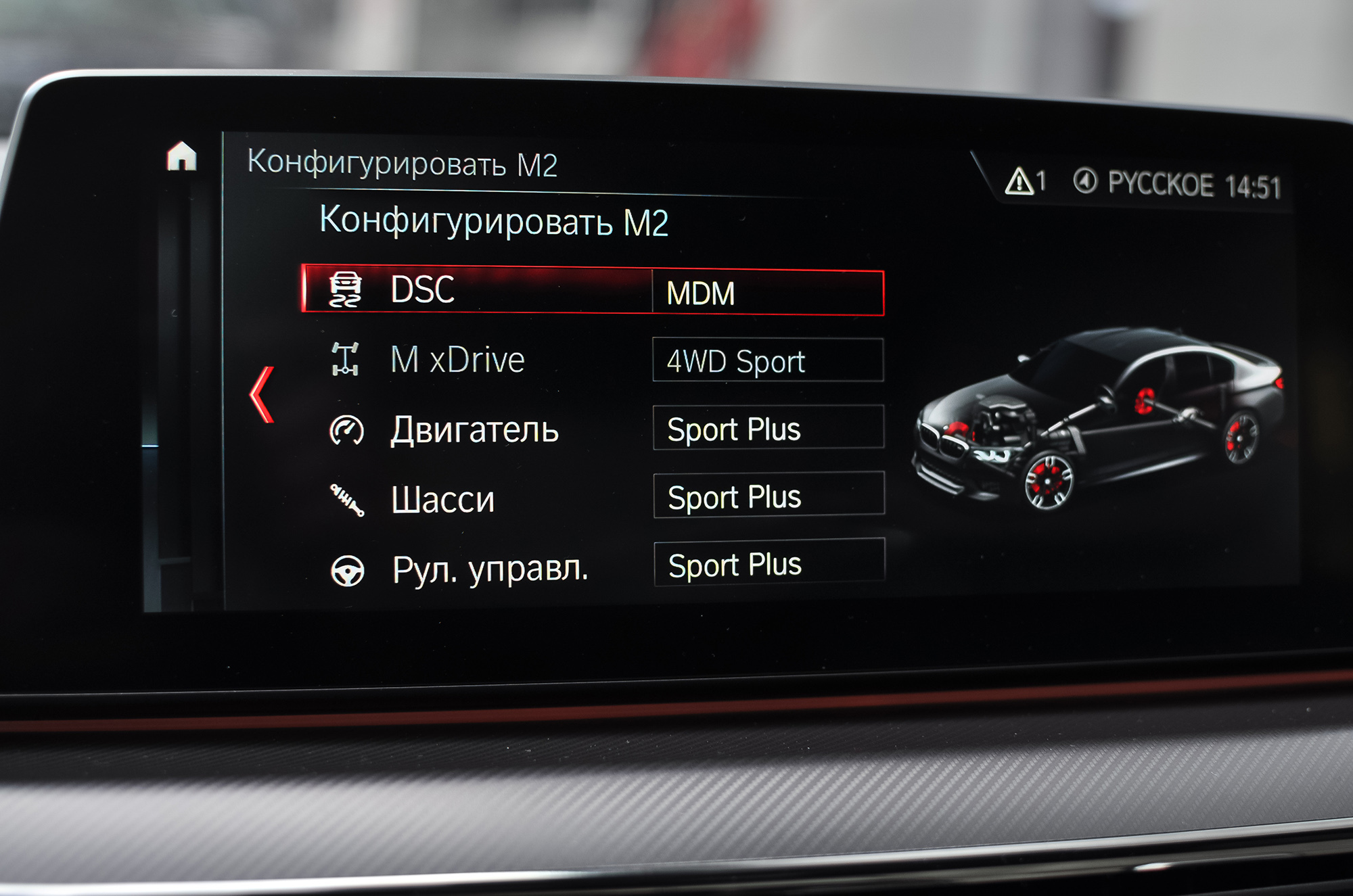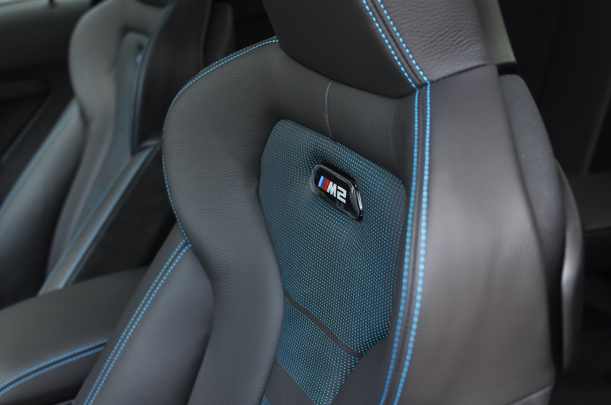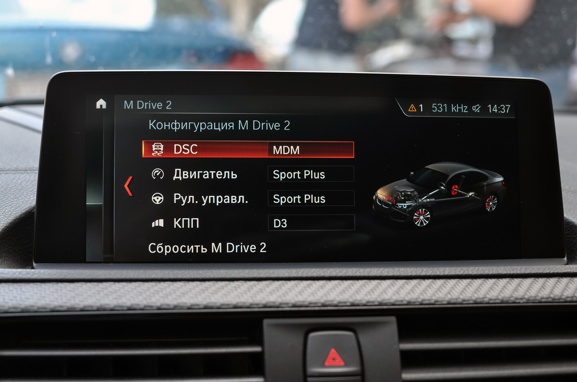 Чёрная кнопка запуска двигателя стала красной. Аналоговая приборная панель заменена дисплеем. На руле наконец-то появились кнопки M1 и M2 для быстрого вызова сохранённых ездовых настроек. Гражданские сиденья заменены теми, что используются в M4, но установлены они по-старому, так что посадка в M2 всё равно заметно выше. Чувствуешь себя этаким дакаровским гонщиком. Из-за нехватки боковой поддержки в поворотах приходится цепляться за руль сильнее, чем следует.