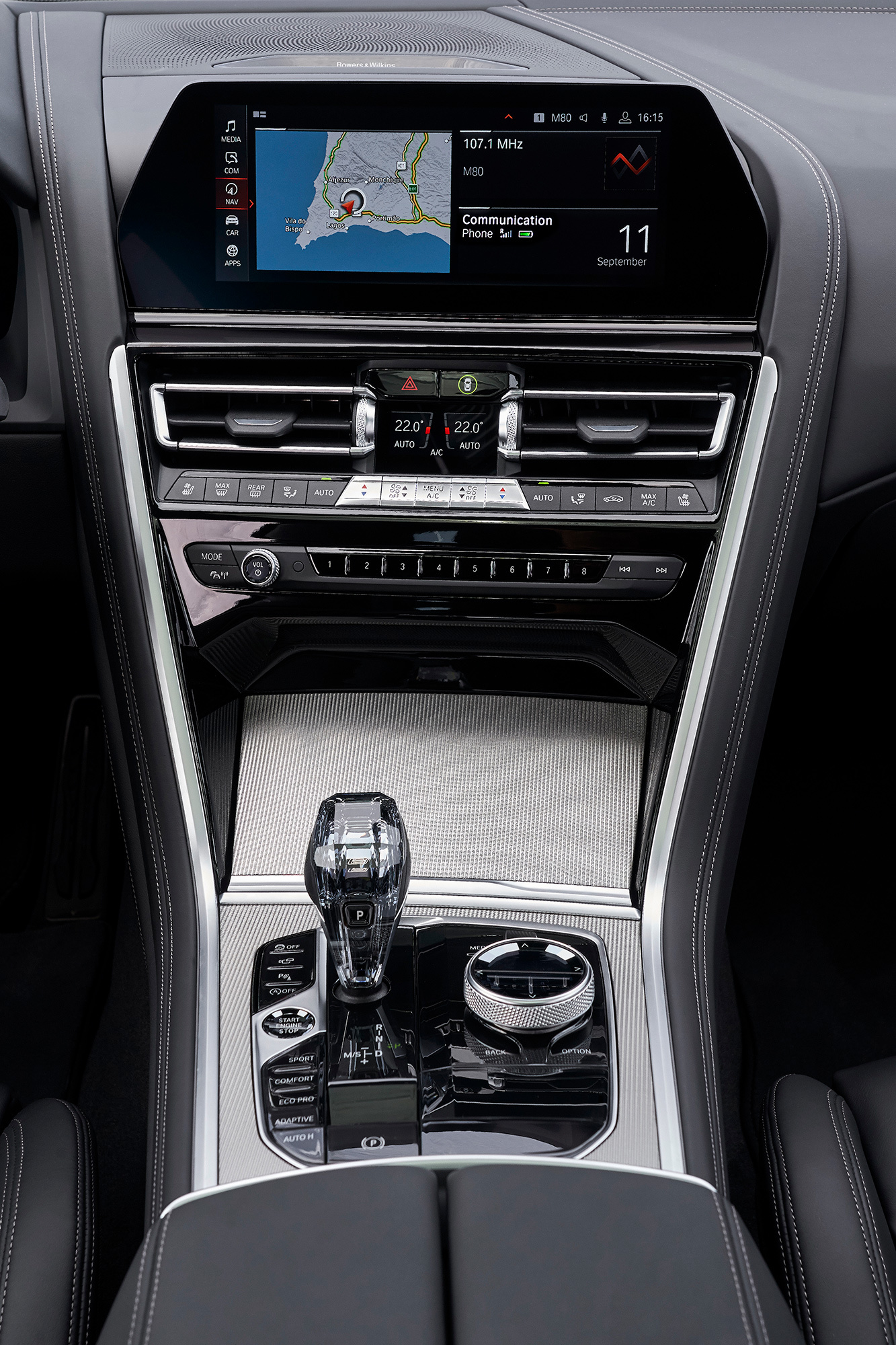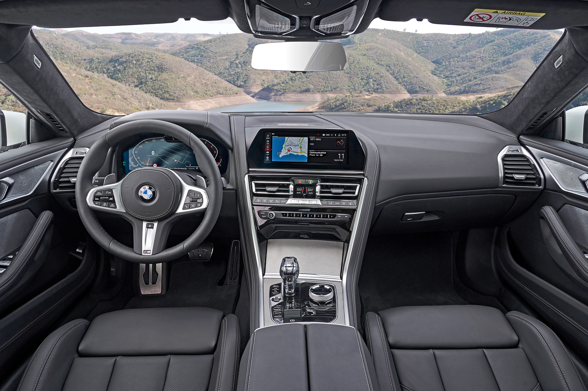 За рулём не ощущаешь купейной зажатости. Более вертикальные передние стойки остались толстыми, но уже не маячат прямо у виска. Крыша расположена на шесть сантиметров выше, потолок не давит. Правда, в среднее зеркало мало что видно, потому что багажник очень высок. Тестовая версия 840i снабжена опционными жестковатыми сиденьями M Sport с зажатой боковой поддержкой, регулируемой лишь на спинке. Лично я бы предпочёл более свободные штатные кресла. Они не должны сильно отличаться от сидений купе, понравившихся во время московского теста.