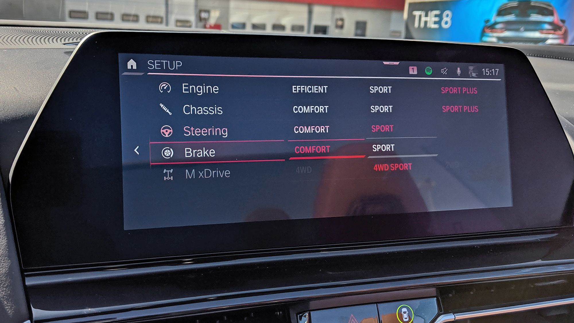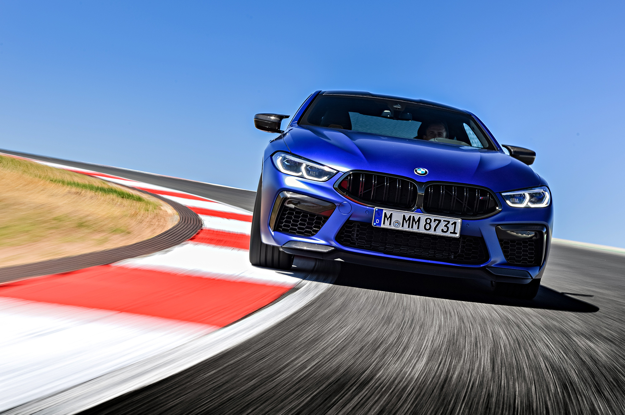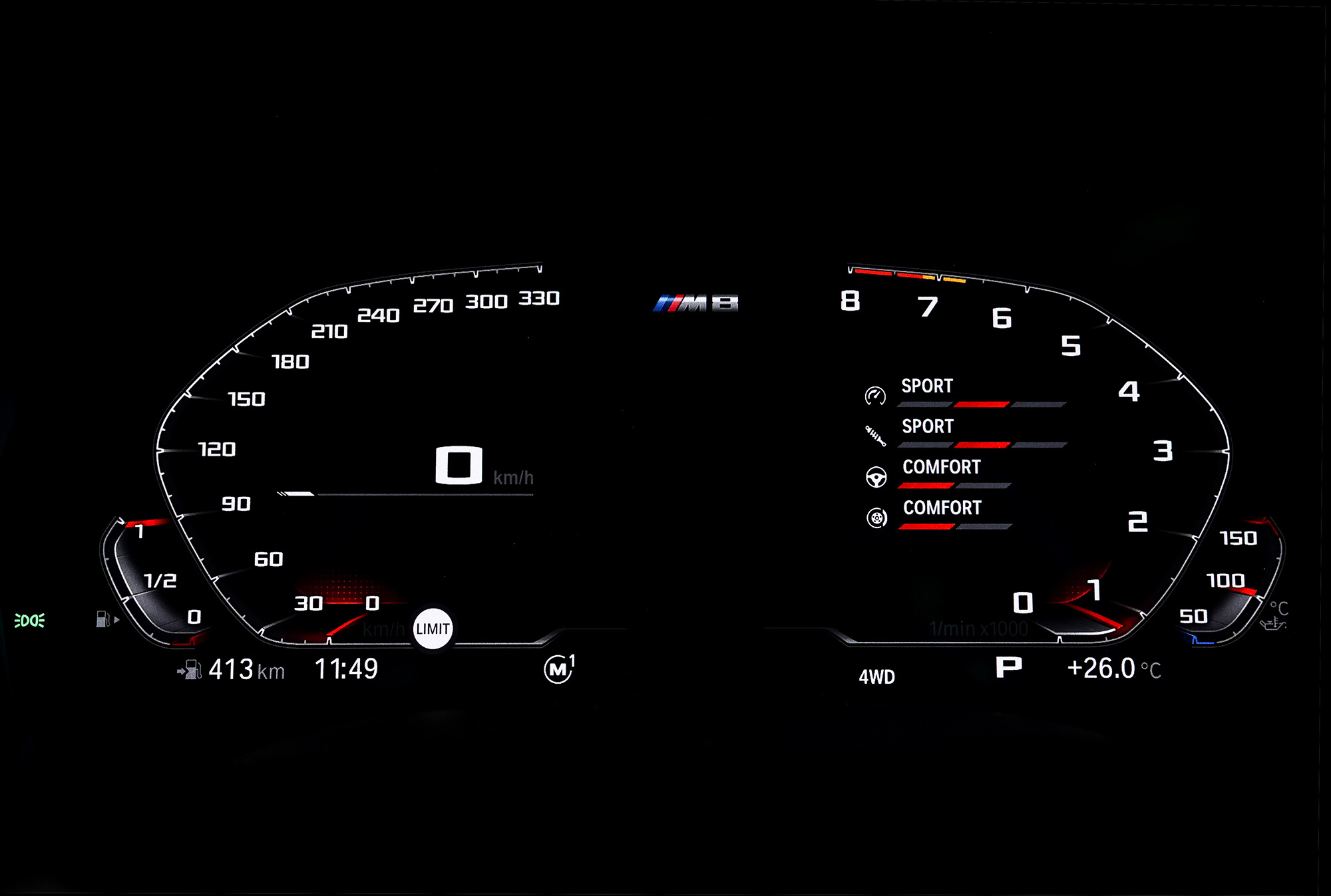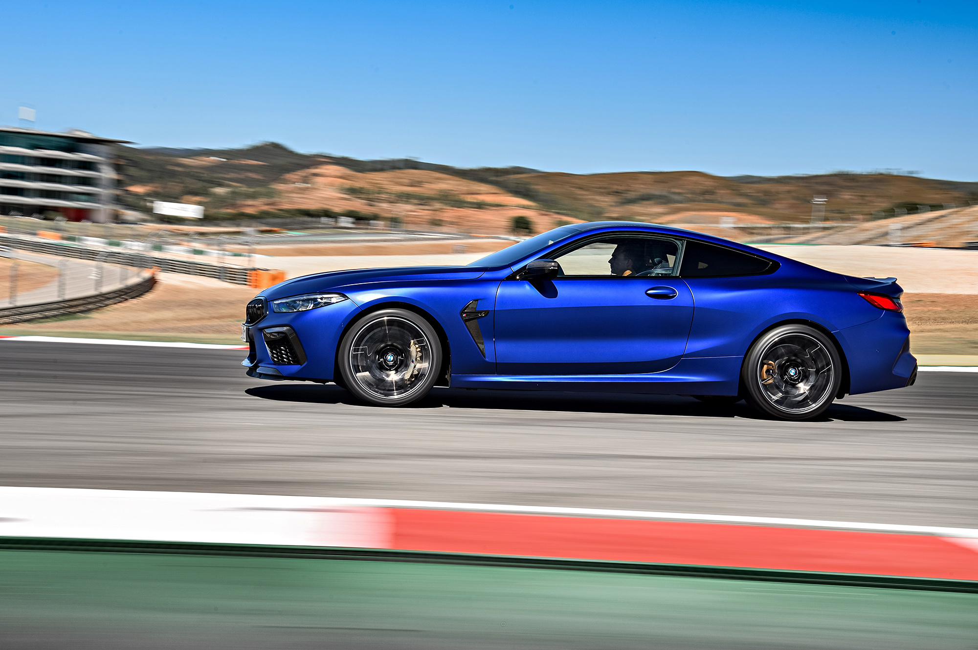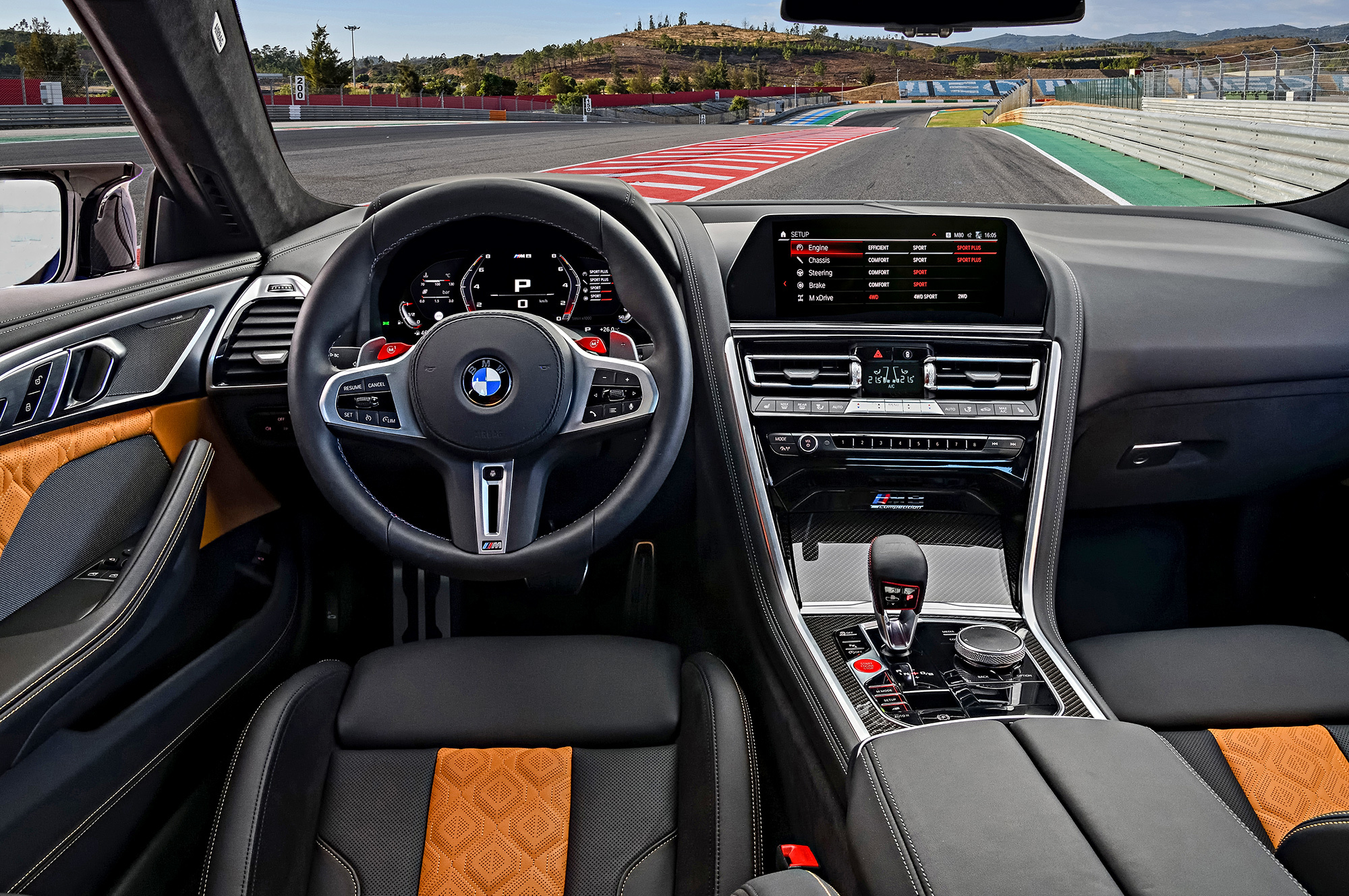 Конечно, как в любой нынешней «эмке», есть и программируемые гашетки М1 и М2 на руле. Для выбора и утверждения заданных настроек их надо нажимать дважды. На тестовых купе M8 Competition под пресетом M1 сохранено сочетание «трекового» режима MDM для системы стабилизации и алгоритма 4WD Sport для полного привода, где тяговый приоритет отдаётся задней оси. Первые круги по гоночной трассе Алгарве получаются весёлыми, но не очень правильными. На выходах из поворотов при интенсивном разгоне «эмка» норовит уйти в занос. Используя мощнейший зацеп покрышек Pirelli PZero, двигаешься всё равно быстро, но малоэффективно.