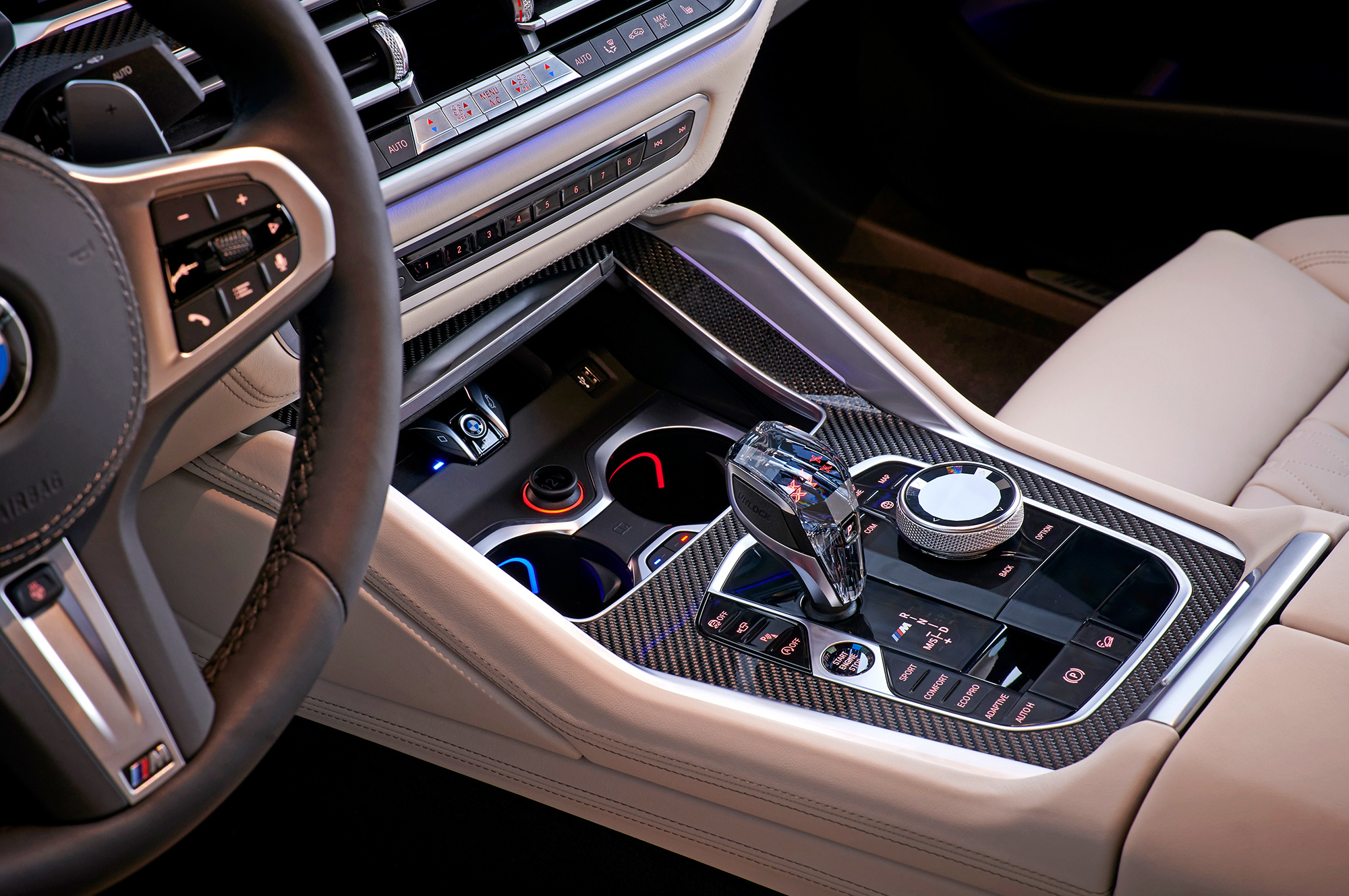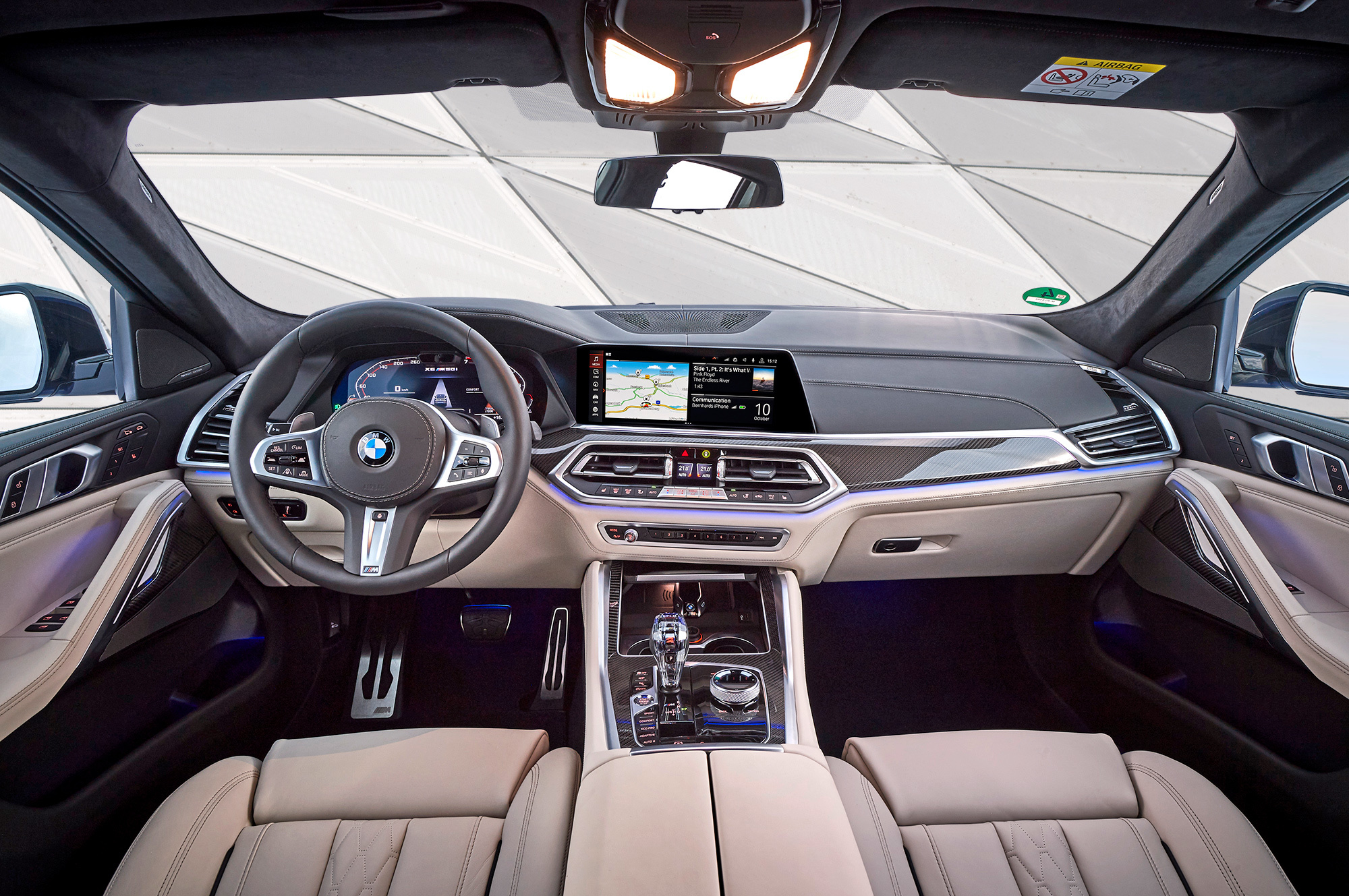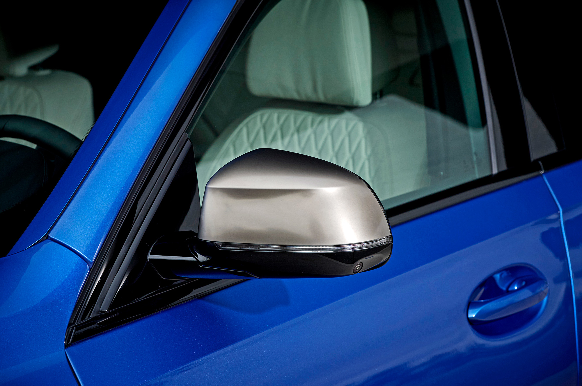 Все тестовые машины на презентации в Мюнхене одинаковы — это 530-сильные хэтчбеки M50i синего цвета Riverside Blue с колёсами диаметром 21 дюйм. Точь-в-точь как на фирменных фотографиях. Таких версий прежде не было: максимально возможная «не эмка» с V8 — xDrive50i — была на 80 сил слабее и на полсекунды медленнее набирала сотню. Прибавив в динамике, M50i осталась при гражданских настройках. В городе отмечаю основательную развязку от внешних шумов. Благодаря многослойным передним стёклам (опция за 51 тысячу) снаружи почти ничего не слышно, что особенно хорошо заметно на светофорах, когда система start/stop глушит битурбовосьмёрку 4.4.