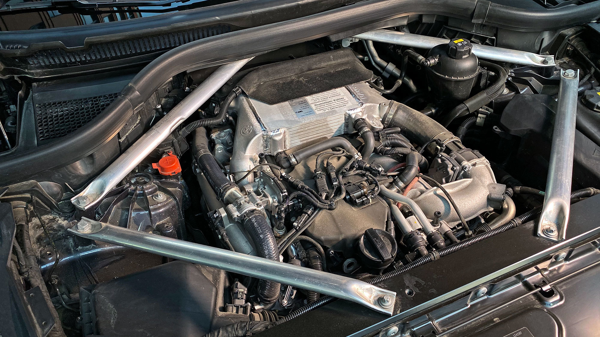 Это моё первое личное знакомство с X6, и он приятно удивляет многогранностью. В нём как бы заключены две сущности. Одна плавная, предельно простая в управлении, боящаяся только больших колдобин. Другая — тугая, как рывок с лонча, и навязчивая, как синтетический баритон двигателя из динамиков. Едешь не спеша на паре маленьких нагнетателей — отдыхаешь. Несёшься на больших, высокого давления — выкладываешься.
