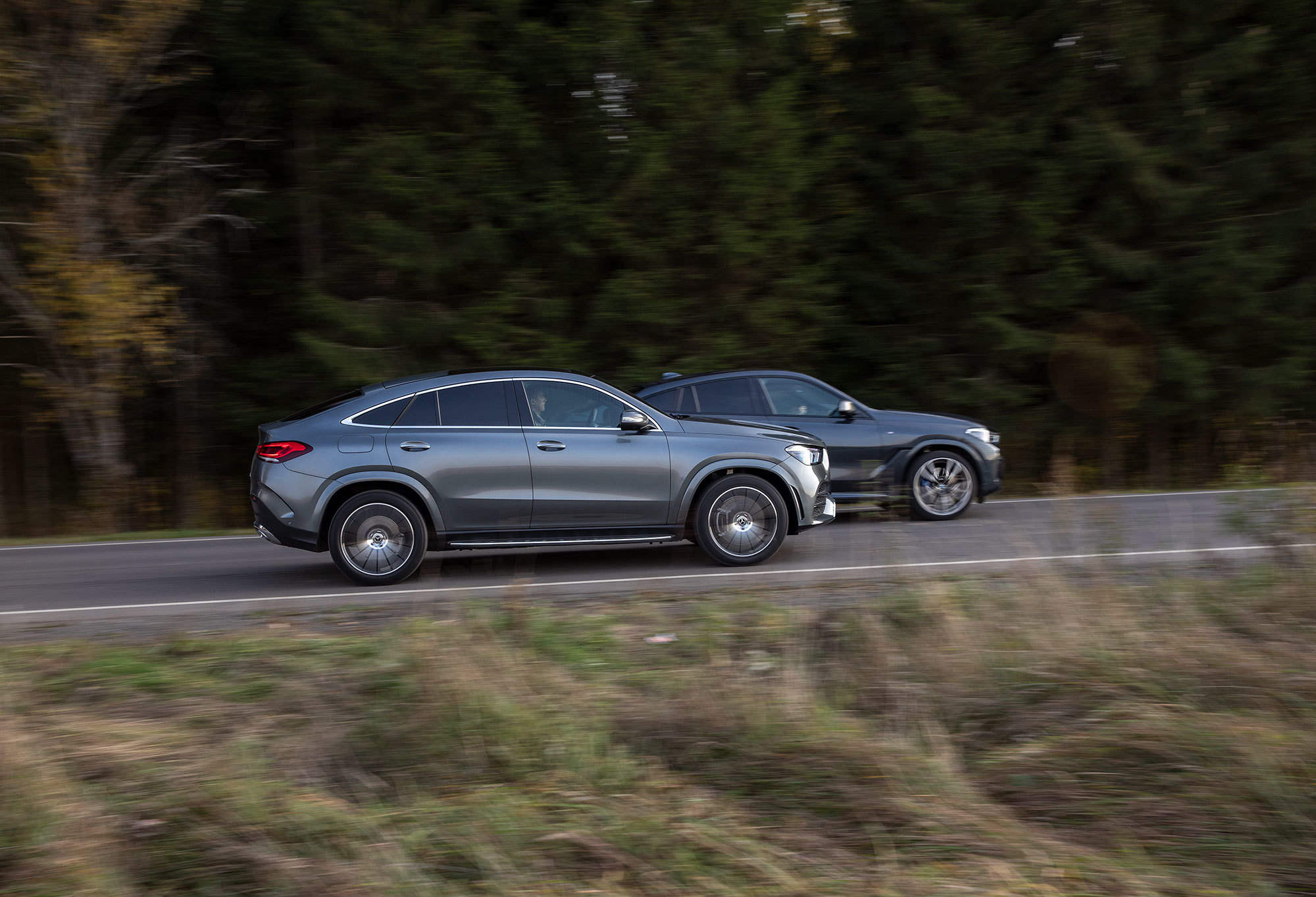 В качестве компенсации за невысокий уровень комфорта тут лёгкий руль, большие экраны и красивый интерфейс. Салон GLE не сужается сразу за средней стойкой, места сзади побольше: что на диване, что в багажнике. Вдобавок Бенц нейтрален внешне. Так мог бы выглядеть X6 в расслабленном режиме «Комфорт». До того как выдохнул, выпятил рёбра жёсткости, оскалил зубы, пригнул голову и помчал. У дизайнеров Мерседеса получился основательный образ, хотя грузноватый и чересчур безобидный.