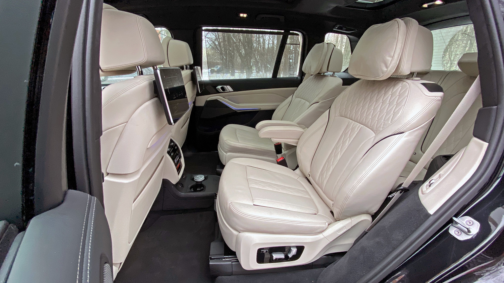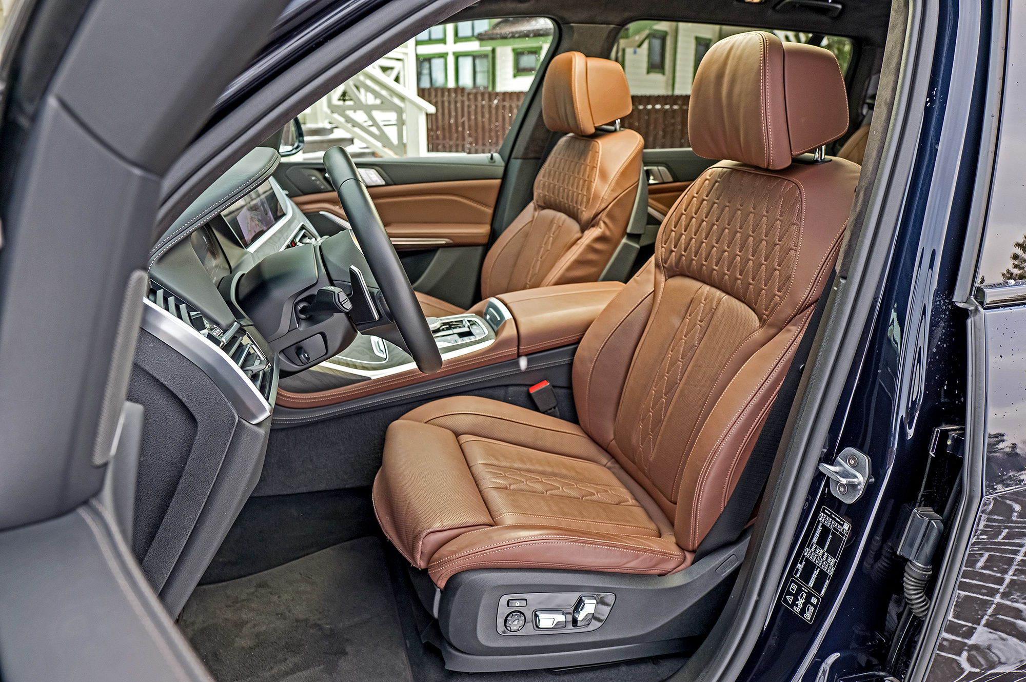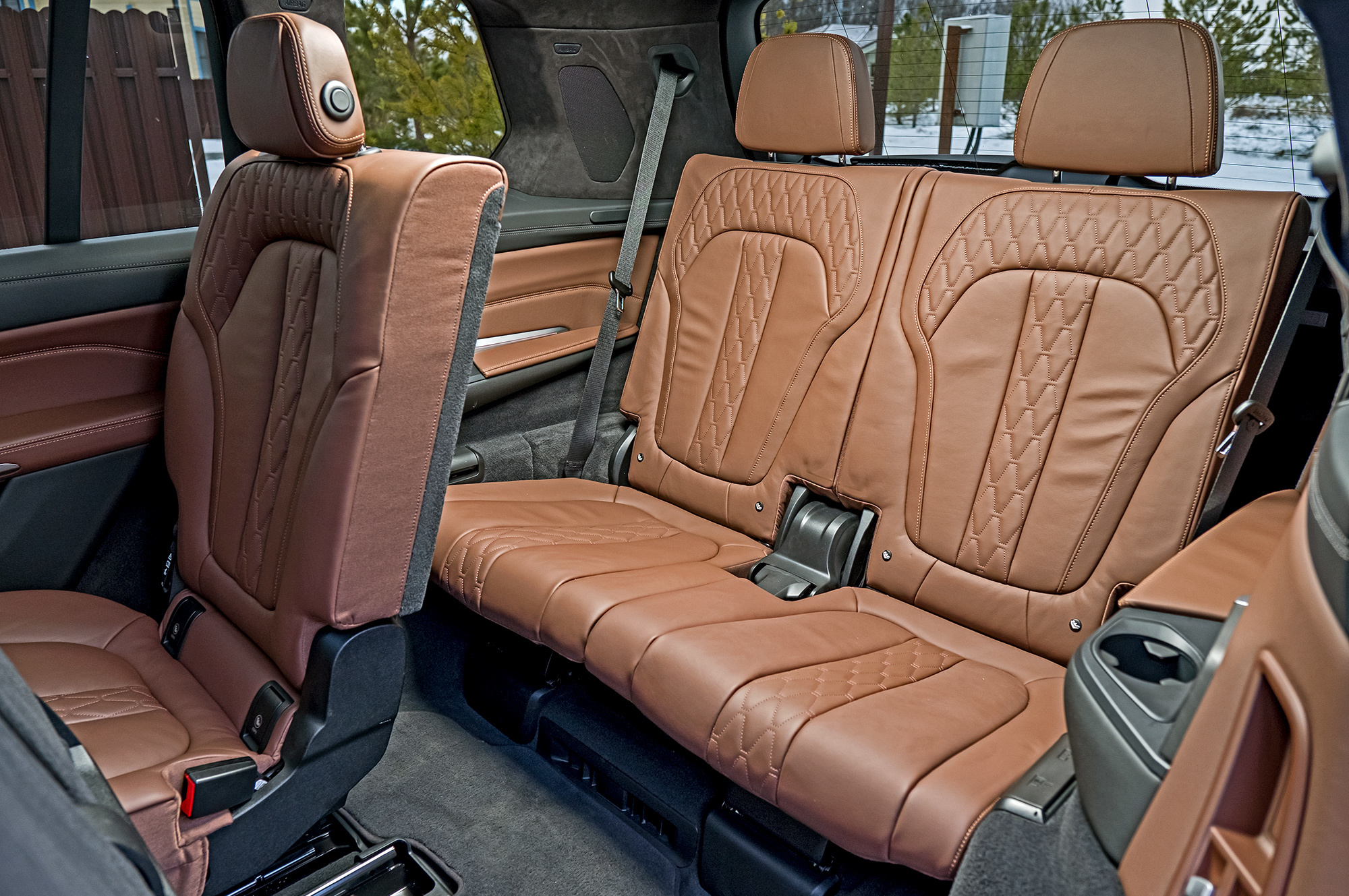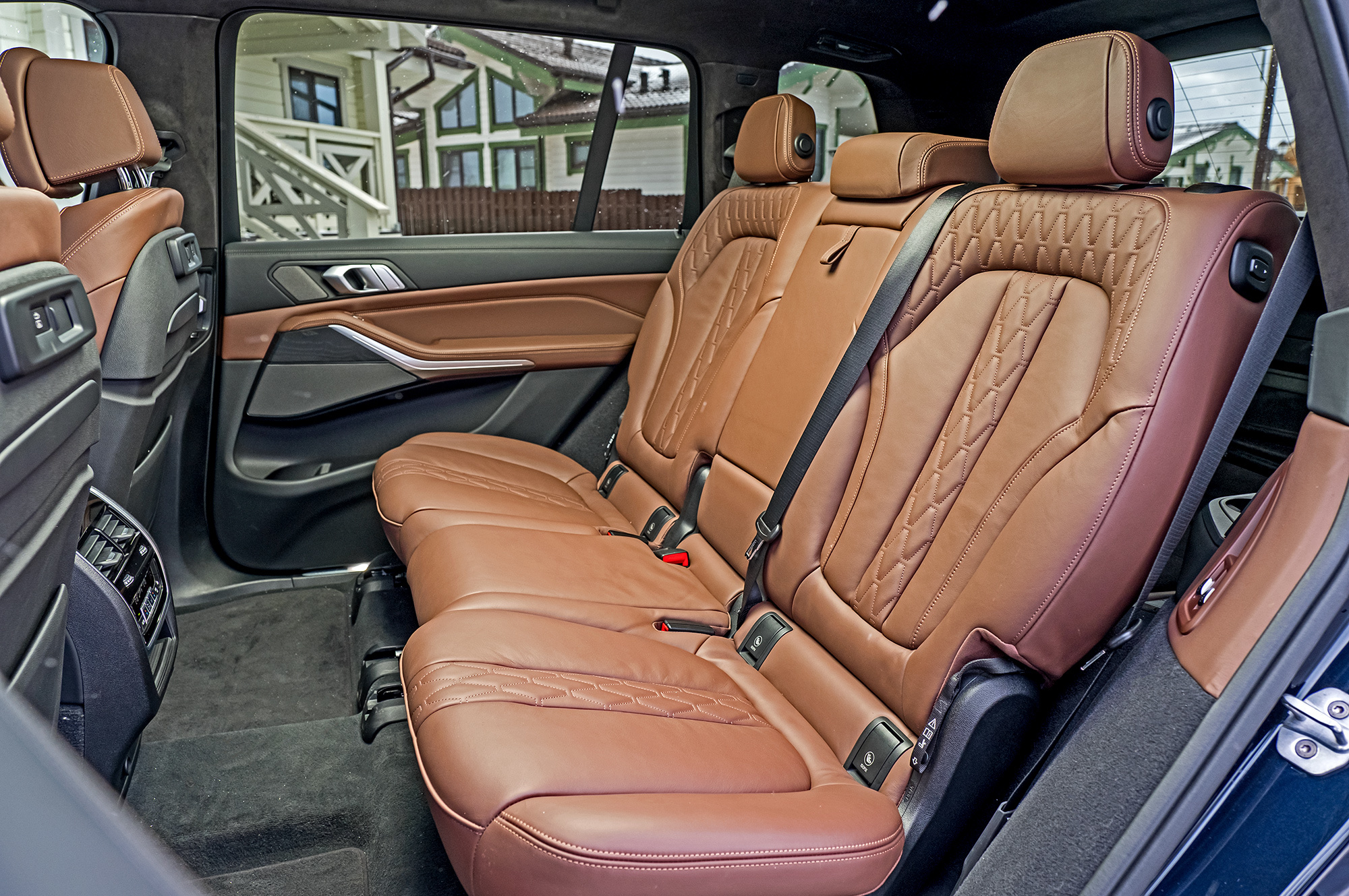 А что в нём такого? Во-первых, задний ряд повышенной комфортности с кучей электроприводов, оттоманкой и массивным моторизованным подлокотником, отгораживающим пассажиров друг от друга. Раздельные кресла второго ряда можно заказать и в BMW (доплатив 72 400 рублей или выбрав исполнение Exclusive), но они не будут такими уютными, хотя сто́ят действительно отдельно. Проверено: у нас побывала и такая версия.