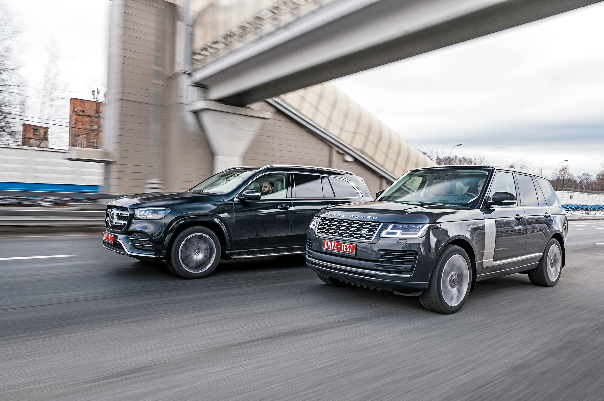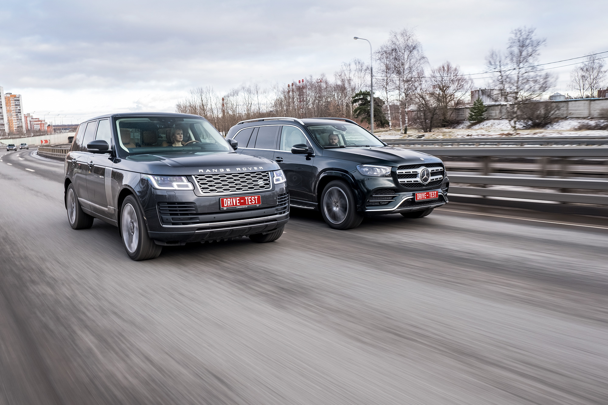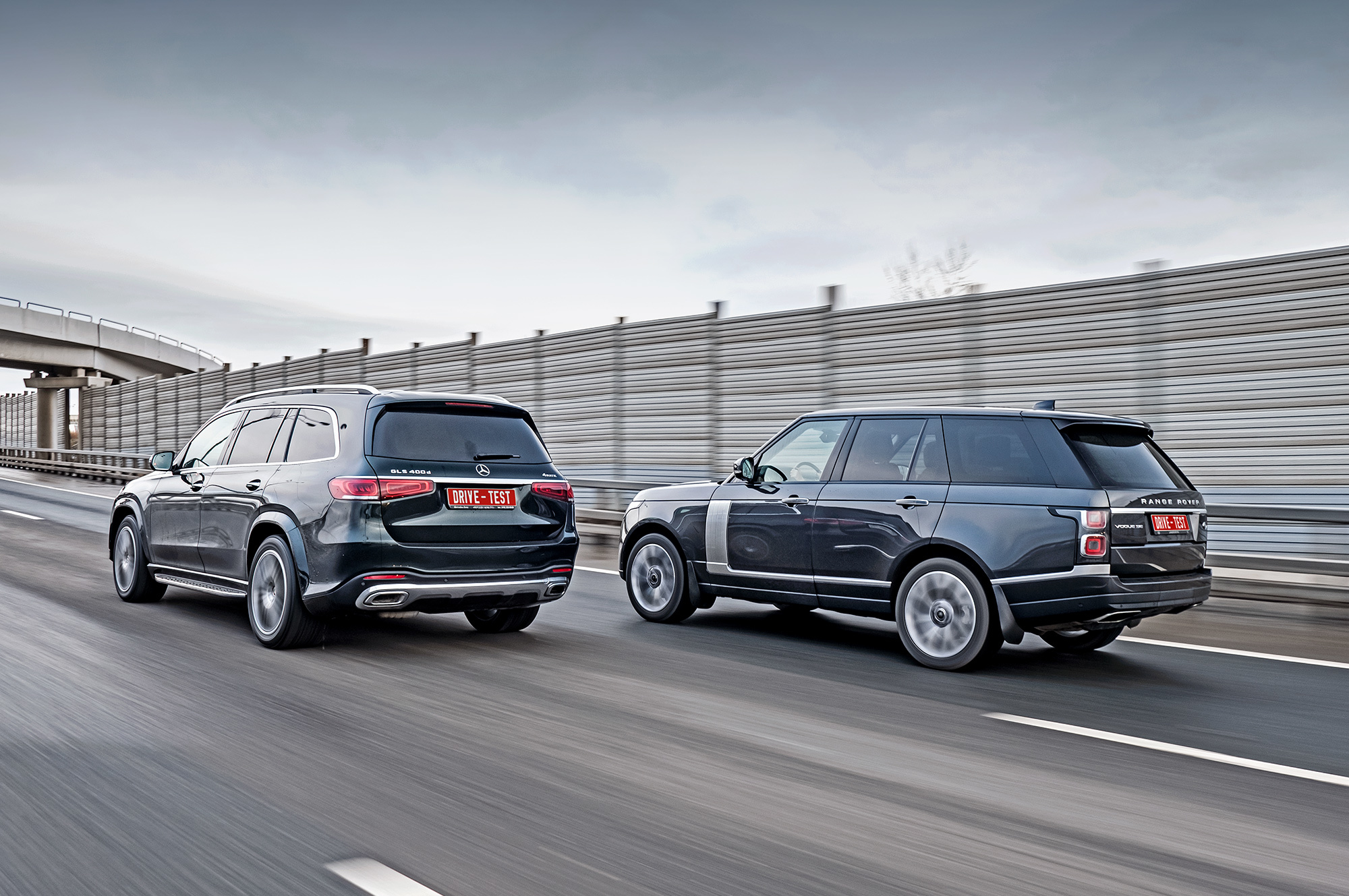 В том числе свобода выбора дороги. Только Vogue в нашей классификации относится к внедорожникам, несмотря на несущий кузов. Здесь помимо общей для участников теста пневмы есть понижающая передача и электронноуправляемые блокировки двух дифференциалов. А эти ходы подвесок! Впрочем, я забегаю вперёд... Даже в зеркале заднего вида Range Rover смотрится наиболее представительно. Его ни с чем не спутаешь. А новый GLS в общих чертах изрядно смахивает на младший GLE, хотя решётка и оптика у флагмана свои.
