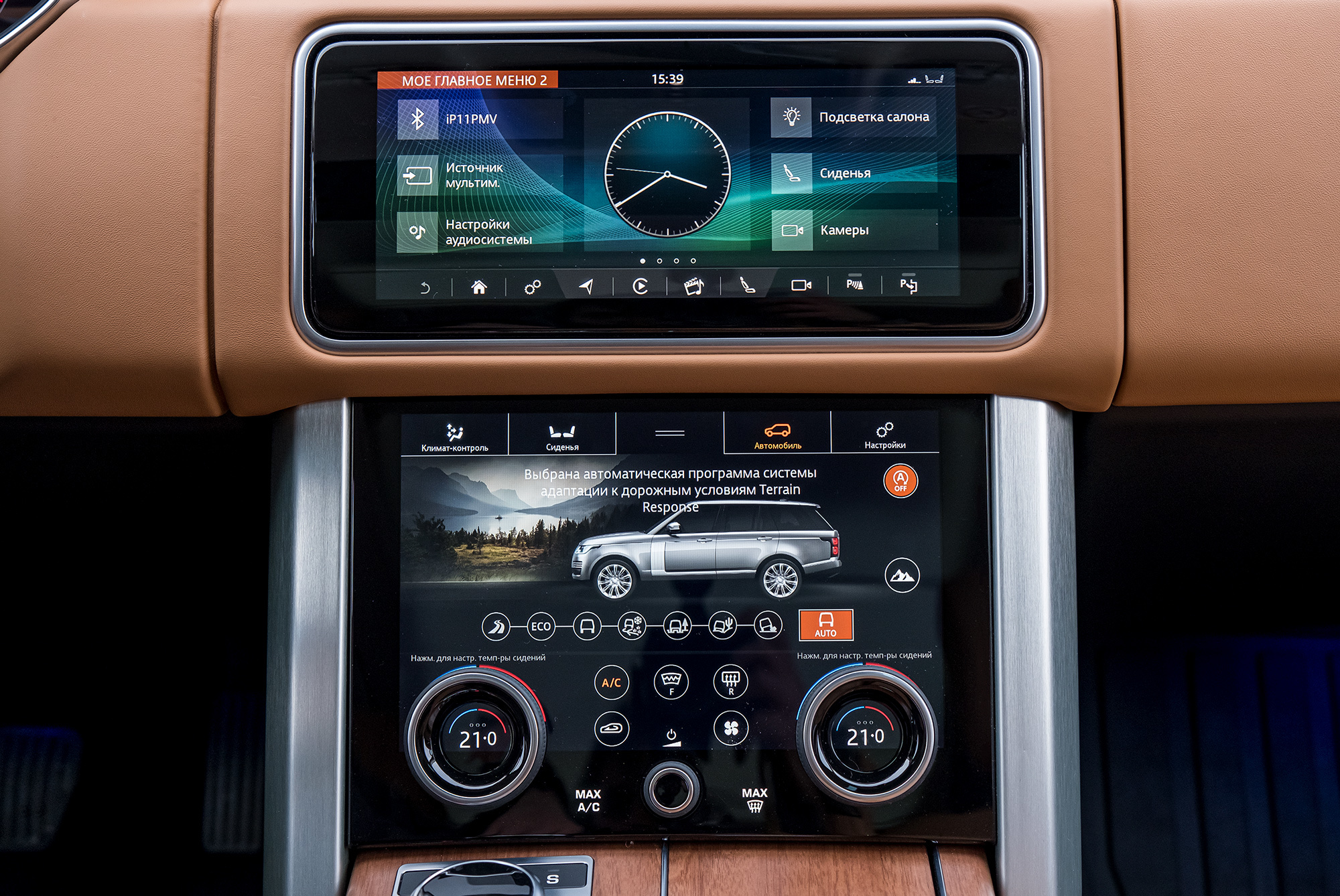 Информационно-развлекательный комплекс Рейнджа теперь унифицирован с Веларом. Все экраны управляются единственным процессором, и два сенсорных ощутимо подтормаживают. Mercedes и BMW себе такого не позволяют. Диагональ основного тачскрина на пару дюймов меньше, чем у «немцев», но это напрягает лишь при работе камер кругового обзора: приходится вглядываться в происходящее на мониторе...