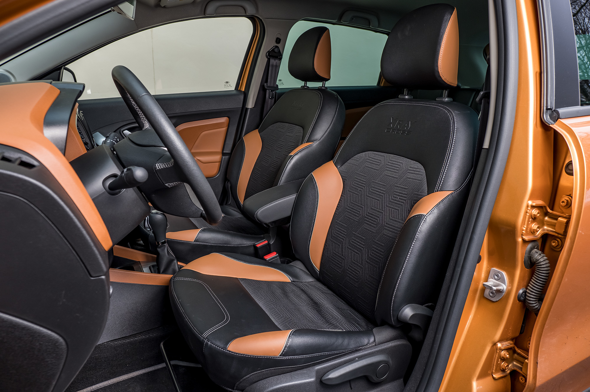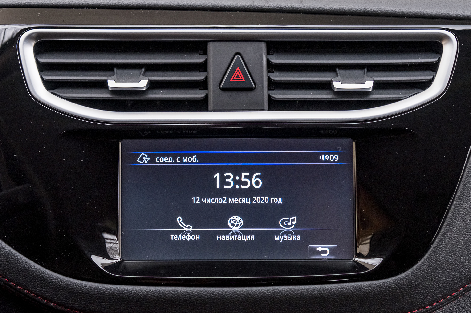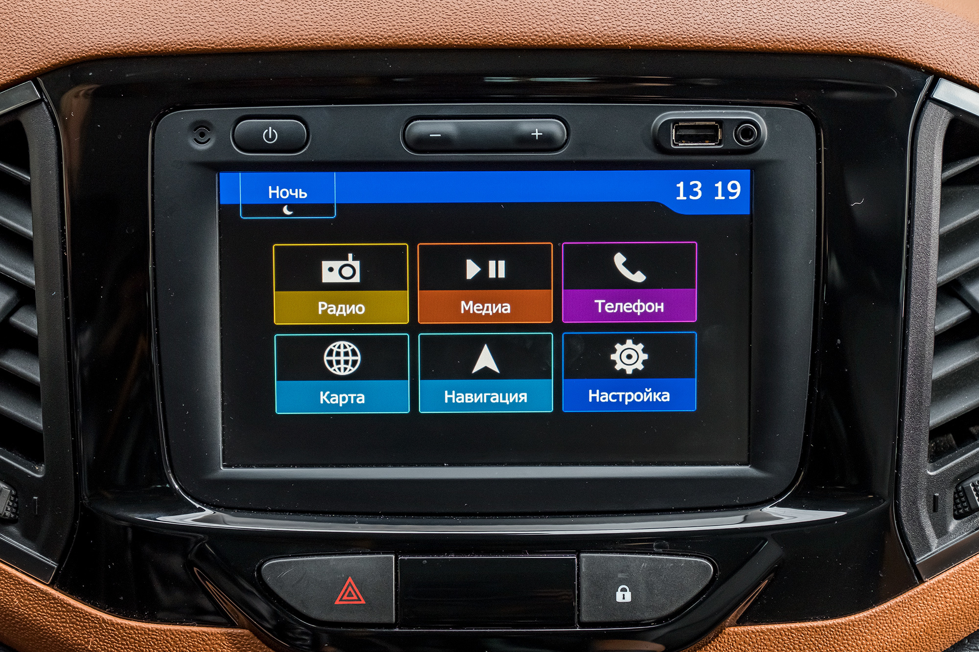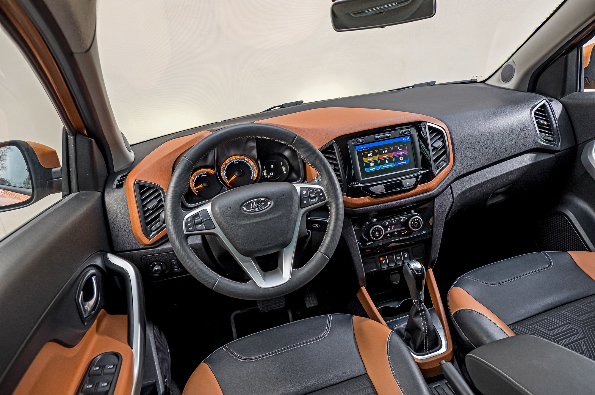 Салон в первом приближении неплох. Панель отделана кожзамом и приправлена модным чёрным глянцем, кнопки крупны. При этом блик от блестящей рамки центрального дисплея бьёт прямо в глаза водителя, а руль отодвинут от него и регулируется только по высоте. Центральные дефлекторы не закрываются. Кнопки подогрева передних сидений спрятаны под ручником, а индикаторы включения в них бледнее некуда. Зато задние места в отсутствие центрального тоннеля куда просторнее вазовских и нормально вмещают не только нашу эталонную Настю, но и габаритных мужиков.
