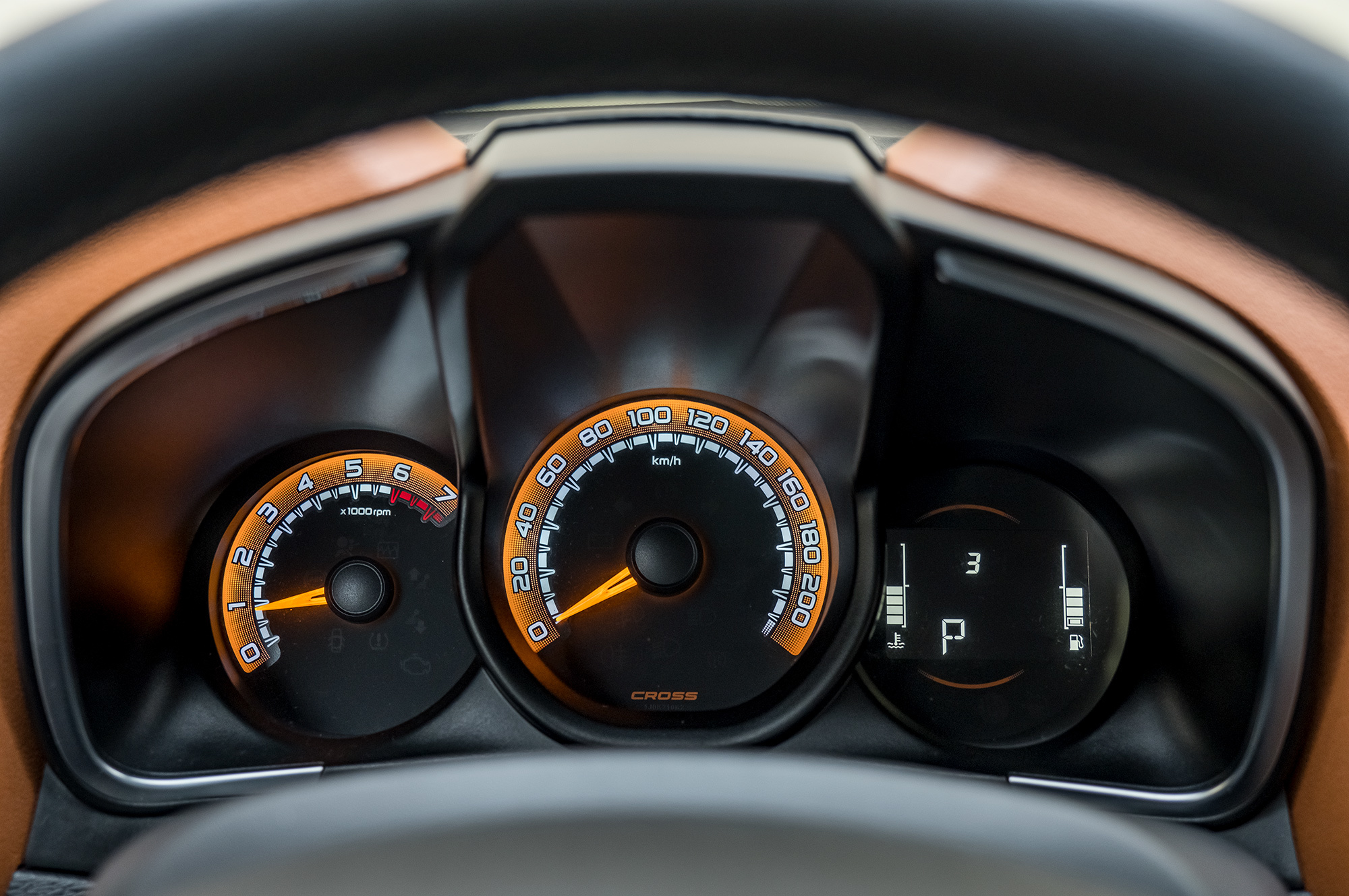 Весьма мягкие и спокойные реакции Лады на руль и подачу топлива не подстёгивают ездить быстро. Педаль тормоза — так вообще неожиданно длинноходна и вязковата. Выхожу проверить, точно ли здесь сзади диски, а не барабаны, как у Sandero. Управление тягой адекватнее, чем в V3, а предельный разгон немного бодрее. Вариатор не увлекается имитацией ступенчатых переключений. Мешают неоднозначные отклики на газ в пробочных режимах. При ускорениях до 20–30 км/ч, чередуемых остановками, Xray Cross то ленив, то вдруг бросается вперёд аж с рывком. Но в целом силовой агрегат всё же поинтереснее, чем у конкурента.
