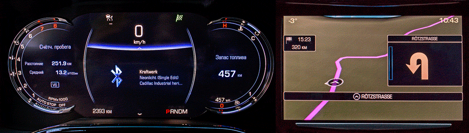 Мультимедийная система CUE, Cadillac User Experience, с восьмидюймовым сенсорным экраном теперь поддерживает Apple CarPlay и Android Auto, камеры объединены в систему кругового обзора, но принципиально «экспириенс» не поменялся. Как и на Эскалейде, отклик «вздрагивающих» при касании сенсорных клавиш неоднозначен. Моргнёшь аварийкой в благодарность кому-то, а выключишь только с третьей попытки — это отвлекает. Да и в целом место водителя не кажется гостеприимным: верхняя часть спинки давит на лопатки, заставляя горбиться, руль с острыми в месте хвата спицами развёрнут к окну.