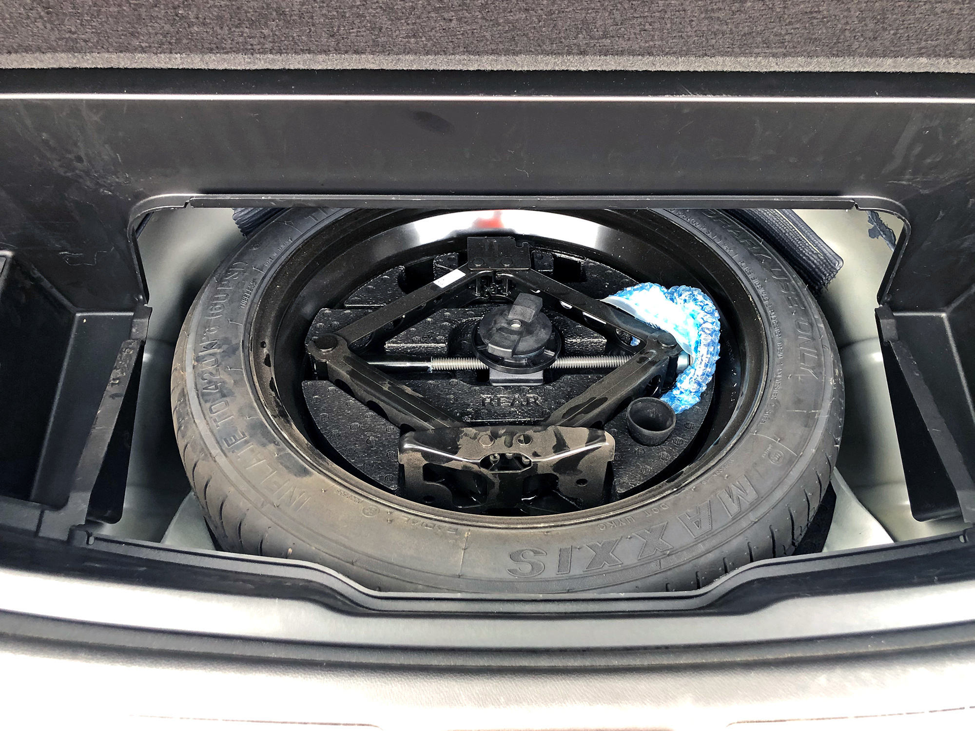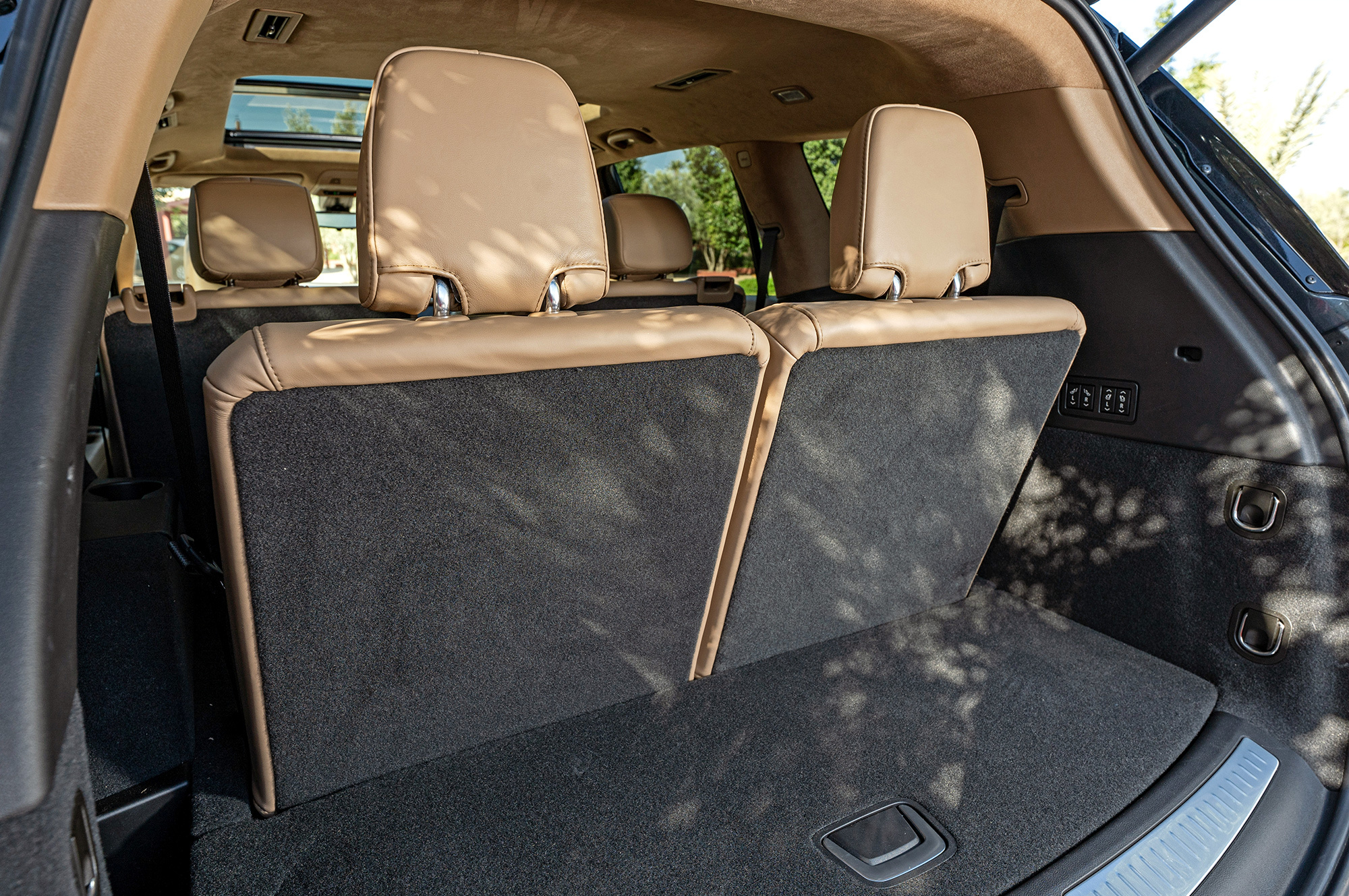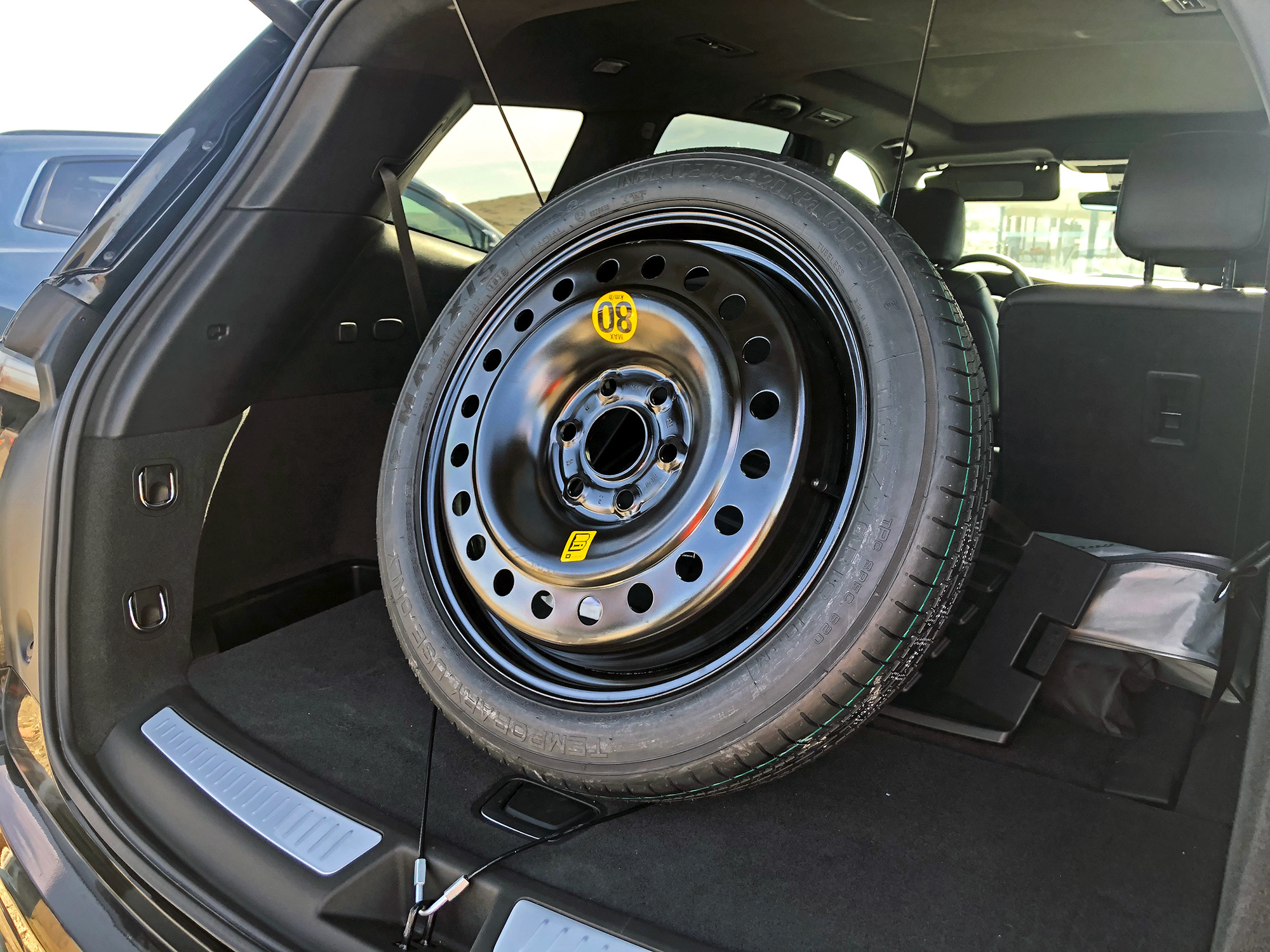 Крышка просторного багажника оснащена электроприводом со взмаховым датчиком, но внутри отсека нет никаких приспособлений для фиксации груза. Третий ряд складывается и раскладывается автоматически, а второй можно только разложить дистанционно. Спинки образуют ровный пол. Ближе к пятой двери предусмотрен отсек, где можно спрятать шторку. Ещё глубже, под съёмным лотком рядом с запаской, обитает съёмный фаркоп, также включённый в стандартную комплектацию.