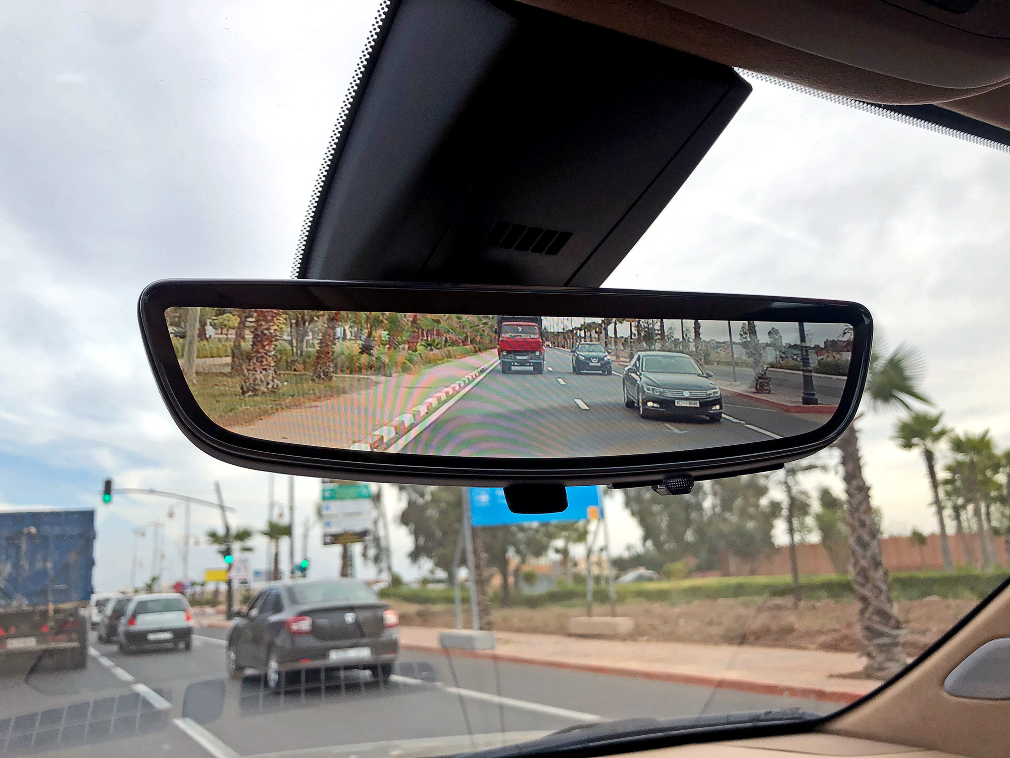 Если сложены все задние подголовники, то в салонное зеркало видно дорогу. Однако для трёхрядной машины вполне уместен и его цифровой режим, когда отражение уступает место картинке с камеры. Запас её разрешения позволяет слегка подстроить высоту и угол обзора. Картинка нравится, хотя и требует перефокусировки взгляда, а следовательно — привычки. Вдобавок корпус и зеркало сильно греются в процессе. Зато отражающий элемент можно держать направленным на задний ряд и, выключая камеру, наблюдать за пассажирами. Родители оценят.