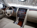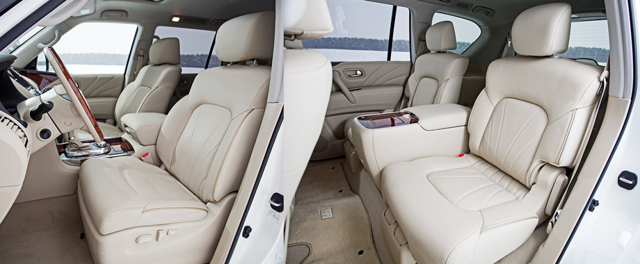 В салоне Infiniti просторнее, но оказавшись в этом кожано-деревянно-пластиковом интерьере после Кадиллака, хочется уточнить, не Nissan ли это Patrol, — настолько простым и нелюксовым воспринимается QX80 образца 2014 года. Примитивная графика центрального дисплея, посеребрённые кнопки руля всех мастей и размеров, незамысловатые приборы — и отчетливо прощупывающиеся края деревянного ободка. Крошку-рукоятку подогрева сидений в таком огромном салоне ещё попробуй найди, а обогрев руля хоть и включается крупной кнопкой, в отличие от кадиллаковского греет только тыльную сторону обода. Кресло с короткой подушкой — скользкое и бесформенное.