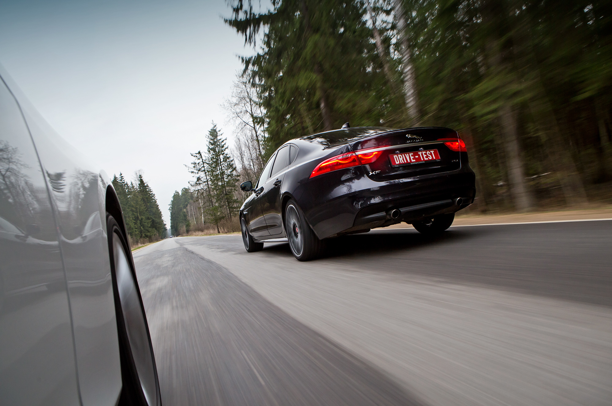 У Ягуара покрышки обычные, но аж 20-дюймовые. Выглядит седан красиво, но едет в том числе из-за подвески R-sport жестковато — хотя всё равно предпочтительнее, чем Cadillac. Британский седан не различает микропрофиля полотна, упруго проезжает средние неровности и потряхивает пассажиров только на крупных и острых. С энергоёмкостью тут порядок. Смущает лишь излишняя разговорчивость передней подвески на выбоинах и неважная шумоизоляция салона в целом. В этих областях от Ягуара ждёшь большего.