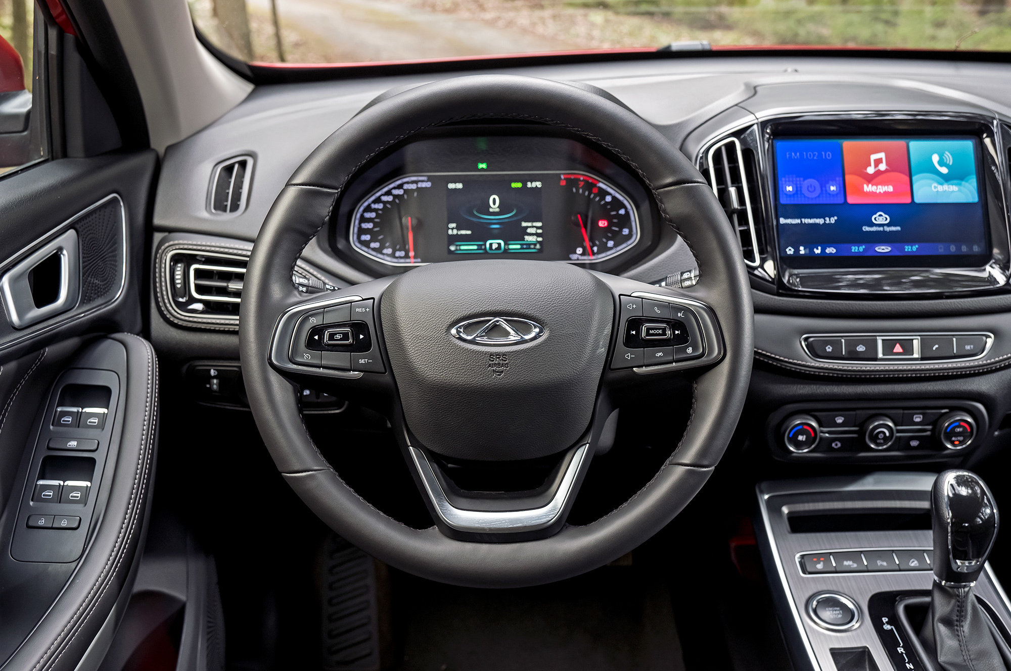 У Tiggo есть система кругового обзора с функцией контроля слепых зон в районе передних колёс. Камеры в корпусах зеркал активируются при включении поворотника. Неплохое подспорье при маневрировании на тесных парковках, даже несмотря на посредственное качество картинки. Кроме того, в тёмное время суток при отклонении руля задействуется дополнительная подсветка поворотов. Причём вспыхивают обе противотуманки разом, охватывая весь сектор перед капотом.