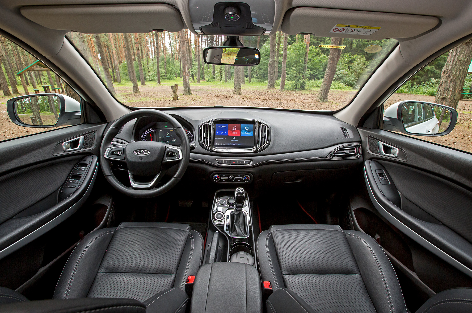 Интерьер простоват, но не противен. Водительское кресло в топ-версии Elite обтянуто перфорированной кожей (скорее кожзамом — уж очень он жаркий) и электрифицировано. Диапазоны перемещений позволяют быстро найти приемлемую посадку даже в отсутствие регулировки руля по вылету. Диаметр и сечение баранки оптимальны. Она обшита приятной кожей, весь обод греется. Подогревом также оснащены зеркала, передние и задние сиденья, а также лобовое стекло. Российское представительство Chery видит в этом свою заслугу.