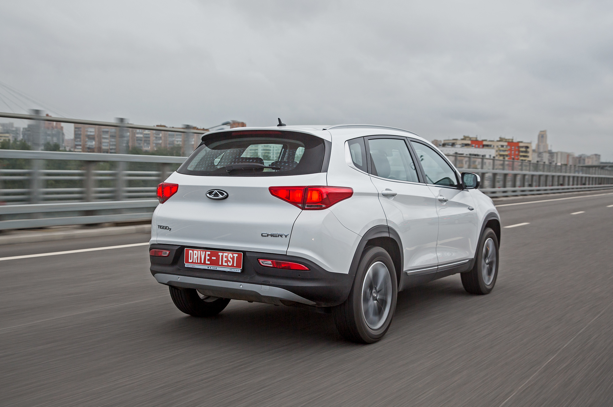 Внешне «семёрка», мне, пожалуй, нравится. Крупные колёса диаметром 18 дюймов, небольшие свесы кузова, практичная юбочка из некрашеного пластика — на первый взгляд, всё неплохо. Однако при заявленном дорожном просвете 190 мм под пластиковой защитой картера я намерил на пару сантиметров меньше. Лампа, проецирующая название модели на асфальт, вмонтирована в нижнюю кромку двери. При открытии световое пятно из слов Tiggo появляется на земле внезапно, словно что-то выскакивает из-под машины под ноги: то ли кошка, то ли крыса.